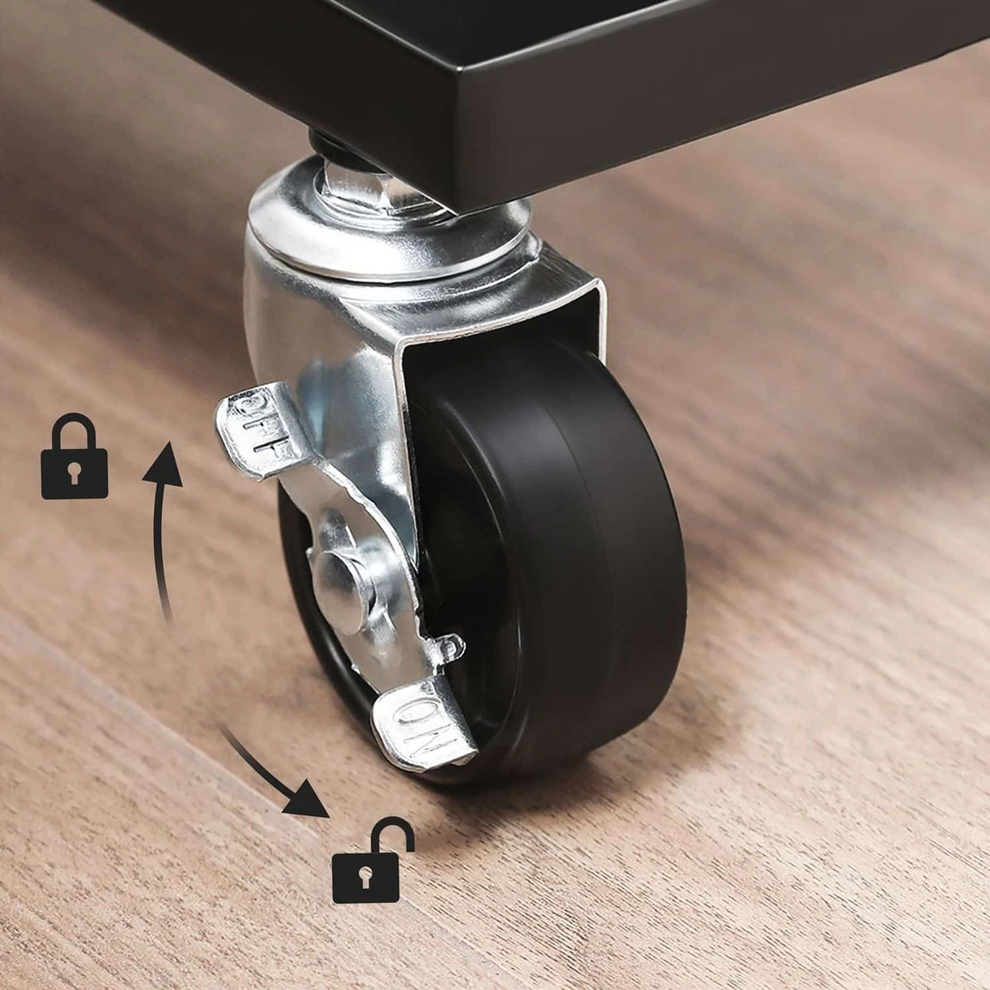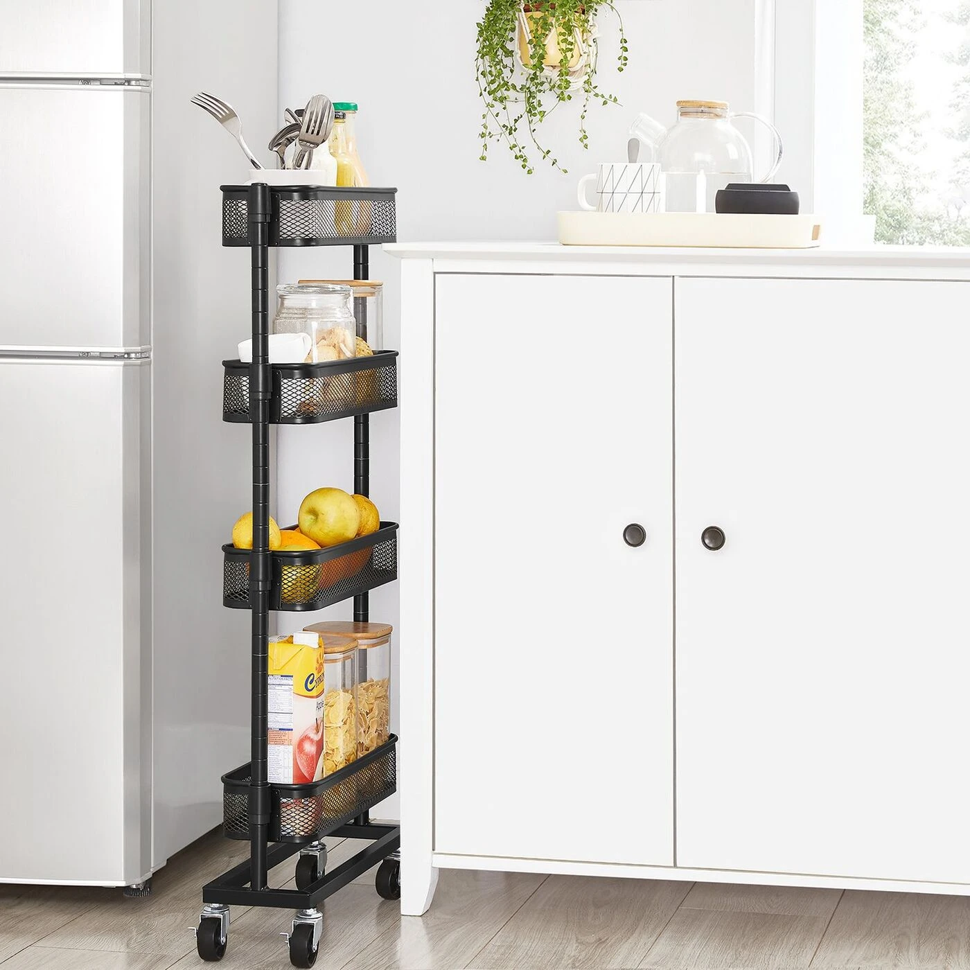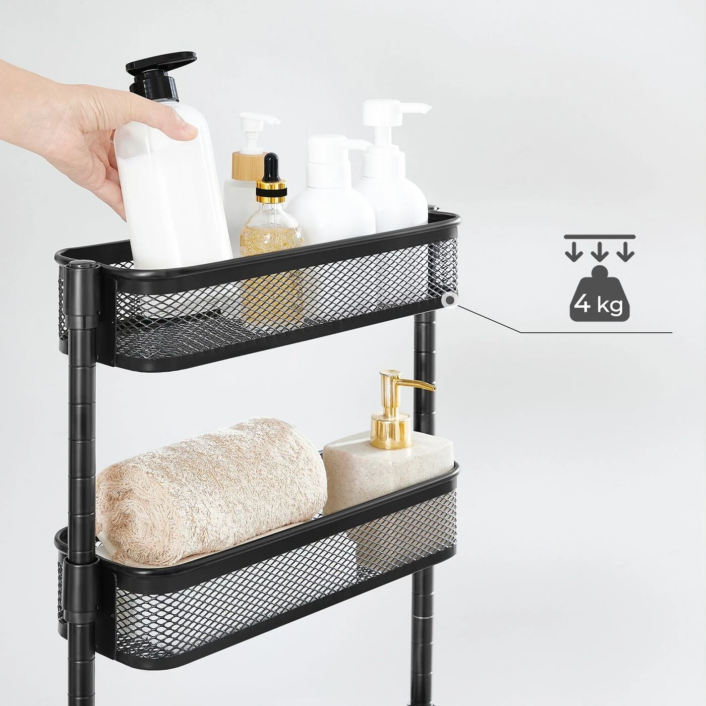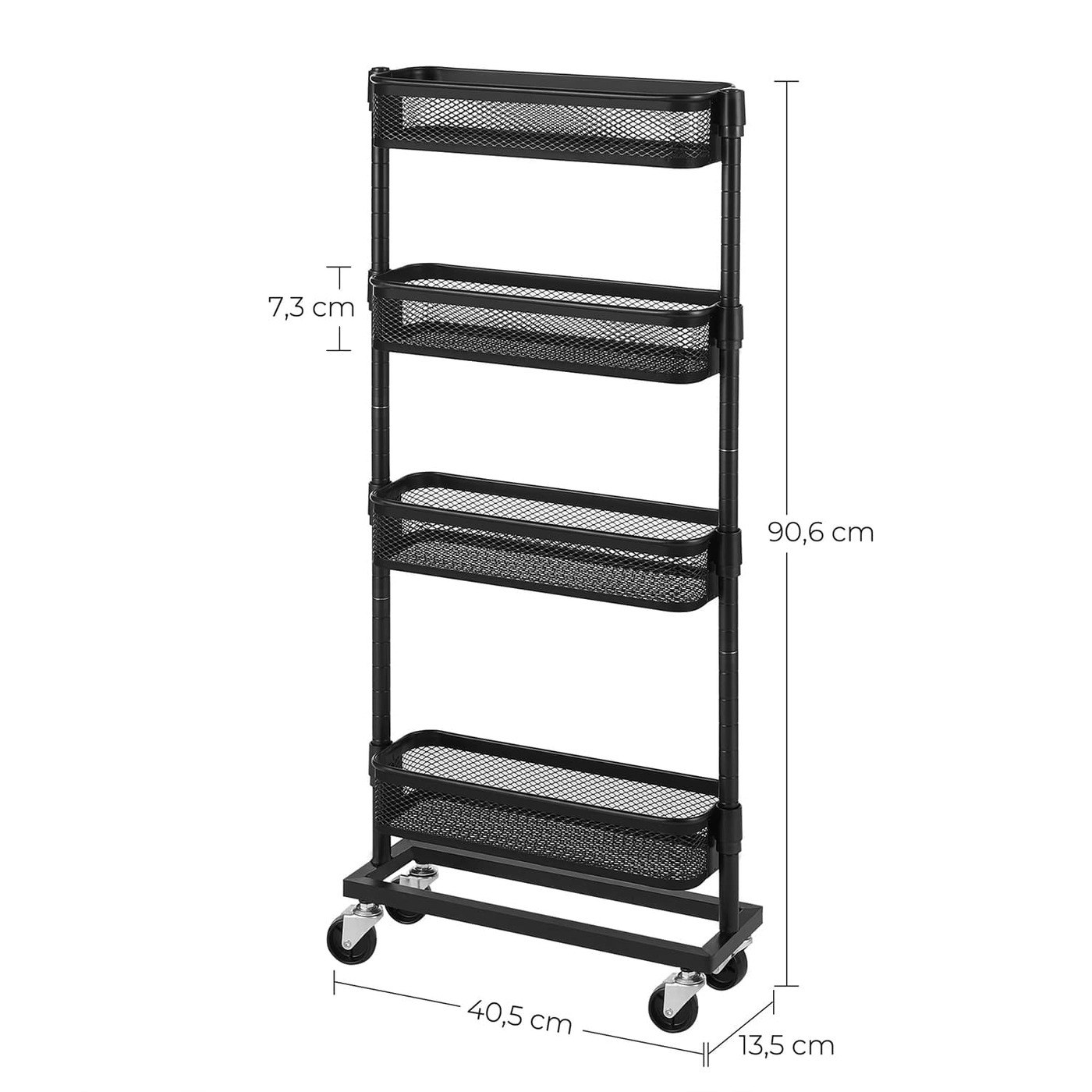 Aprašymas buvo automatiškai išverstas, gali pasitaikyti klaidų.Puikiai tinka prie vonios: užpildykite šią patogią vonios lentyną šampūnu, dušo žele ir kempinėle, susukite ją šalia vonios ir šokite į karštą burbulinę vonią! Patogu šalia jūsų stalviršio: padėkite prieskonius, padažus, kepimo aliejus ir kt. dažnai naudojamus maisto gaminimo ingredientus ant šios virtuvės lentynos ir įstumkite į mažą nišą šalia savo komodos. Taigi druska, pipirai ir alyvuogių aliejus yra paruošti, kai sukursite savo garsiąsias kuskuso salotas. Naudinga šalia jūsų stalo: ant šio lankstaus vežimėlio padėkite mažas dėžutes su biuro reikmenimis, segtuvu ir skylutėmis ir pastumkite jį šalia savo stalo. Taigi galite greitai pasiekti svarbius darbo priedus, kad jūsų stalas nenugrimztų į chaosą.Informacija apie gaminį: - Spalva: Juoda - Medžiaga: Plienas - Dydis: 40,5 x 13,5 x 90,6 cm (P x P x A) - Svoris: 3,3 kg - Maksimali statinė apkrova vienam lygiui: 4 kg Pristatymo apimtis: - 1 x siauras mobili lentyna - 1 x priedų paketas - 1 x vadovas (DE, EN, FR, IT, ES)