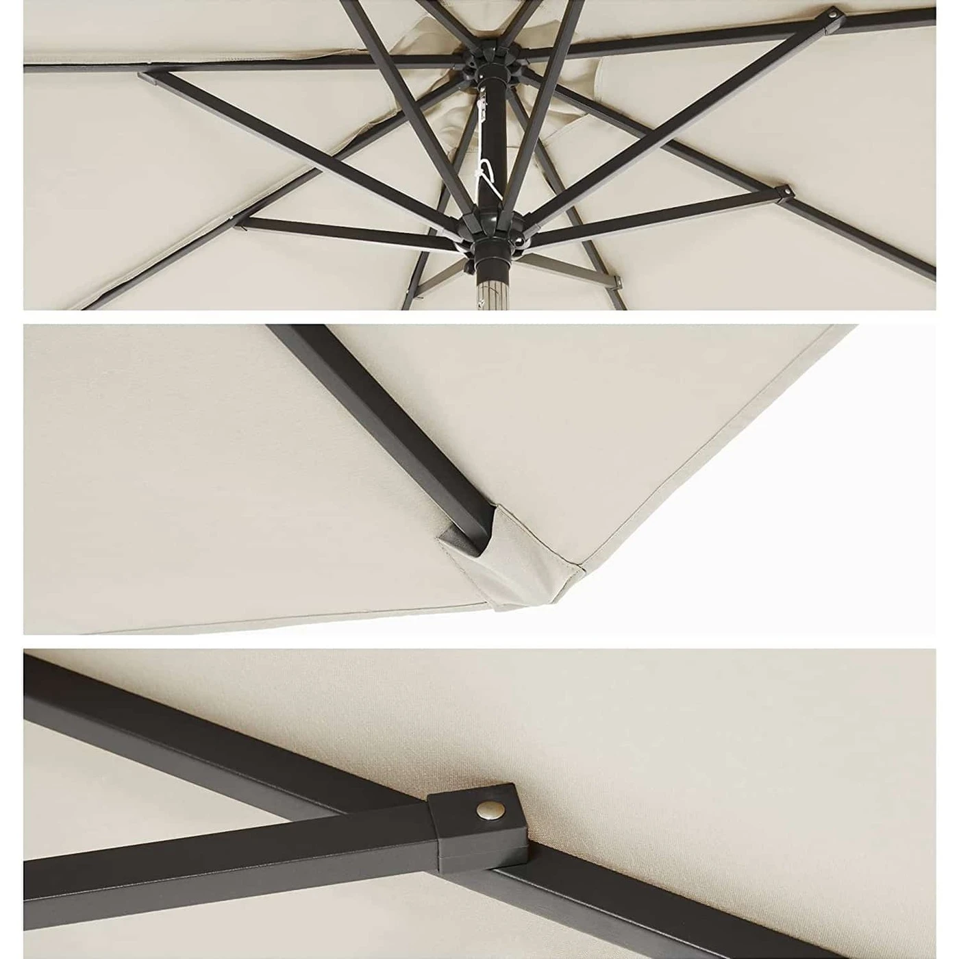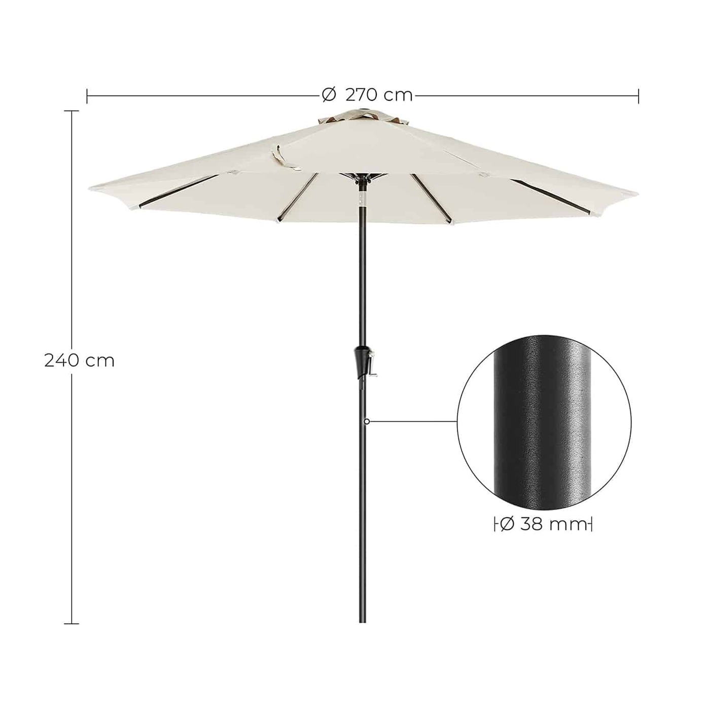 Aprašymas buvo automatiškai išverstas, gali pasitaikyti klaidų.Mėgaukitės gražiu oru pavėsyje! Lauko sezonas prasidėjo ir metas keliauti į sodą, terasą ar paplūdimį! Bet saugokis! Pagalvokite apie tinkamą apsaugą nuo saulės! Kai po ilgų, šaltų žiemos dienų pagaliau susigrąžinate savo lauko erdvę ir pasikviečiate draugus ant grotelių, atėjo puiki akimirka pasinaudoti naujuoju SONGMICS skėčiu! Vasarą būtina turėti Šį skėtį galima lenkti į kairę ir į dešinę. Taigi galite pritaikyti jį prie paros laiko ir šviesos kritimo kampo. Pavėsio skersmuo 270 cm, aukštis 240 cm. Po apsauga nuo saulės yra vietos nuo 4 iki 6 žmonių. Skėčio stiebas taip pat pagamintas iš nerūdijančio plieno. Tvirtas ir patvarus apsauginis audinys Apsauginis audinys nuo UV spindulių (UPF 50+) sudarytas iš 100 % poliesterio, yra atsparus vandeniui ir atsparus spalvoms. Be to, jame yra keletas ventiliacijos angų. Tai leidžia sodo skėtis geriau atlaikyti vėją. Be to, apsauginė šluostė yra nuimama ir gali būti skalbiama rankomis.Prekės informacija: - Spalva: smėlio spalvos - Medžiaga: skėčio stulpas ir skėčio briaunelės iš metalo, 180 g/㎡ poliesterio audinys - Aukštis: 240 cm - Ø skėtis: 270 cm - Ø skėčio kotas: 38 mm - Svoris: 6 kg pristatymas: - 1 x skėtis - 1 x Instrukcija (DE, EN, FR, ES, IT) SONGMICS Pastabos: - Skėčio stovas neįeina.- Uždarykite skėtį naktį ir pučiant stipriam vėjui.- Nerekomenduojama naudoti šis skėtis lietingu oru.