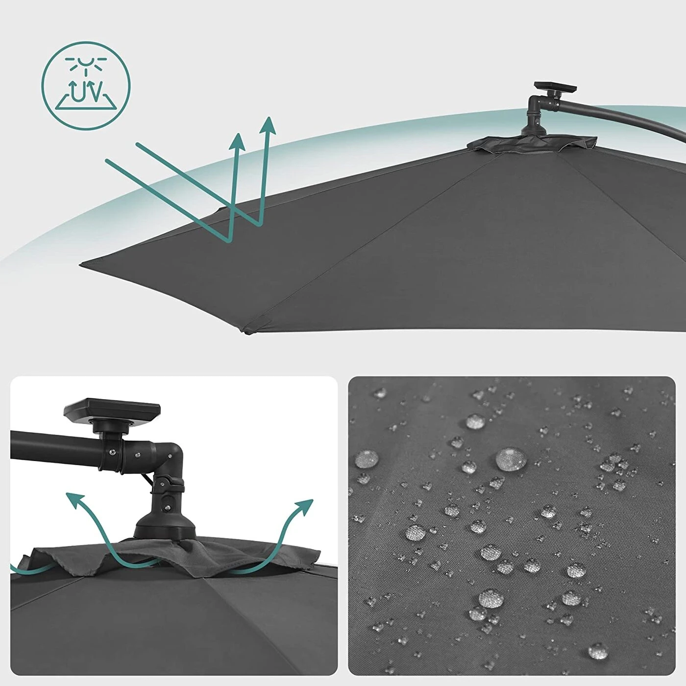 Aprašymas buvo automatiškai išverstas, gali pasitaikyti klaidų.Suteikia pavėsį dienos metu: nuo šiol nebereikia bijoti ryškios saulės šviesos! Nesvarbu, ar norite nusnūsti sode, pavalgyti su draugais terasoje ar pasimėgauti kavos pertraukėle su šeima po atviru dangumi – šis skėčiai išpildys jūsų planus. Pagaminta iš 180 g/m² poliesterio audinio, užtikrina puikią apsaugą nuo UV spindulių iki UPF 50+. Vakare spinduliuoja romantika: kai tik saulė nusileidžia, vakarėlis prasideda! Įjunkite LED lemputes, maitinamas saulės baterijos ir suteiksite savo balkonui romantiškos atmosferos. Vakarienė su savo partneriu? Gimtadienio staigmena vidurnaktį? Mėgaukitės gražiomis akimirkomis su savo artimaisiais švelnioje šviesoje!Išsami informacija apie gaminį: Spalva: Pilka Medžiaga: Metalinis skėčio stulpas, 180 g/m² poliesterio audinys Ø skėtis: 3 m Aukštis: 2,45 m Svoris: 13 kg Pristatymo komplektas: 1 x skėtis 1 x stovas 1 x instrukcijos SONGMICS Pastabos: Prašome įdėti sunkų daiktai (neįtraukta) ant Pėdos, kad būtų užtikrintas gaminio stabilumas. Prašome neatidaryti skėčio per jėgą, o švelniai ir lėtai. Uždarykite skėtį nakčiai, pučiant stipriam vėjui ar lietingu oru, kad nepažeistumėte. Apsaugokite skėtį a Dangtis (nepridedamas), kad būtų užtikrintas ilgesnis tarnavimo laikas.