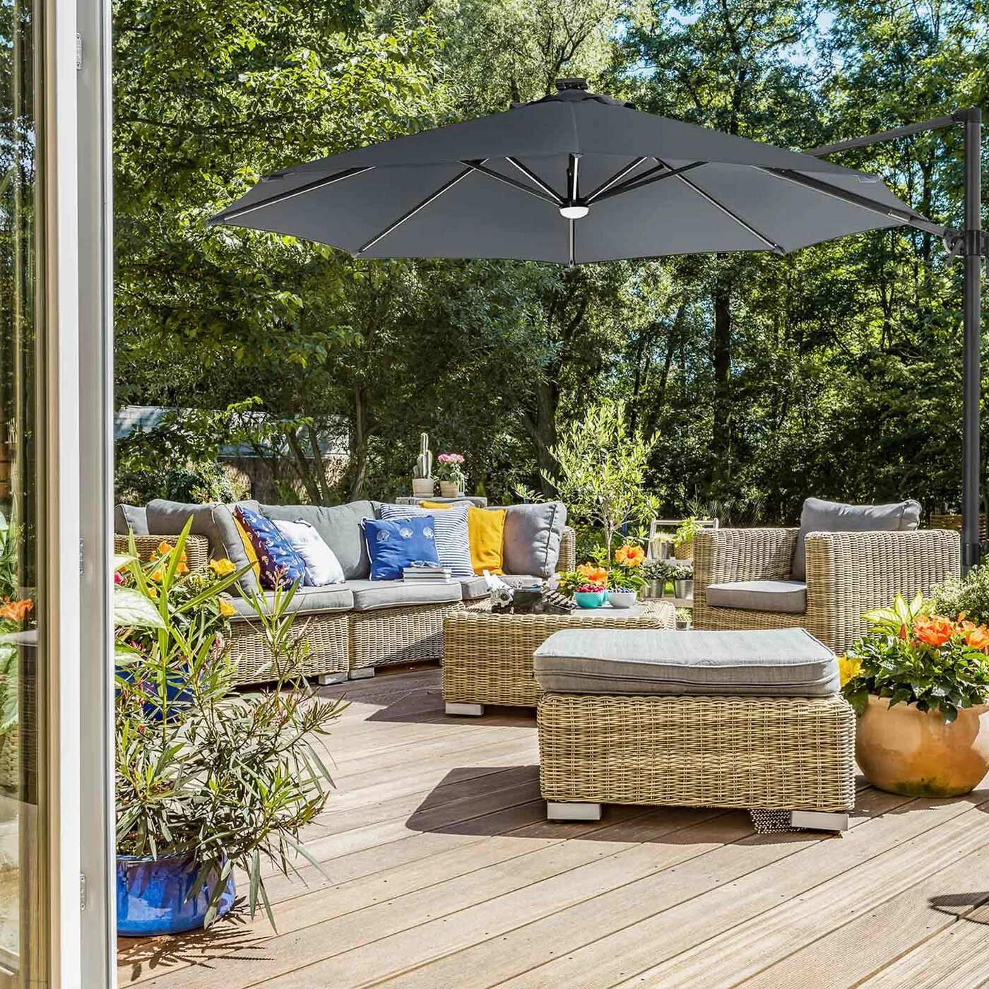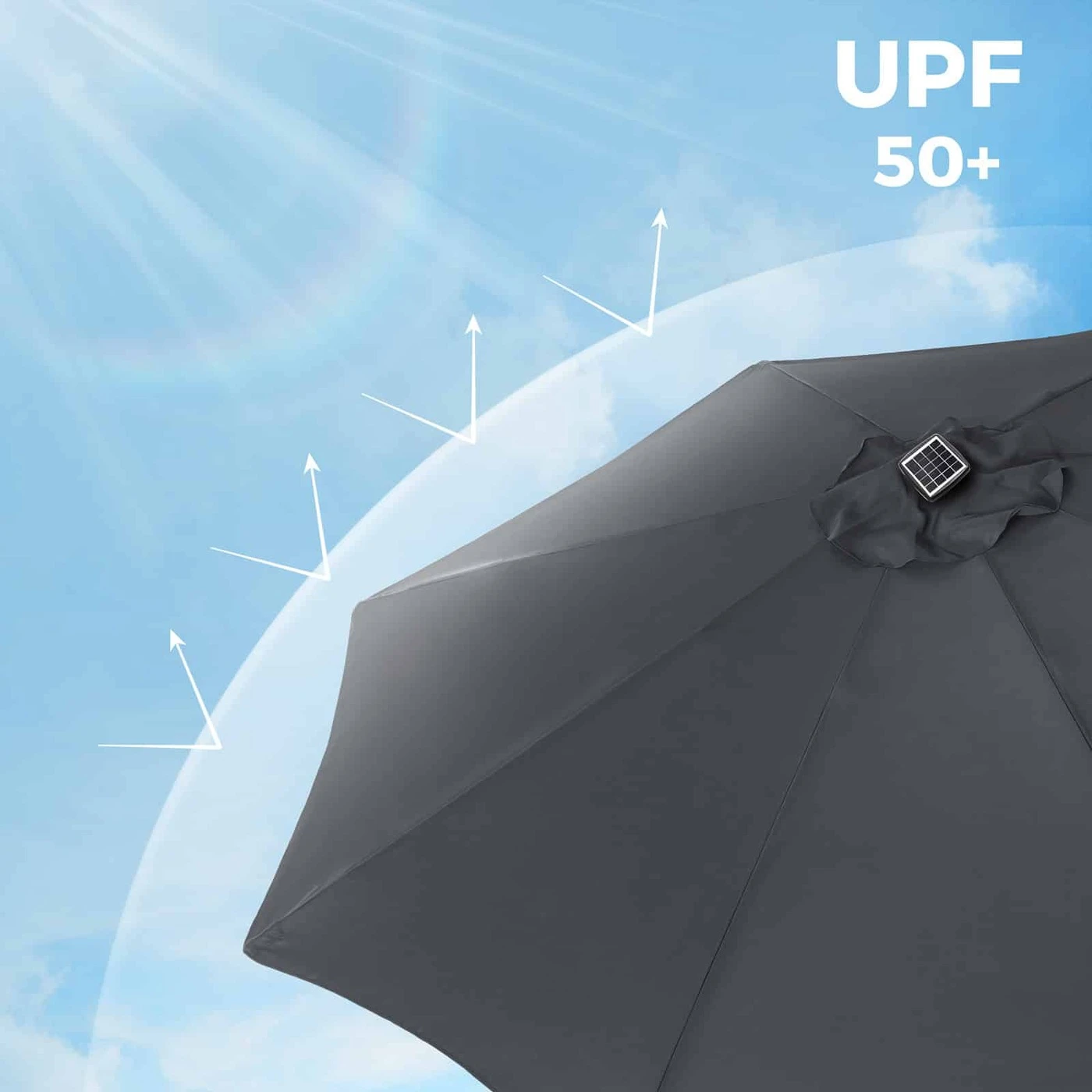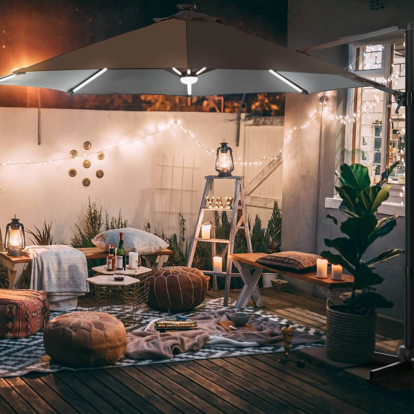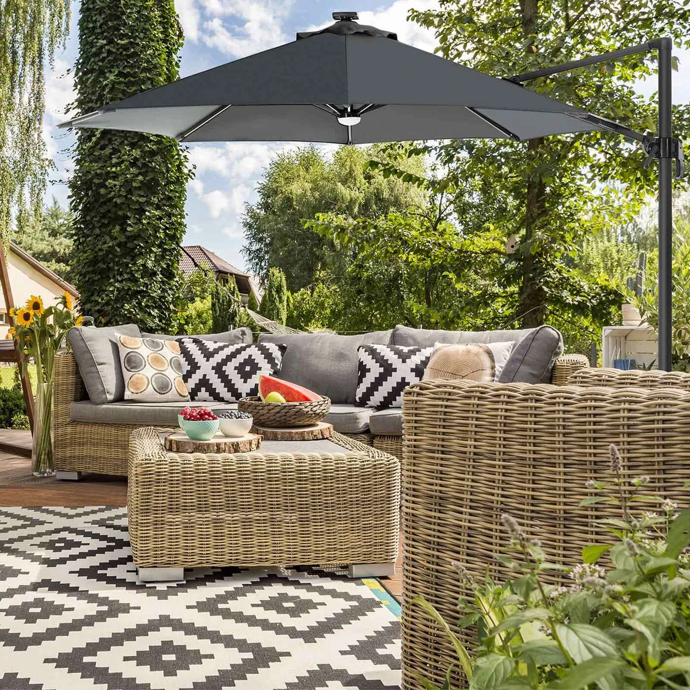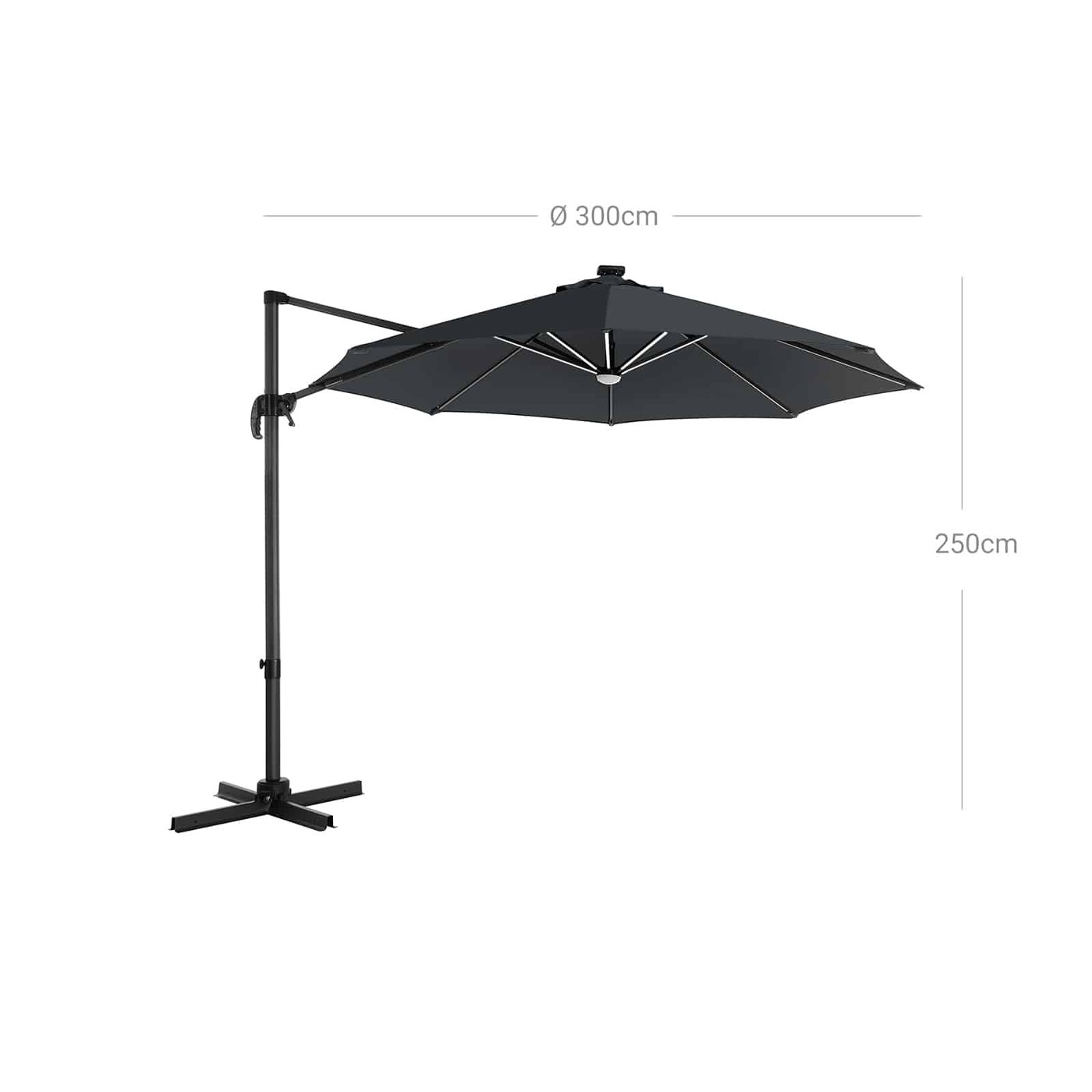 Aprašymas buvo automatiškai išverstas, gali pasitaikyti klaidų.Nuo saulėtekio iki saulėlydžio: Tegul ateina gražus oras! Išeik į saulę! Tačiau nepamirškite kremo nuo saulės! Su šiuo skėčiu papuoškite savo sodą ar terasą; užtikrina puikią UV apsaugą iki UPF 50+. Atidarykite skėtį praktišku rankiniu švaistikliu. Šonine rankena reguliuokite skėčio kampą saulei tekant. Užlipkite ant pedalo ir pasukite skėčio kotą taip, kad skėtis būtų nukreiptas kita kryptimi. Nuostabu! Linksmybės toli gražu nesibaigė! Vos saulei nusileidus, įjunkite šio skėčio LED apšvietimą, jis suteiks jūsų sodui romantikos! Apšvietimas maitinamas iš viršutinėje dalyje esančios saulės baterijos arba pridedamo USB kabelio Informacija apie gaminį: Spalva: pilka Medžiaga: aliuminio skėčio stulpas, metaliniai skėčio briaunelės, 240 g/m² poliesterio audinys su PA dangaØ skėtis: 3 mAukštis: 2 , 5 mSvoris: 18,5 kg Pakuotės turinys: 1 x Skėtis 1 x Stovas 1 x InstrukcijosSONGMICS Pastabos: Padėkite sunkius daiktus (neįtraukta) ant pagrindo, kad užtikrintumėte gaminio stabilumą. Prašome neatidaryti skėčio per jėgą, bet švelniai ir lėtai. Uždarykite skėtį naktį, pučiant stipriam vėjui ar lietingu oru, kad nepažeistumėte. Apsaugokite skėtį dangteliu (nepridedamas), kad užtikrintumėte ilgesnį tarnavimo laiką.