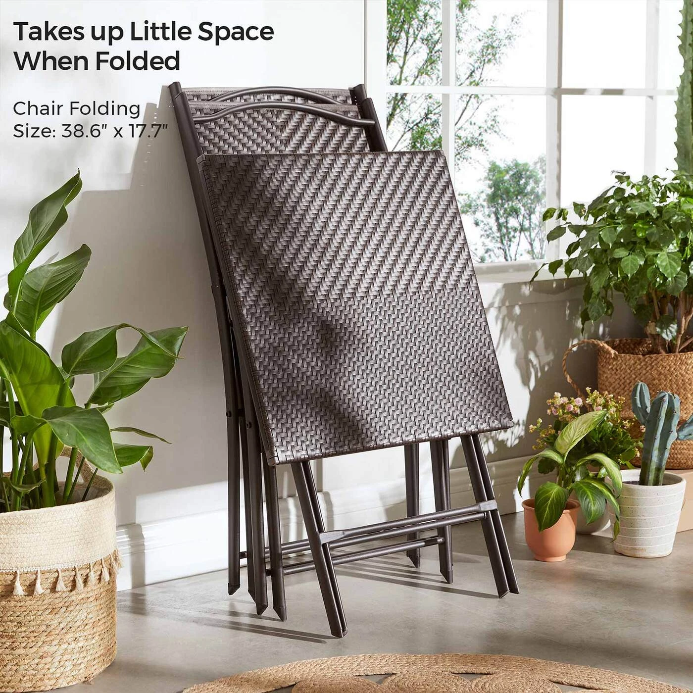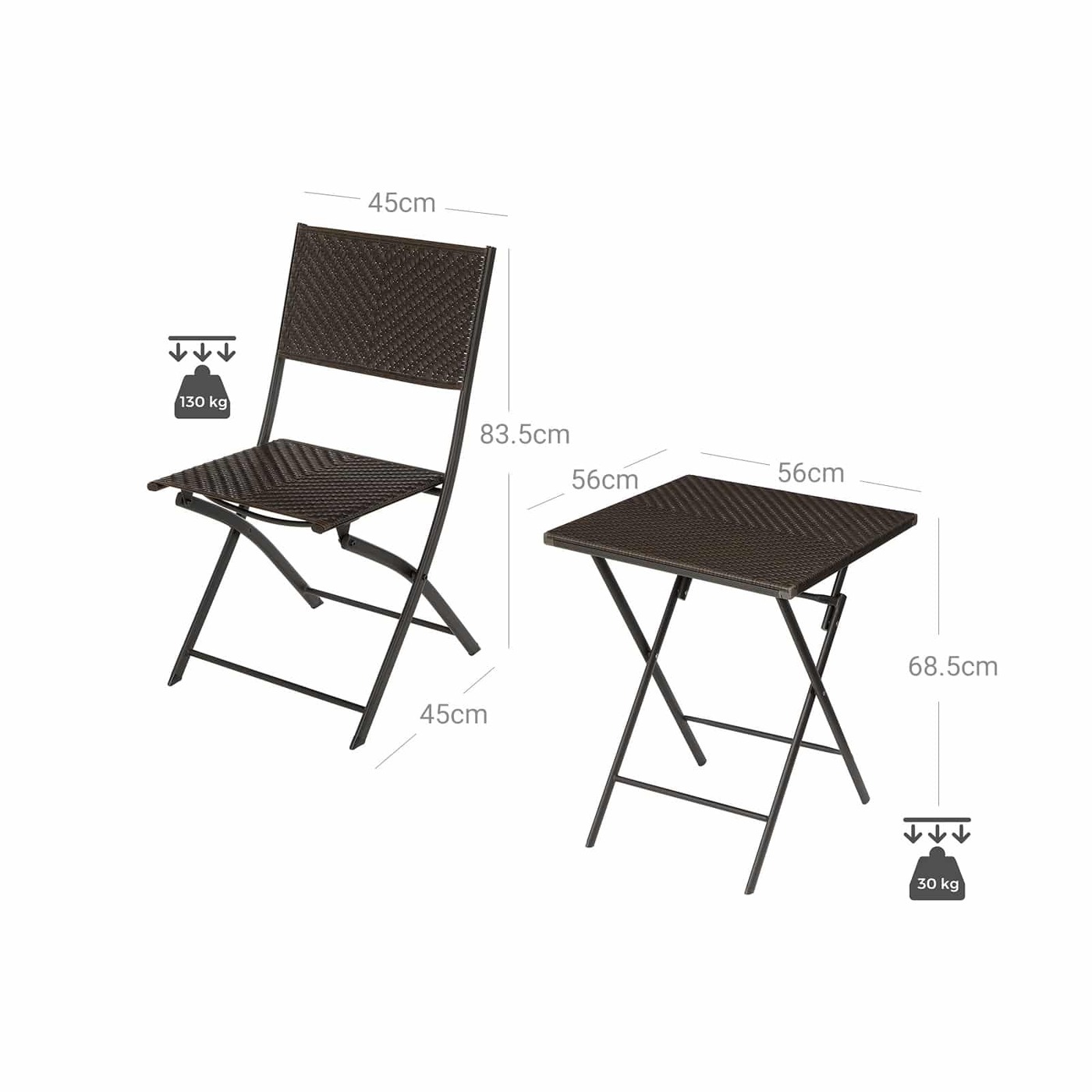 Aprašymas buvo automatiškai išverstas, gali pasitaikyti klaidų.Jei mėgstate leisti laisvalaikį terasoje ar balkone, šis baldų komplektas yra praktiškas lauko baldų papildymas. Šio baldo paviršius yra atsparus vandeniui ir lengvai valomas.Svarbu stabilumas: Nesvarbu, ar terasoje norite įdėti keptas dešreles ir alų, ar gražų vazoninį augalą ir kavos puodelį balkone stalas, dėl stabilių plieninių kojų ir tvirto stalviršio, tampa vienu aukšto šio lauko baldo stabilumo garantuotas. Kai nenaudojate, galite sulankstyti šiuos lauko baldus ir laikyti juos savo rūsio kampe arba mansarda. Arba įdėkite juos į savo bagažinę ir išsineškite į stovyklą!Išsami informacija apie gaminį: Spalva: kavos ruda Medžiaga: PE (polietilenas), milteliniu būdu dengtas plienas Kėdės dydis: 45 x 45 x 83,5 cm (I x P x A) Stalo dydis: 56 x 56 x 68,5 cm (P x P x A) Bendras svoris: 13 kg Maks. statinė vienos kėdės apkrova: 130 kgMaks. Statinė stalo apkrova: 30 kg Pristatymo komplektas: 2 x sulankstoma kėdė1 x sulankstomas stalas SONGMICS Pastabos: Šį baldų komplektą rekomenduojame uždengti esant blogam orui arba žiemą. Taip pailgėja tarnavimo laikas.Siekiant užtikrinti saugų naudojimą, negalima viršyti maksimalios apkrovos.