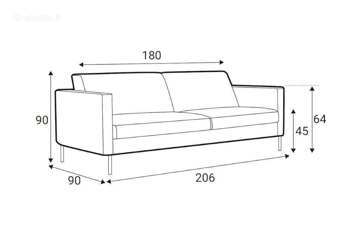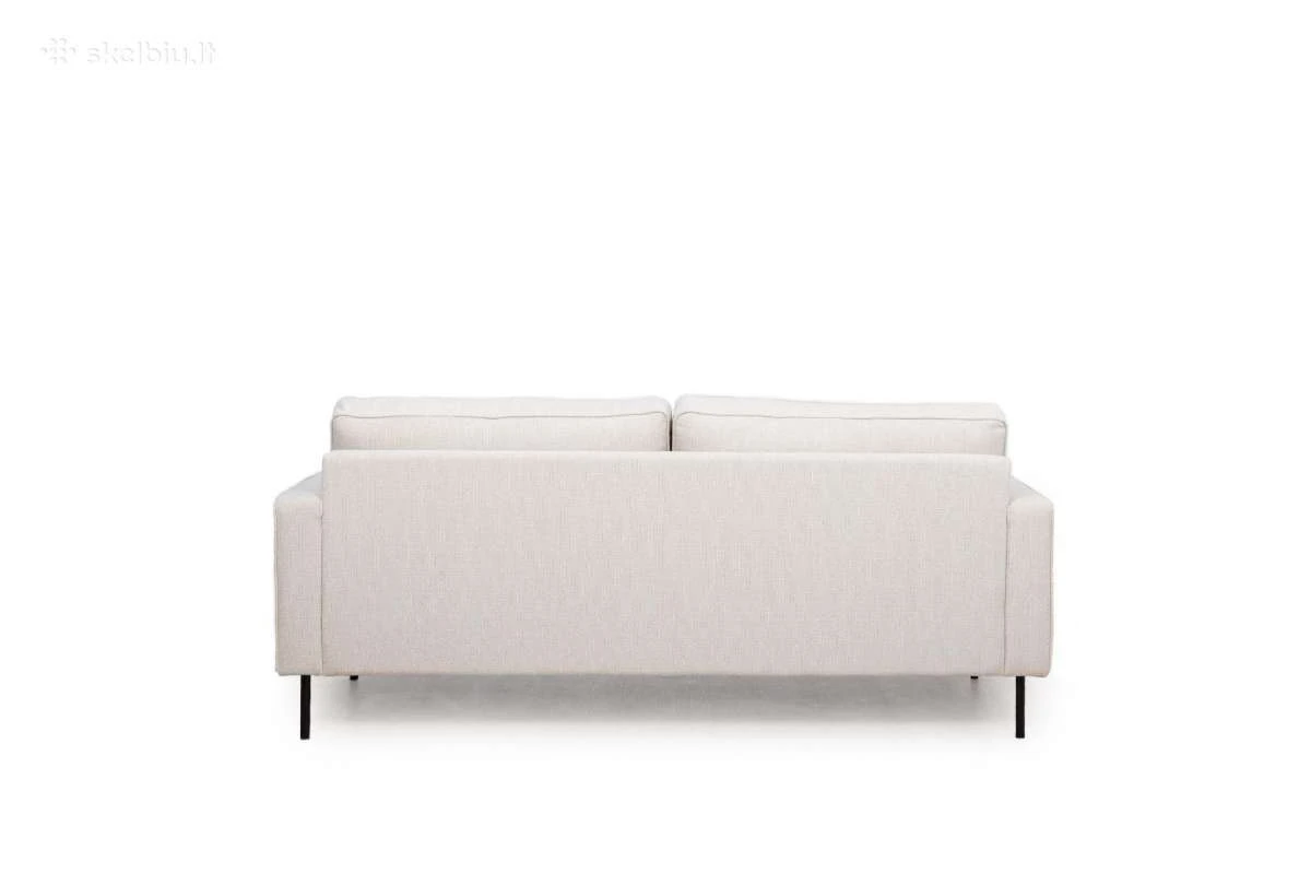 Erdvi dvivietė sofa su šviesiu audiniu ir kontrastingomis tamsios spalvos kojelėmis pabrėžiančiomis šiuolaikišką dizainą.