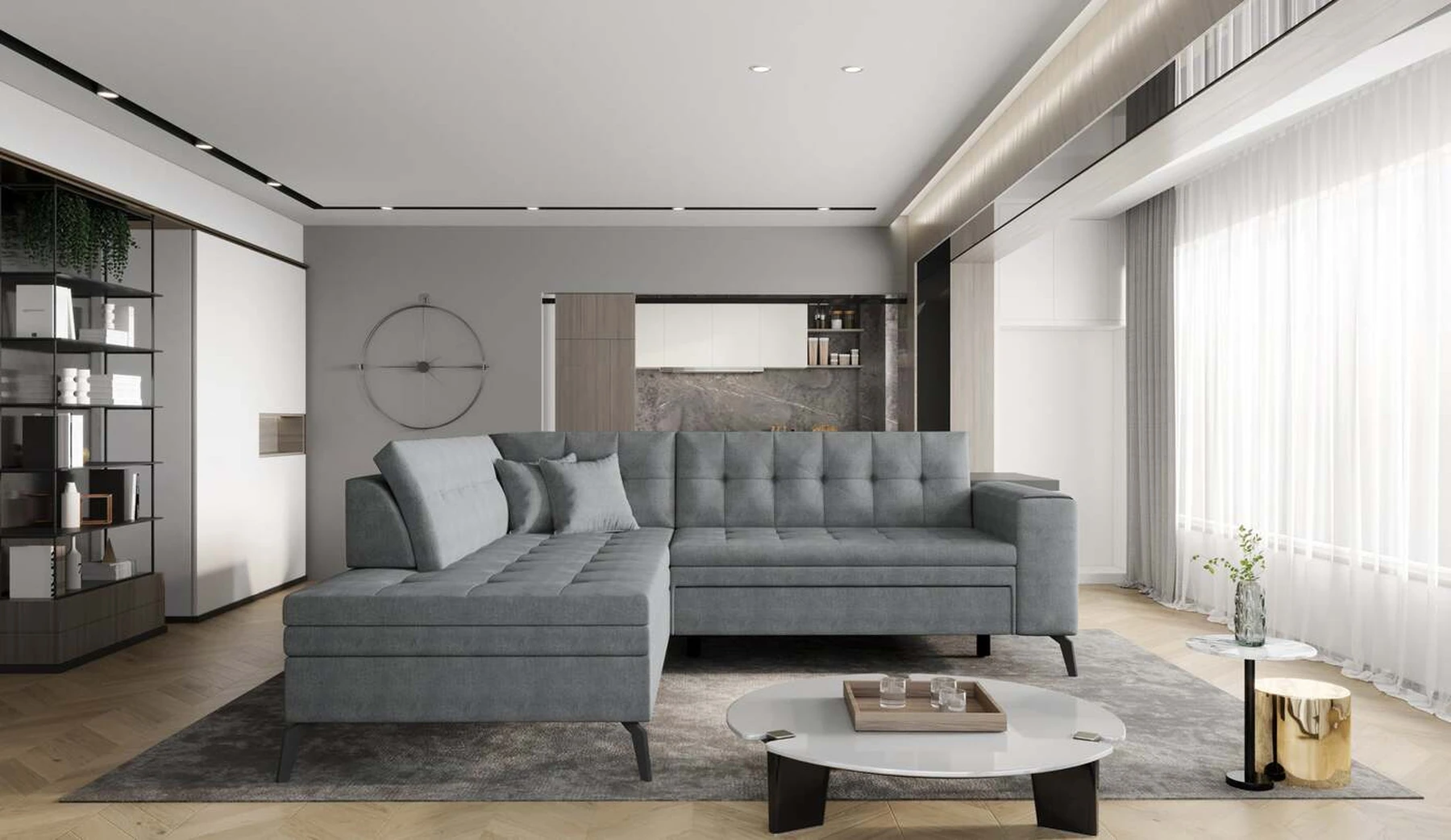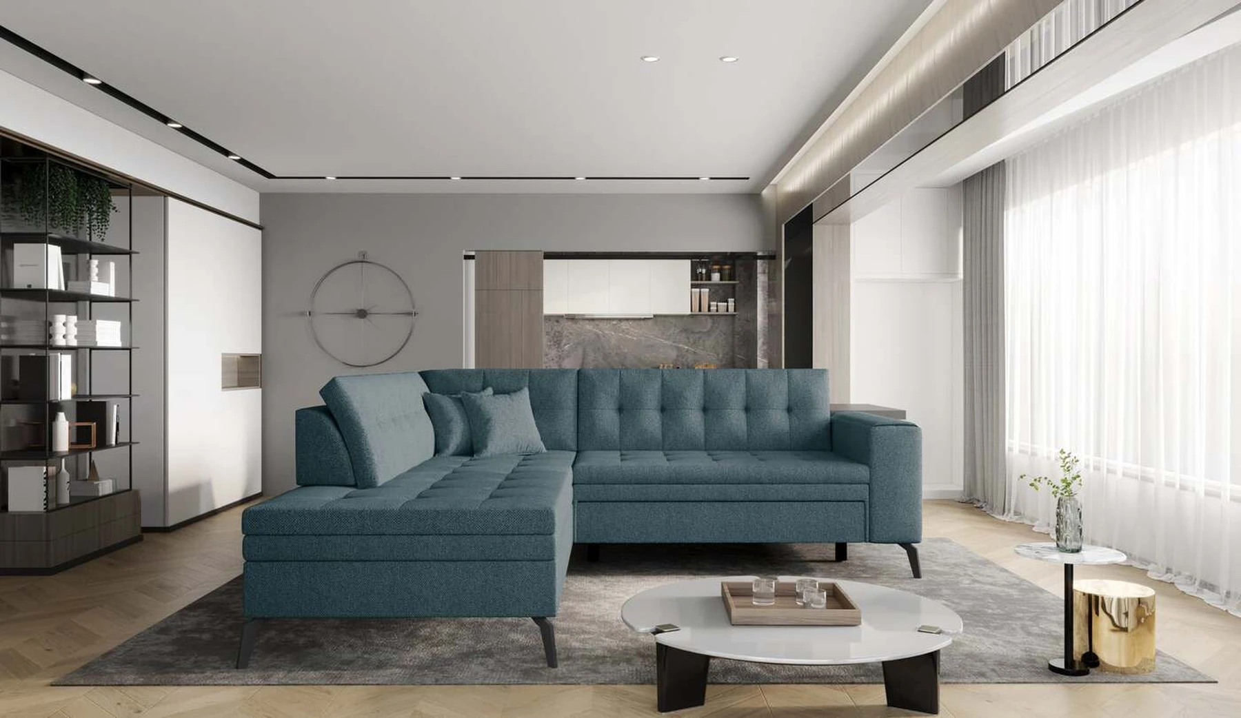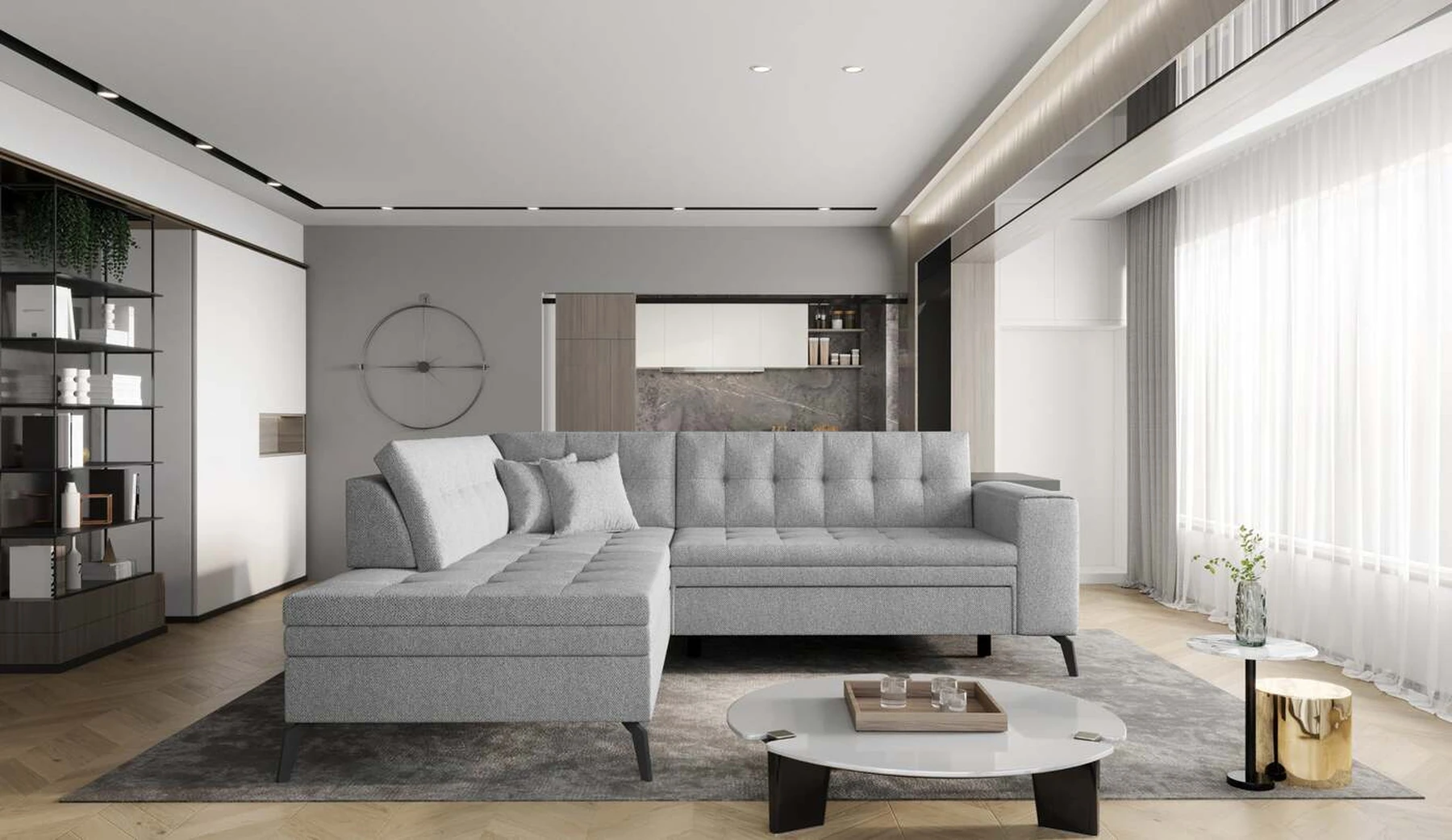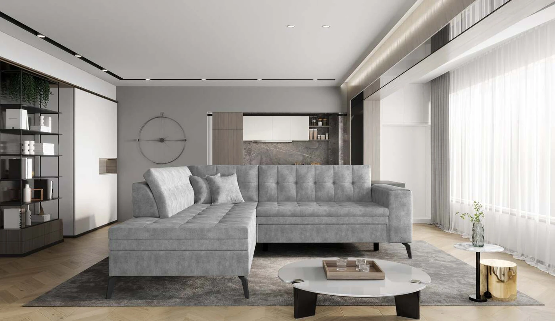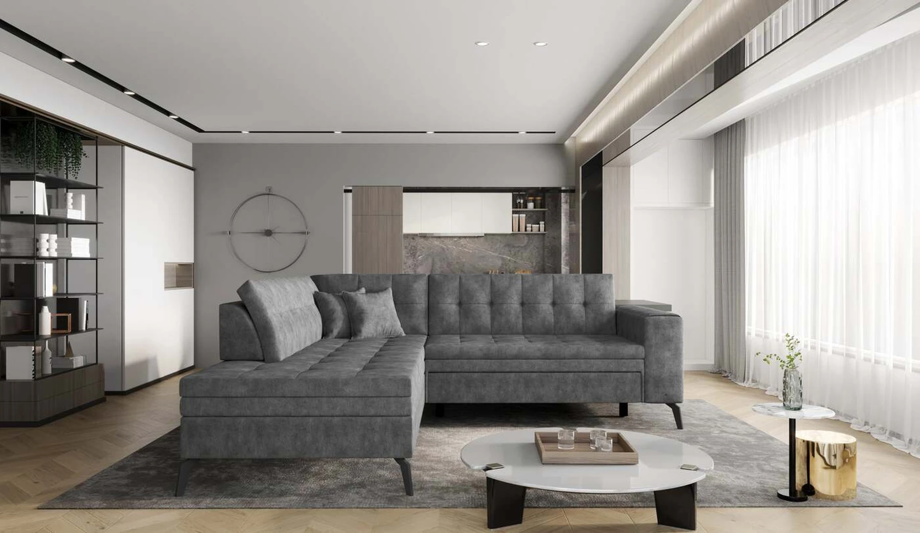 EL1053 yra funkcionali, stilinga ir, svarbiausia, elegantiška kampinė sofa, skirta išrankiems komforto žinovams. Šie baldai užtikrina aukštą poilsio komfortą tiek dieną, tiek naktį. Erdvios kampinės sofos, kurios matmenys 260 x 210 x 93 cm, sėdynė pagaminta iš T30 putplasčio, kuris yra atsakingas už maksimalų komfortą, elastingumą ir deformacijų nebuvimą. Patikimos Dolphin sistemos dėka – patogų kampą galima paversti erdvia lova, kurios miegamasis paviršius yra 195 x 125 centimetrai. Atskiro paminėjimo nusipelno ir elegantiška baldų išvaizda. Visa tai dėka sėdynės ir atlošo antklodės – viena vertus, jos padaro baldą unikalų, kita vertus – labai elegantiški ir skoningi. Gaminį galima įsigyti iš visų kolekcijos audinių. EL1053 yra dėmesio vertas baldas – erdvus, praktiškas, taip pat stilingas. Tikrai verta turėti tokią unikalią kampinę sofą savo bute.