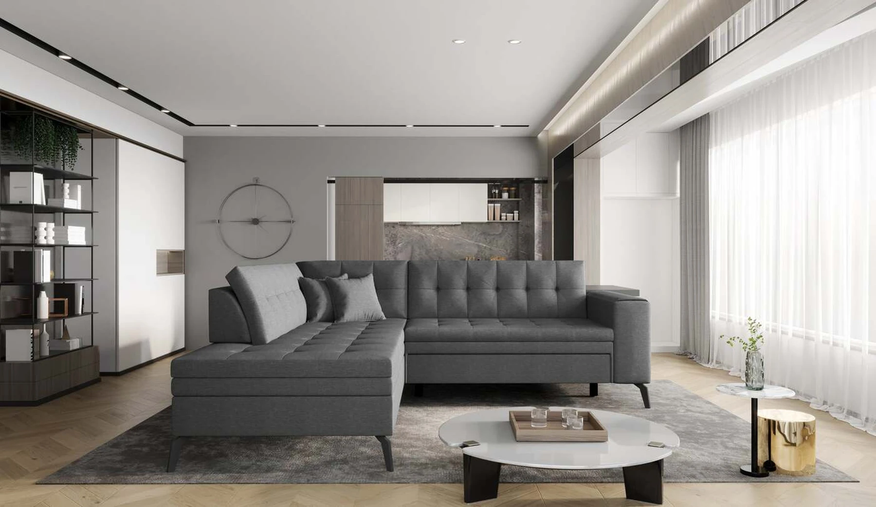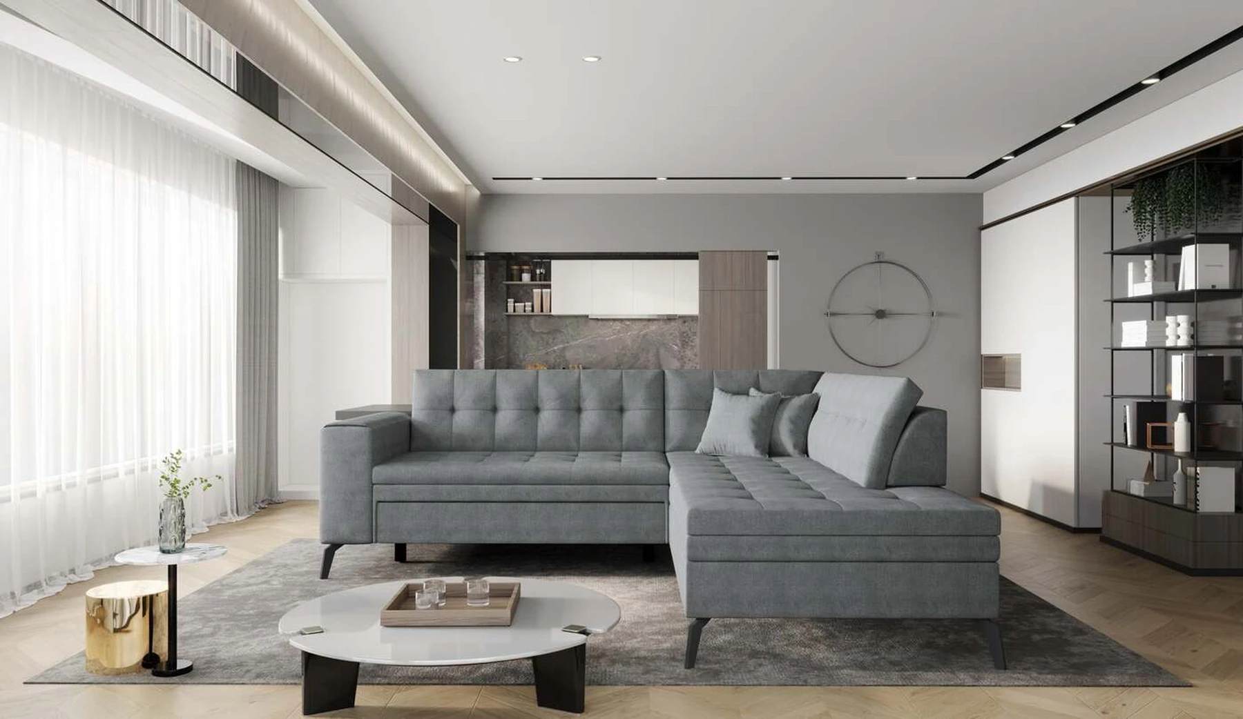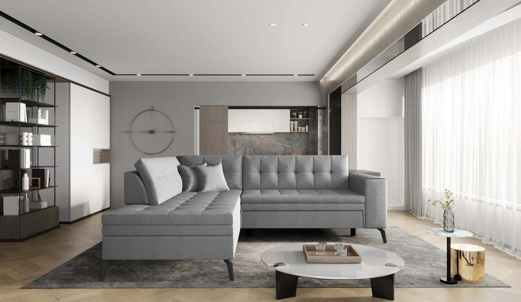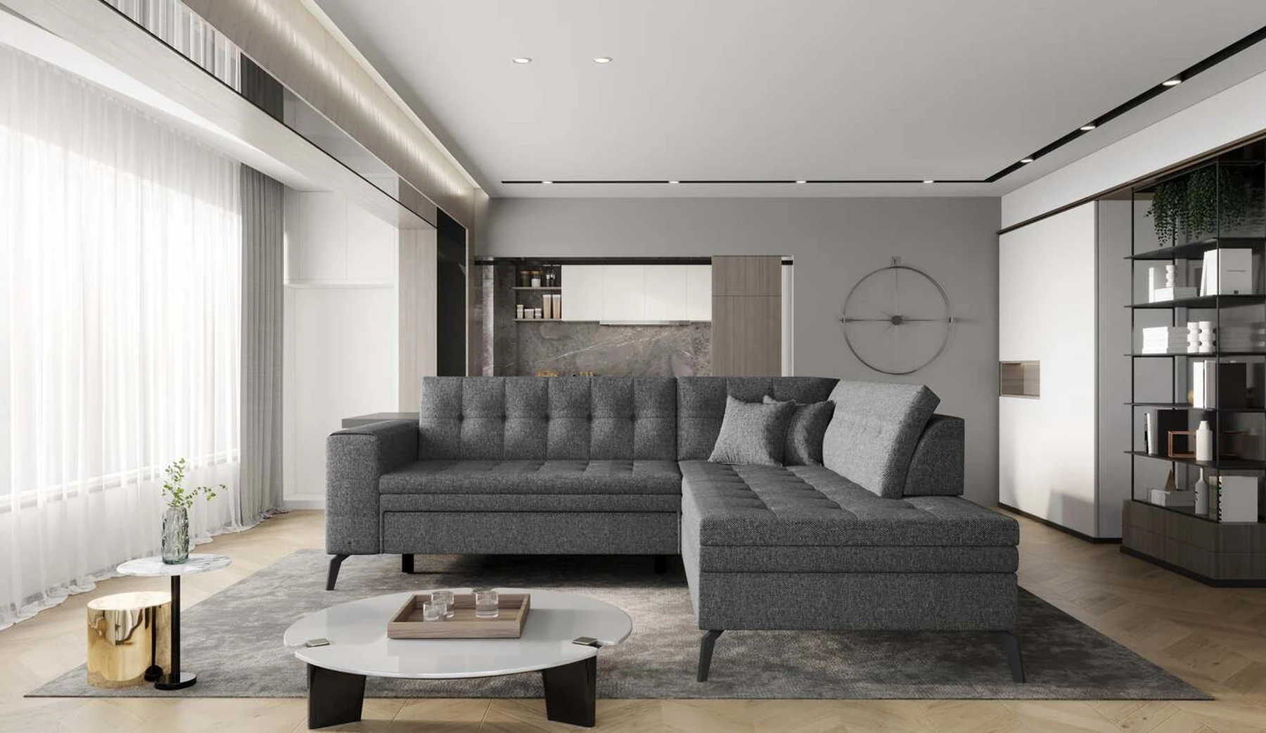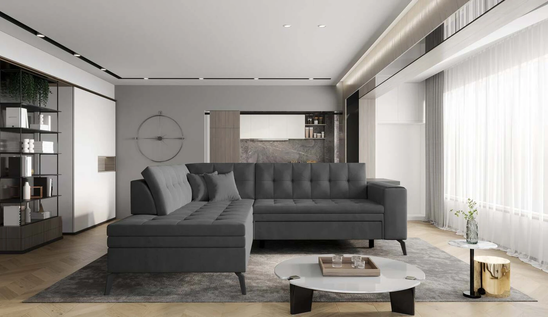 EL1053 yra funkcionali, stilinga ir, svarbiausia, elegantiška kampinė sofa, skirta išrankiems komforto žinovams. Šie baldai užtikrina aukštą poilsio komfortą tiek dieną, tiek naktį. Erdvios kampinės sofos, kurios matmenys 260 x 210 x 93 cm, sėdynė pagaminta iš T30 putplasčio, kuris yra atsakingas už maksimalų komfortą, elastingumą ir deformacijų nebuvimą. Patikimos Dolphin sistemos dėka – patogų kampą galima paversti erdvia lova, kurios miegamasis paviršius yra 195 x 125 centimetrai. Atskiro paminėjimo nusipelno ir elegantiška baldų išvaizda. Visa tai dėka sėdynės ir atlošo antklodės – viena vertus, jos padaro baldą unikalų, kita vertus – labai elegantiški ir skoningi. Gaminį galima įsigyti iš visų kolekcijos audinių. EL1053 yra dėmesio vertas baldas – erdvus, praktiškas, taip pat stilingas. Tikrai verta turėti tokią unikalią kampinę sofą savo bute.