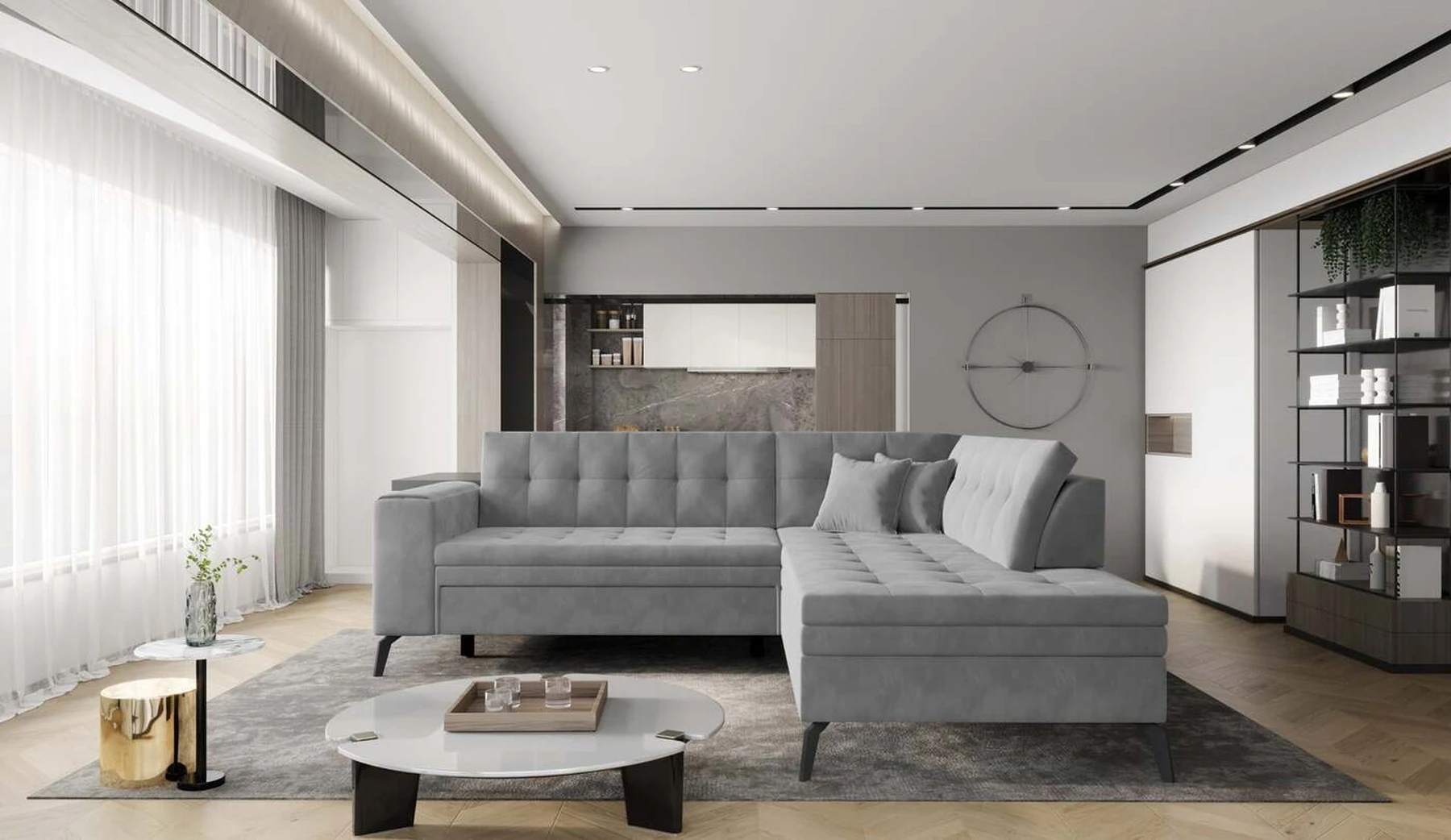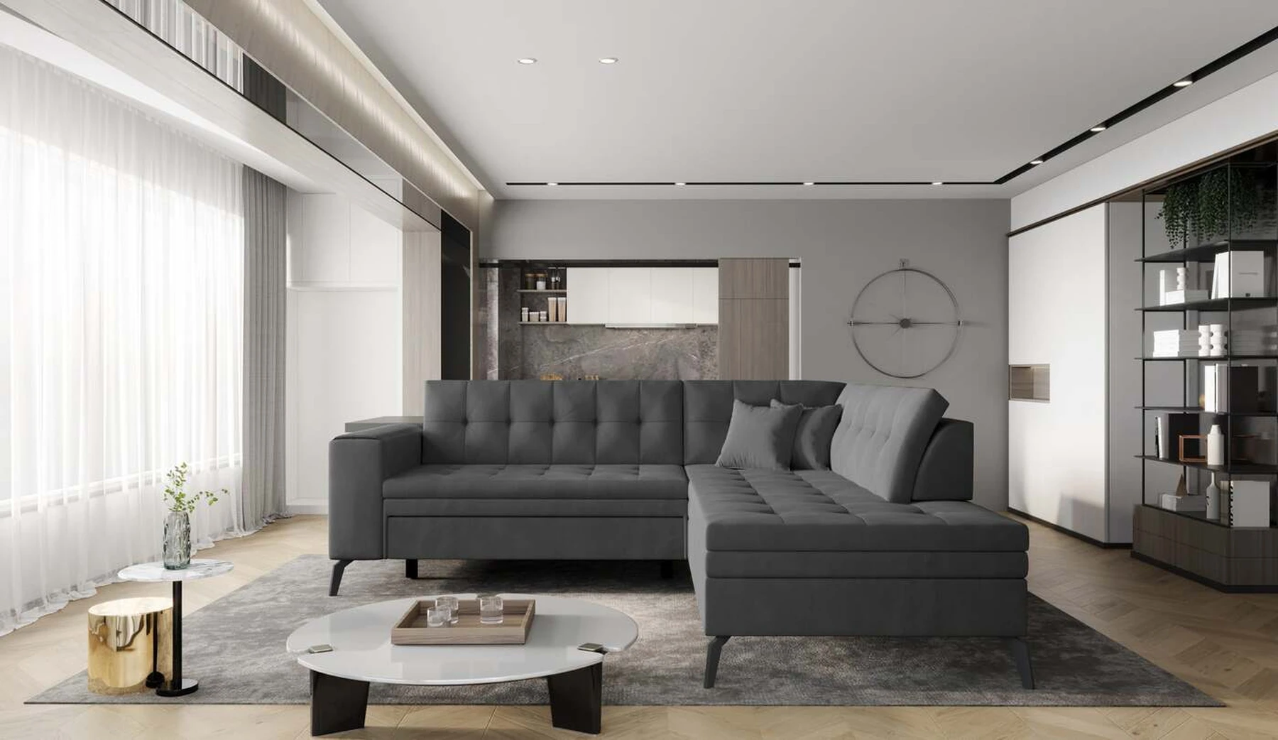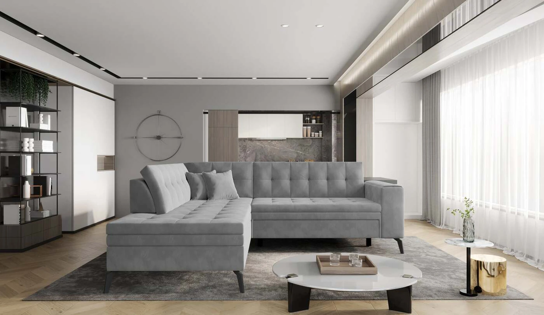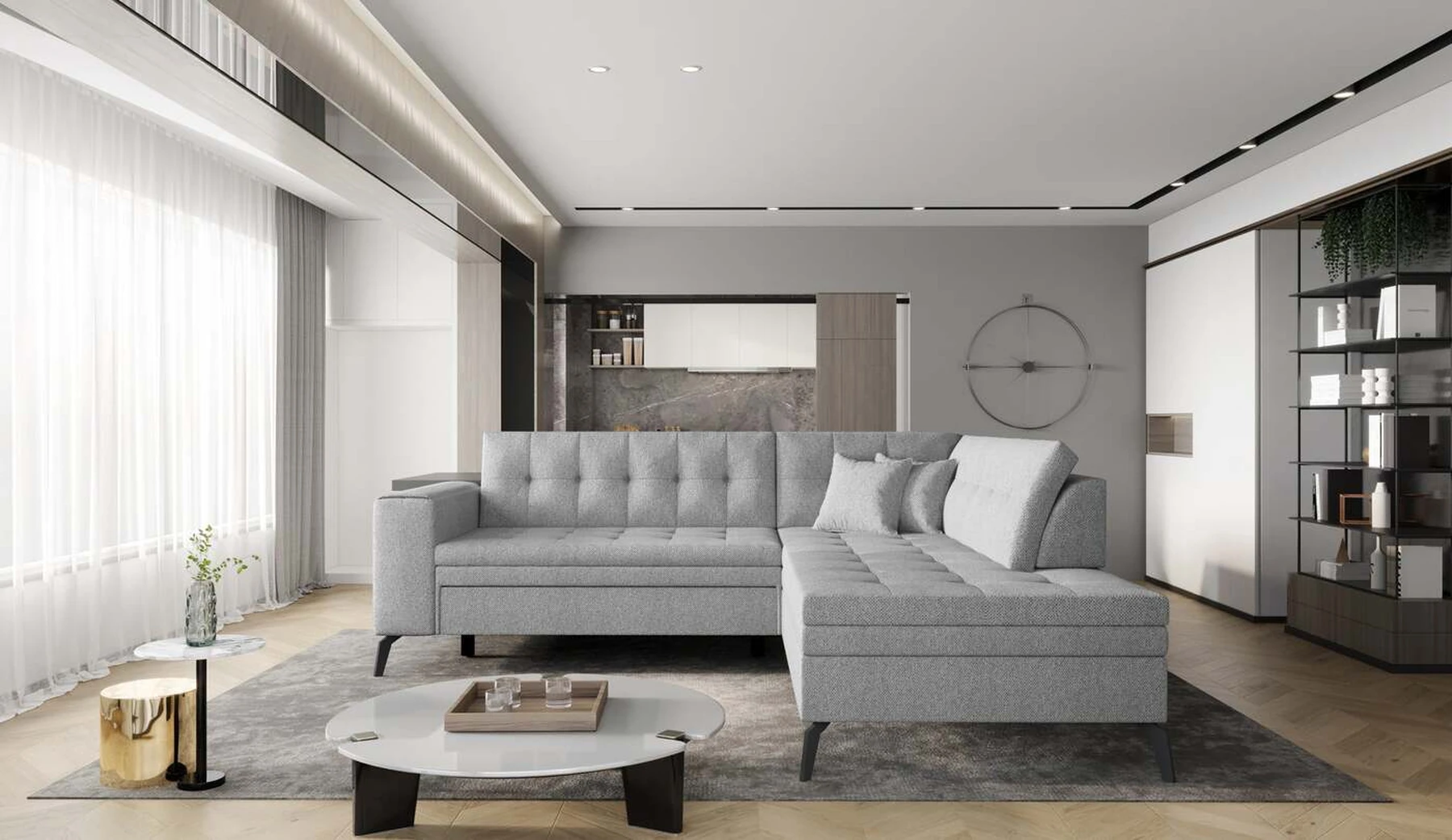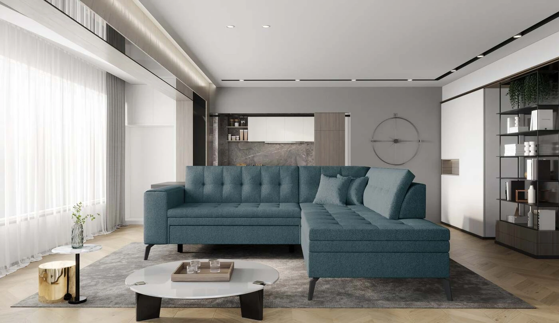 EL1053 yra funkcionali, stilinga ir, svarbiausia, elegantiška kampinė sofa, skirta išrankiems komforto žinovams. Šie baldai užtikrina aukštą poilsio komfortą tiek dieną, tiek naktį. Erdvios kampinės sofos, kurios matmenys 260 x 210 x 93 cm, sėdynė pagaminta iš T30 putplasčio, kuris yra atsakingas už maksimalų komfortą, elastingumą ir deformacijų nebuvimą. Patikimos Dolphin sistemos dėka – patogų kampą galima paversti erdvia lova, kurios miegamasis paviršius yra 195 x 125 centimetrai. Atskiro paminėjimo nusipelno ir elegantiška baldų išvaizda. Visa tai dėka sėdynės ir atlošo antklodės – viena vertus, jos padaro baldą unikalų, kita vertus – labai elegantiški ir skoningi. Gaminį galima įsigyti iš visų kolekcijos audinių. EL1053 yra dėmesio vertas baldas – erdvus, praktiškas, taip pat stilingas. Tikrai verta turėti tokią unikalią kampinę sofą savo bute.