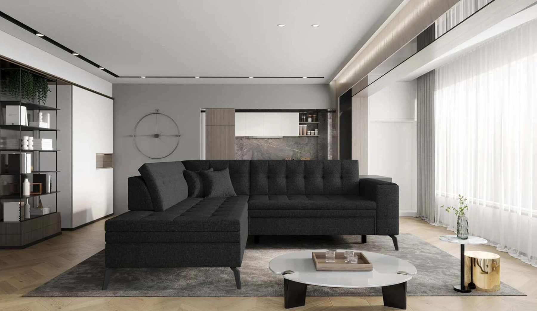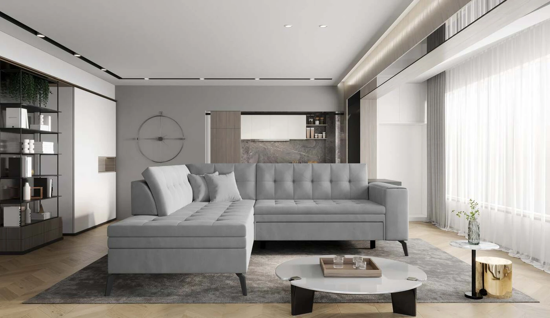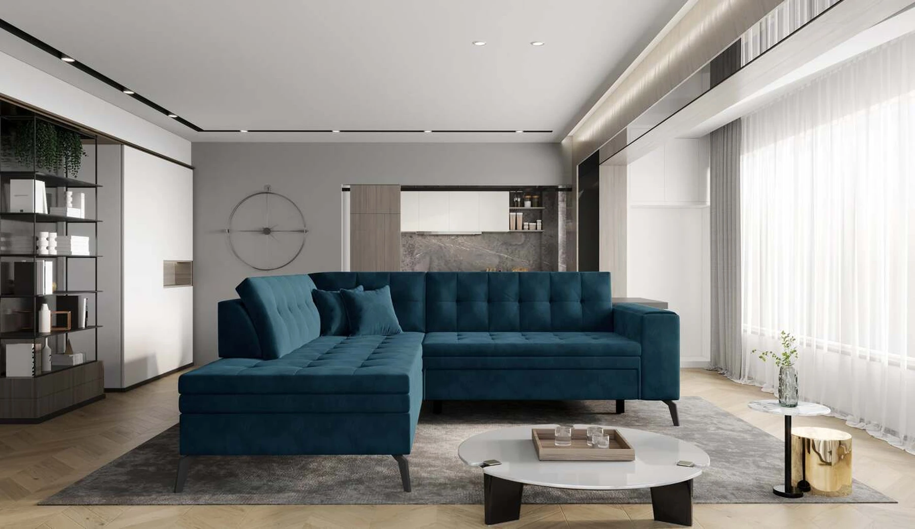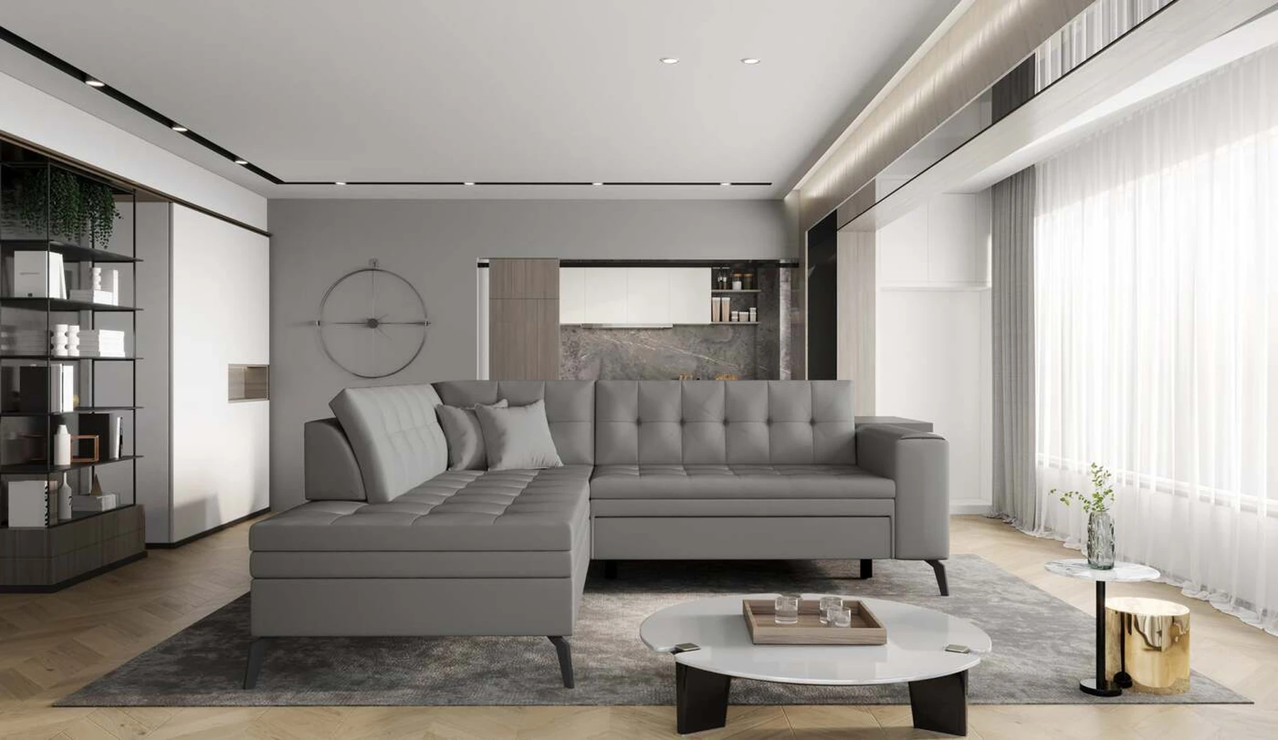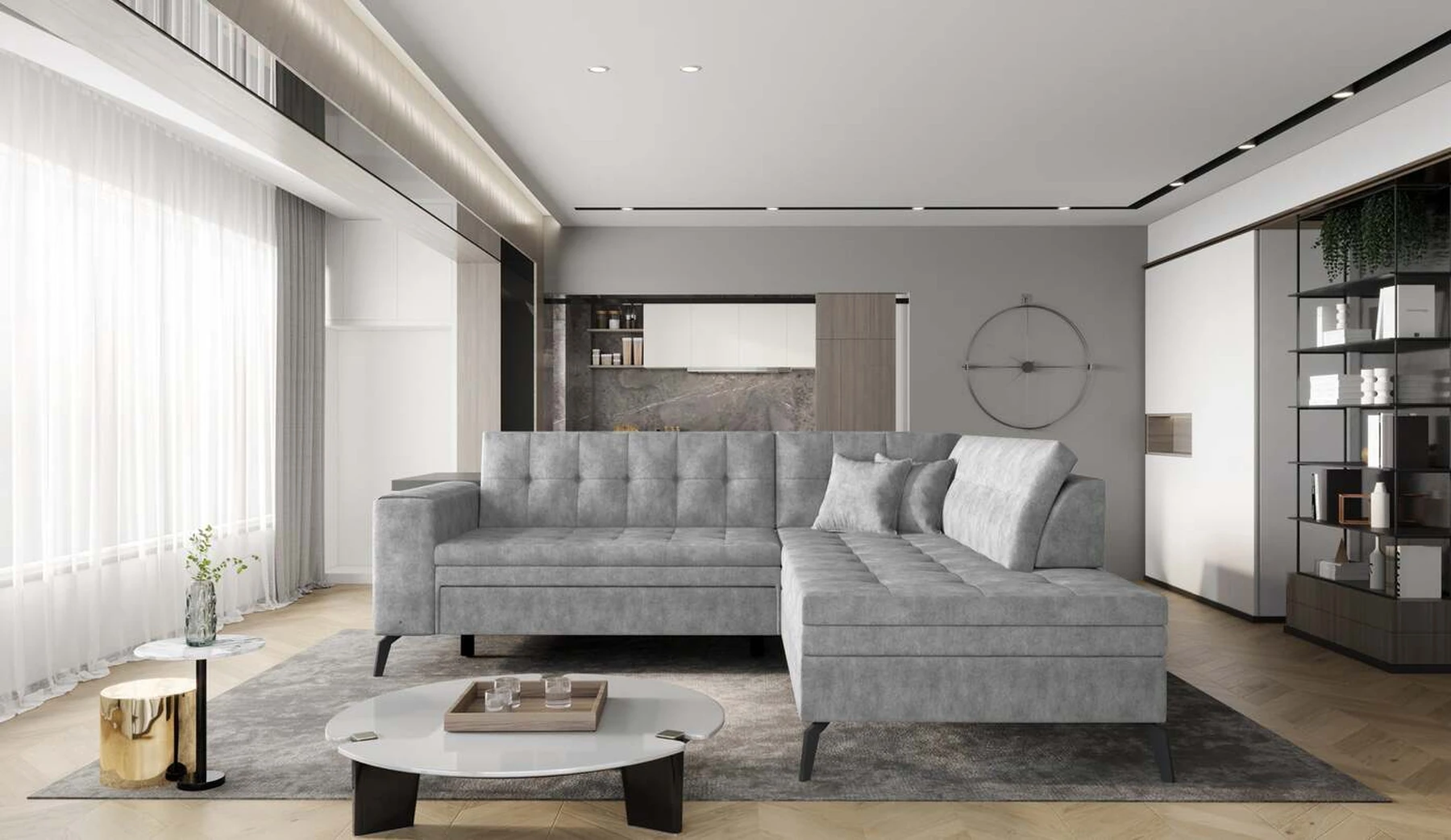EL1053 yra funkcionali, stilinga ir, svarbiausia, elegantiška kampinė sofa, skirta išrankiems komforto žinovams. Šie baldai užtikrina aukštą poilsio komfortą tiek dieną, tiek naktį. Erdvios kampinės sofos, kurios matmenys 260 x 210 x 93 cm, sėdynė pagaminta iš T30 putplasčio, kuris yra atsakingas už maksimalų komfortą, elastingumą ir deformacijų nebuvimą. Patikimos Dolphin sistemos dėka – patogų kampą galima paversti erdvia lova, kurios miegamasis paviršius yra 195 x 125 centimetrai. Atskiro paminėjimo nusipelno ir elegantiška baldų išvaizda. Visa tai dėka sėdynės ir atlošo antklodės – viena vertus, jos padaro baldą unikalų, kita vertus – labai elegantiški ir skoningi. Gaminį galima įsigyti iš visų kolekcijos audinių. EL1053 yra dėmesio vertas baldas – erdvus, praktiškas, taip pat stilingas. Tikrai verta turėti tokią unikalią kampinę sofą savo bute.