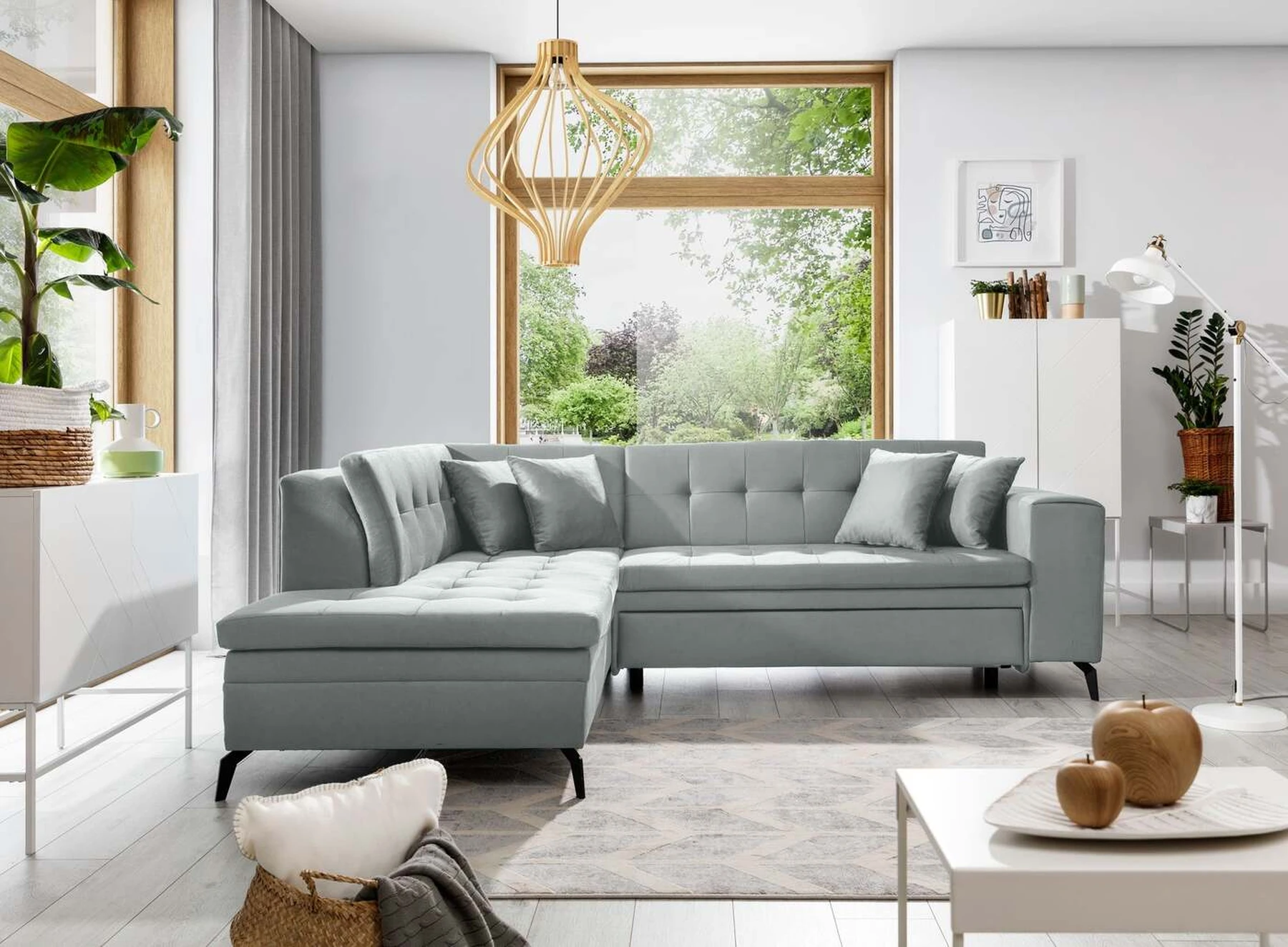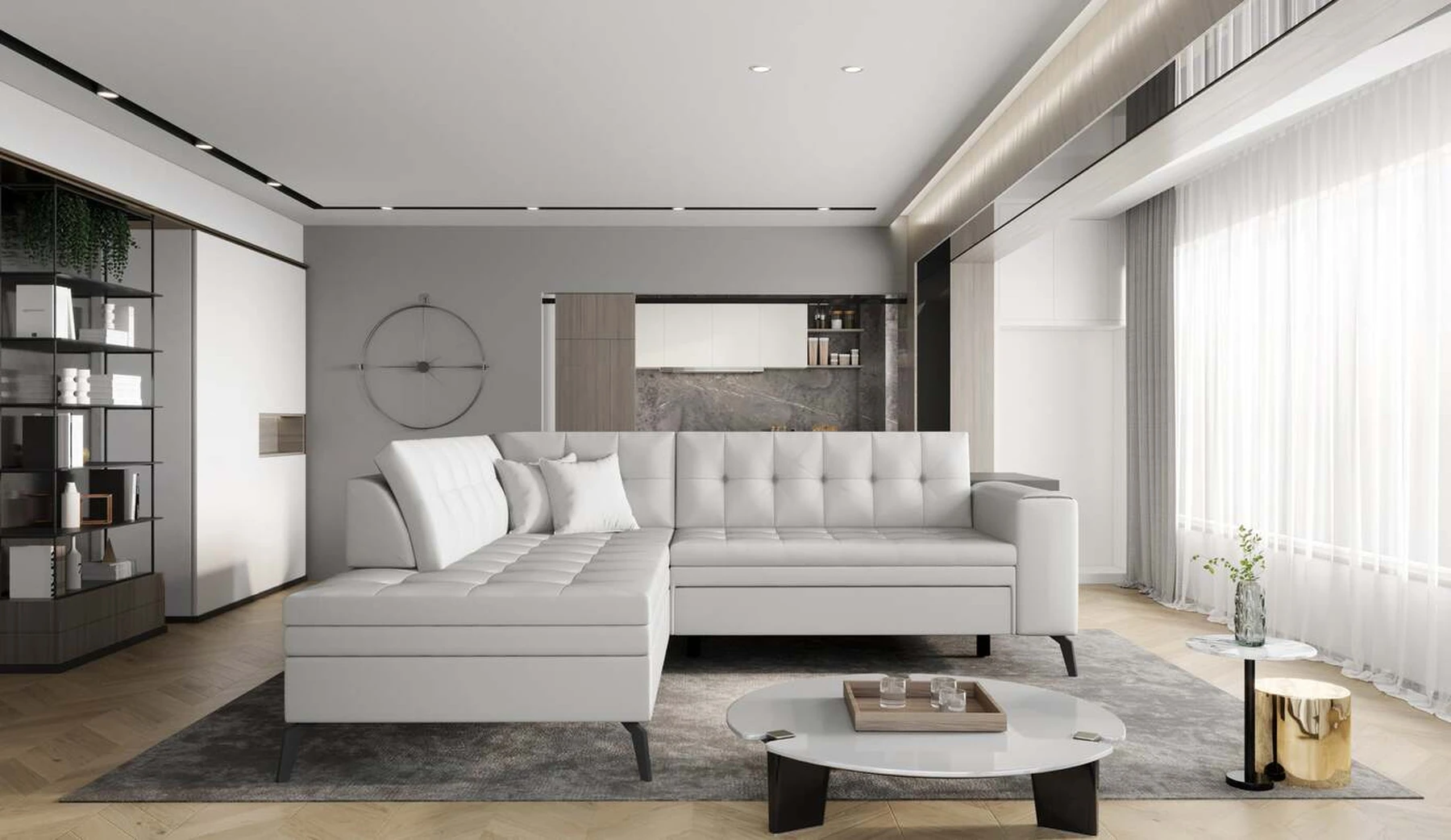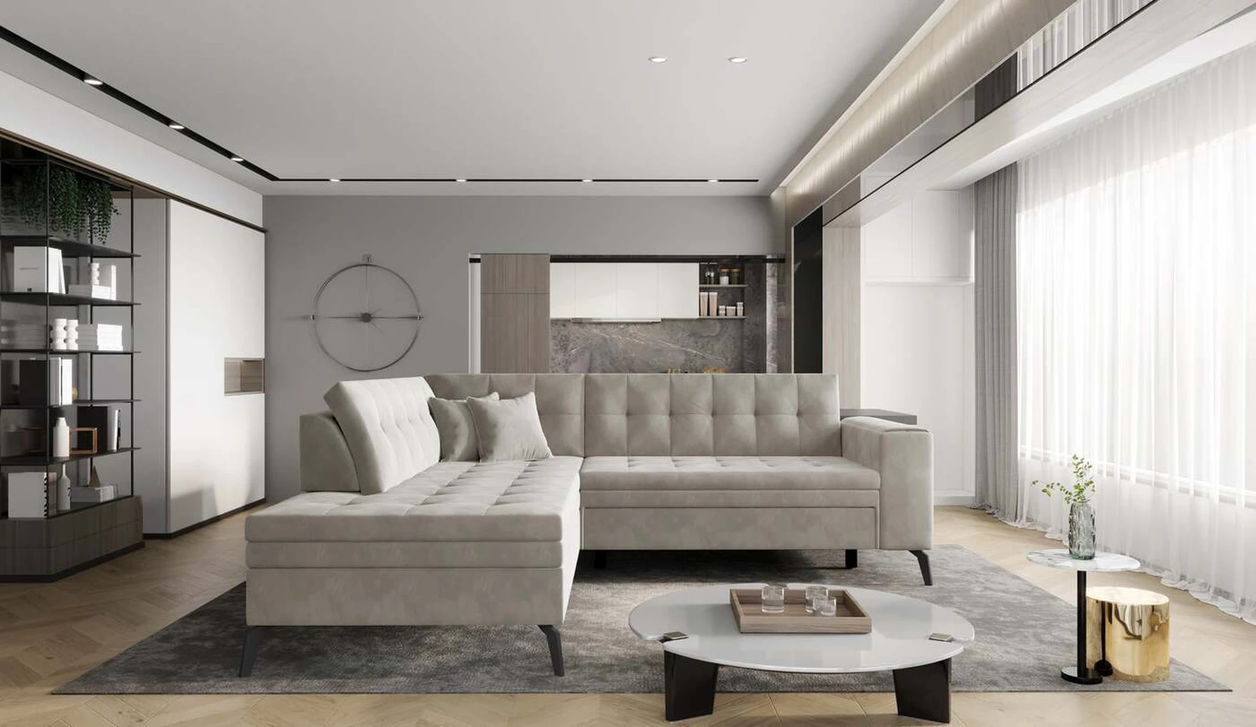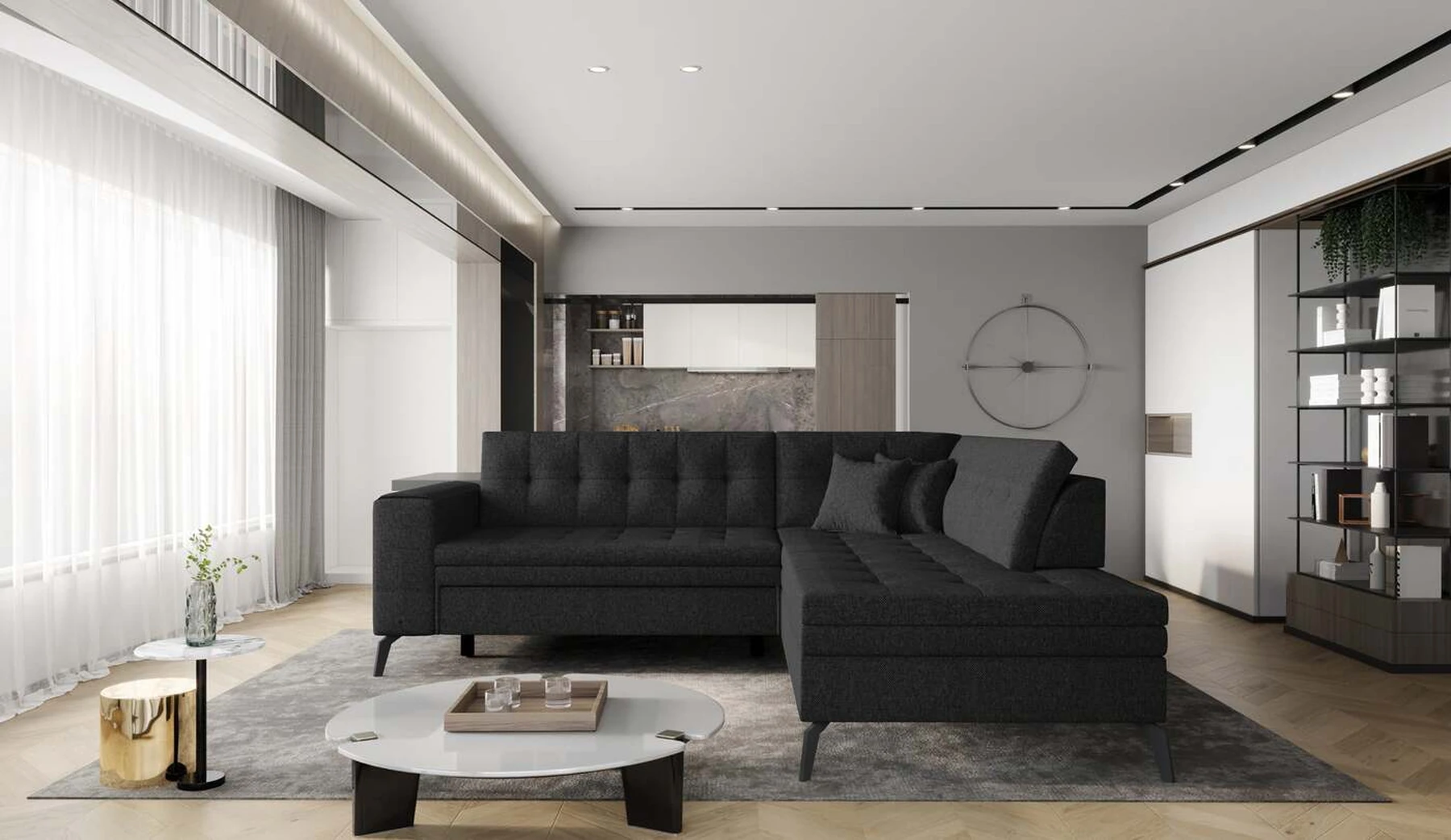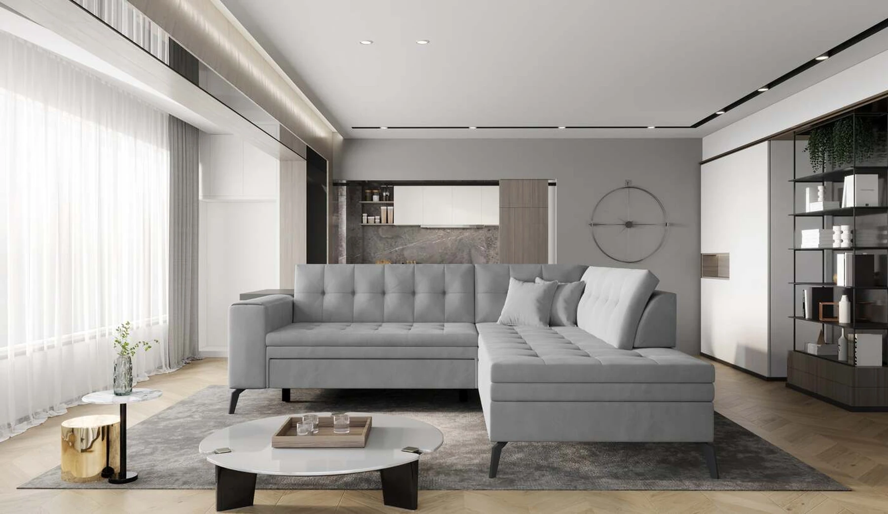 EL1053 yra funkcionali, stilinga ir, svarbiausia, elegantiška kampinė sofa, skirta išrankiems komforto žinovams. Šie baldai užtikrina aukštą poilsio komfortą tiek dieną, tiek naktį. Erdvios kampinės sofos, kurios matmenys 260 x 210 x 93 cm, sėdynė pagaminta iš T30 putplasčio, kuris yra atsakingas už maksimalų komfortą, elastingumą ir deformacijų nebuvimą. Patikimos Dolphin sistemos dėka – patogų kampą galima paversti erdvia lova, kurios miegamasis paviršius yra 195 x 125 centimetrai. Atskiro paminėjimo nusipelno ir elegantiška baldų išvaizda. Visa tai dėka sėdynės ir atlošo antklodės – viena vertus, jos padaro baldą unikalų, kita vertus – labai elegantiški ir skoningi. Gaminį galima įsigyti iš visų kolekcijos audinių. EL1053 yra dėmesio vertas baldas – erdvus, praktiškas, taip pat stilingas. Tikrai verta turėti tokią unikalią kampinę sofą savo bute.