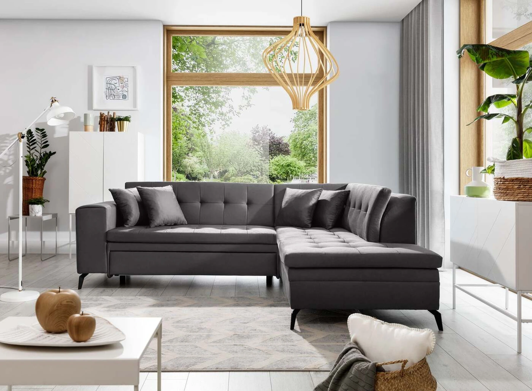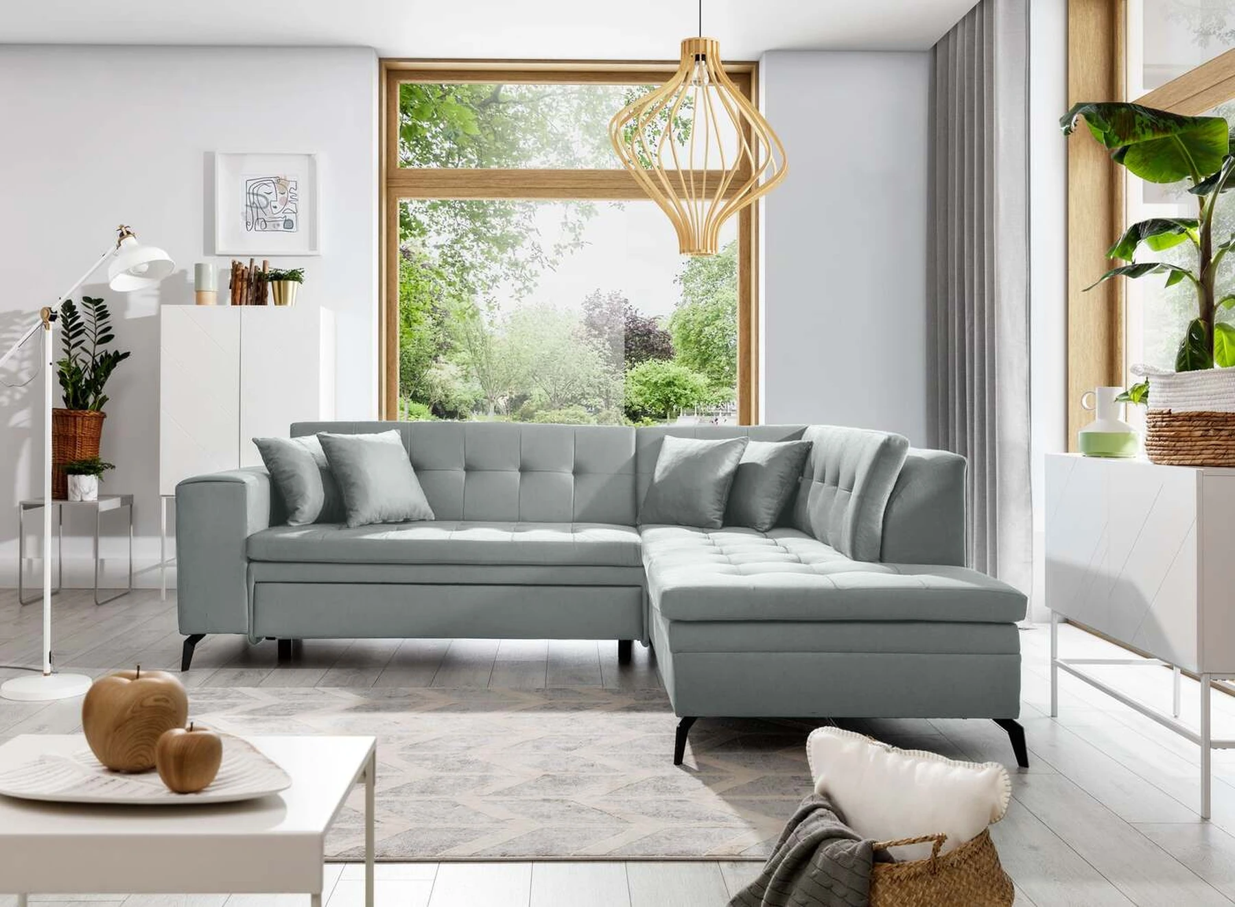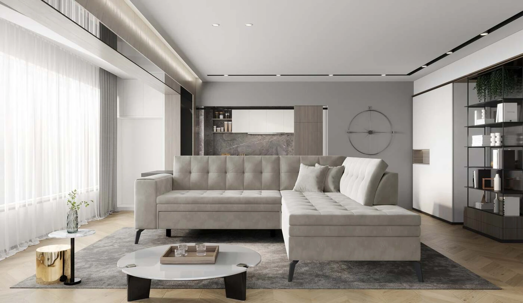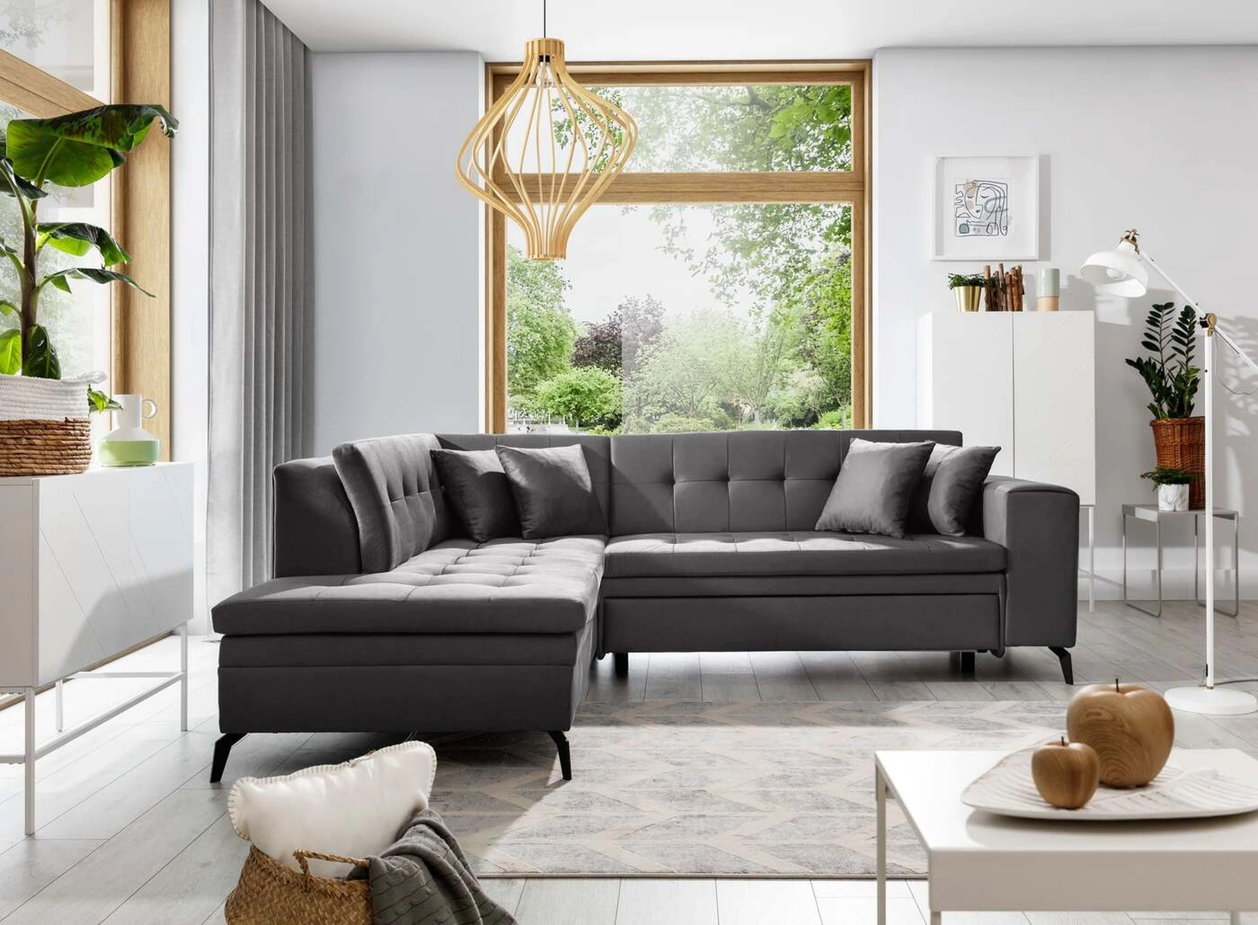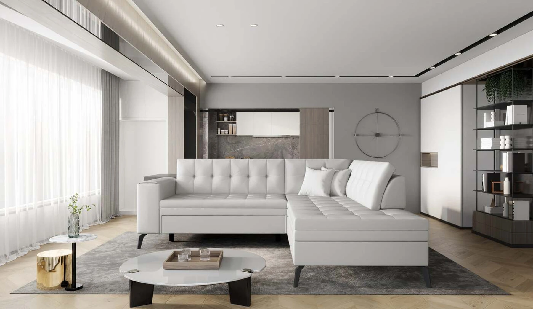 EL1053 yra funkcionali, stilinga ir, svarbiausia, elegantiška kampinė sofa, skirta išrankiems komforto žinovams. Šie baldai užtikrina aukštą poilsio komfortą tiek dieną, tiek naktį. Erdvios kampinės sofos, kurios matmenys 260 x 210 x 93 cm, sėdynė pagaminta iš T30 putplasčio, kuris yra atsakingas už maksimalų komfortą, elastingumą ir deformacijų nebuvimą. Patikimos Dolphin sistemos dėka – patogų kampą galima paversti erdvia lova, kurios miegamasis paviršius yra 195 x 125 centimetrai. Atskiro paminėjimo nusipelno ir elegantiška baldų išvaizda. Visa tai dėka sėdynės ir atlošo antklodės – viena vertus, jos padaro baldą unikalų, kita vertus – labai elegantiški ir skoningi. Gaminį galima įsigyti iš visų kolekcijos audinių. EL1053 yra dėmesio vertas baldas – erdvus, praktiškas, taip pat stilingas. Tikrai verta turėti tokią unikalią kampinę sofą savo bute.
