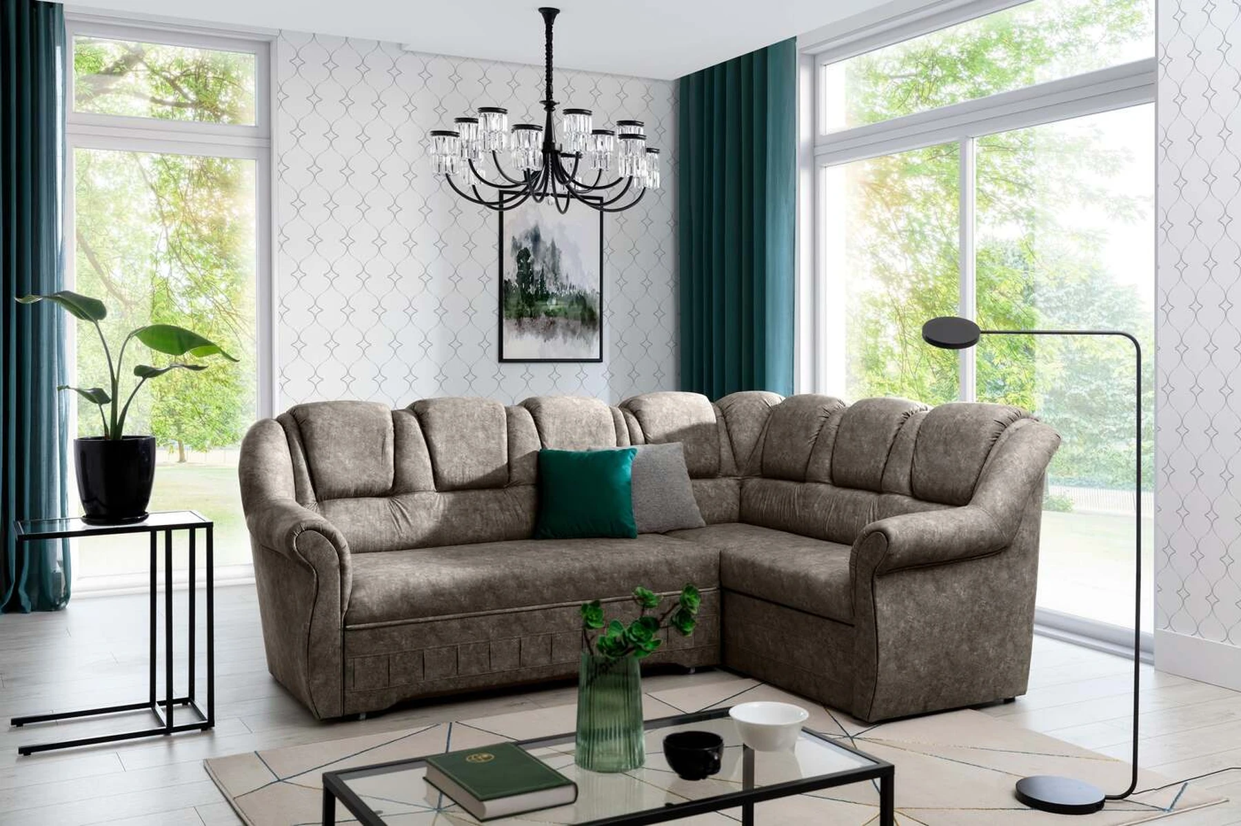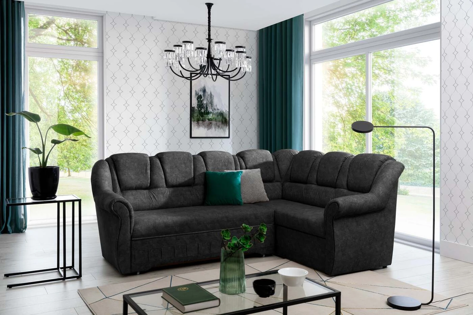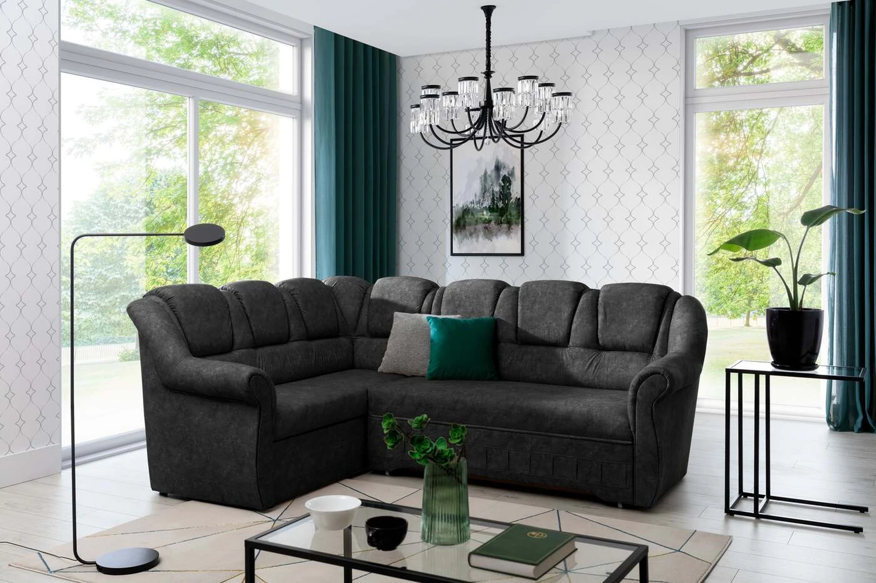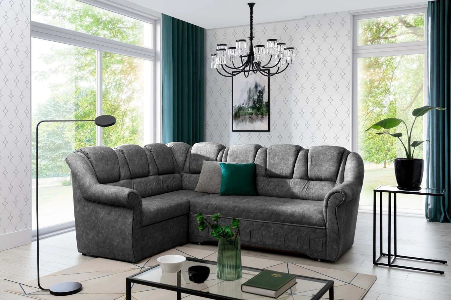 EL2950 yra patogi ir klasikinė kampinė sofa, o kartu ir išskirtinė bei funkcionali svetainės puošmena. Įdomią blokelio formą sulaužė banguota apdaila, stilingos atlošo siūlės, taip pat raukšlės palei baldus. Kampinės sofos matmenys 243 x 190 x 105 cm suteikia pakankamai erdvės poilsiui bet kuriuo dienos ar nakties metu. Šiuose balduose yra 195 x 125 cm miegojimo funkcija, taip pat talpi ir gili patalynės saugykla, esanti pufas. Delfino tipo išskleidimo funkcijos dėka baldus pritaikyti pagal esamus poreikius yra intuityvus ir nesudėtingas. Dėl gofruoto spyruoklės ir T30 putplasčio derinio kampinės sofos sėdynė yra minkšta ir lanksti. Kampinė sofa Lord – tai gero skonio, stiliaus ir klasikinių apdailos formų derinys. Tai tikrai bus tinkamas pasirinkimas tradicinei buto apdailai.