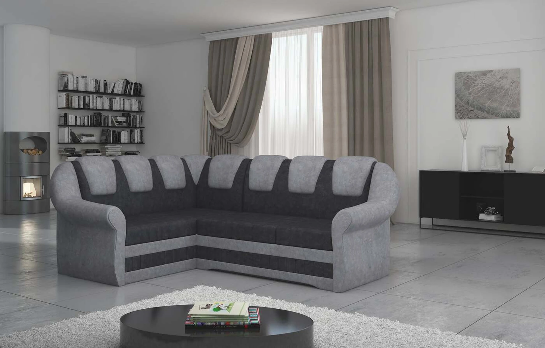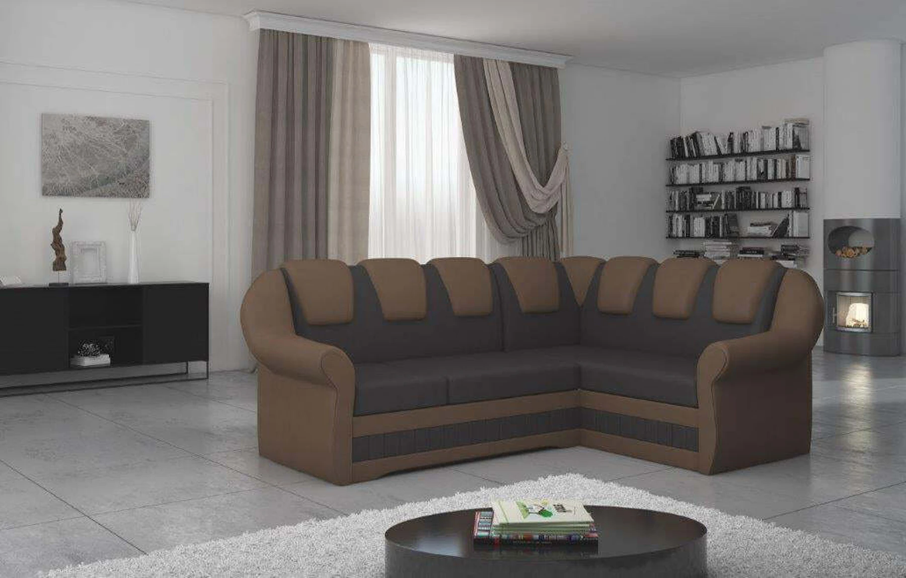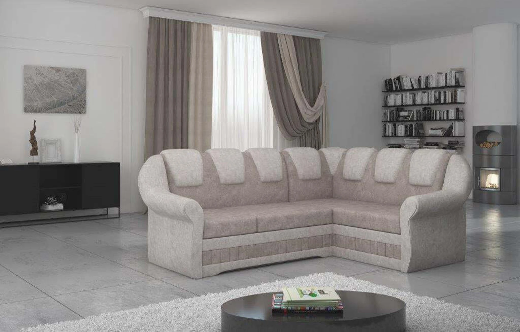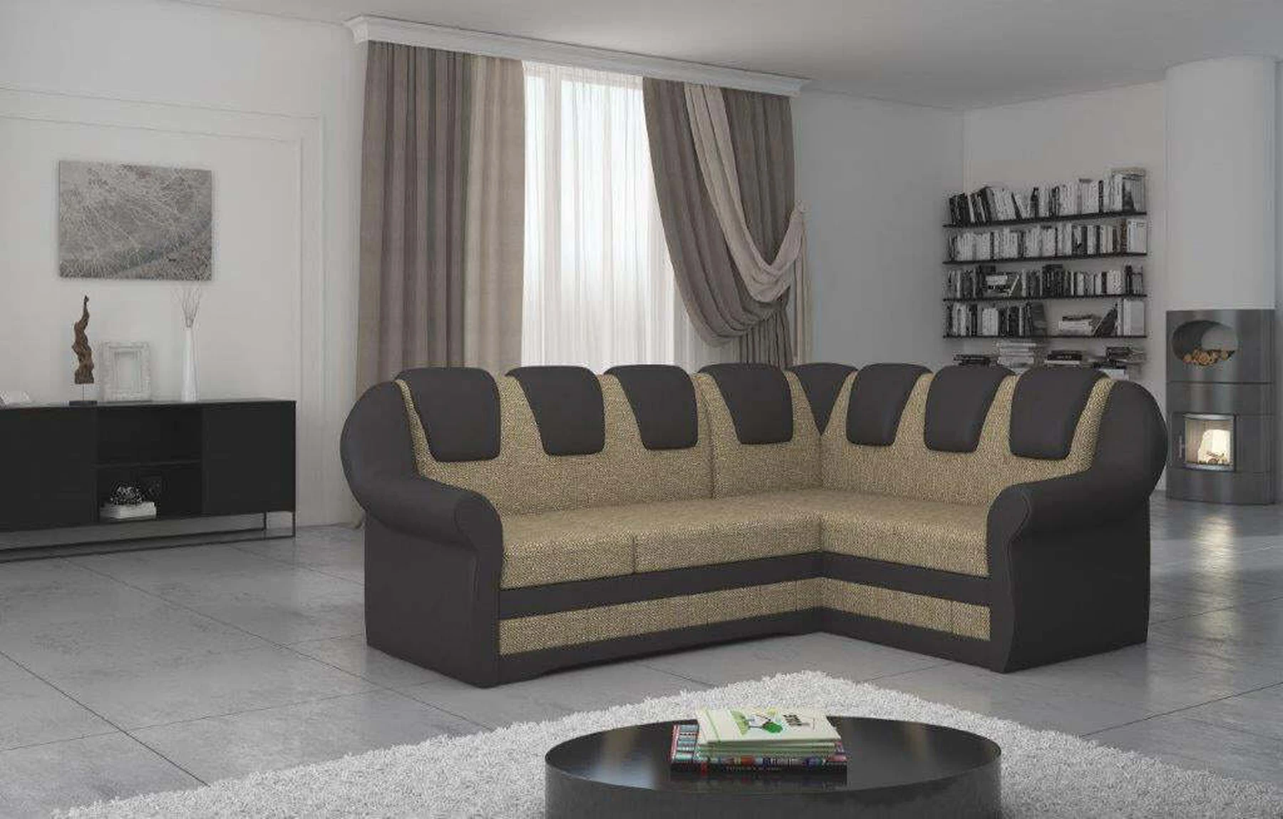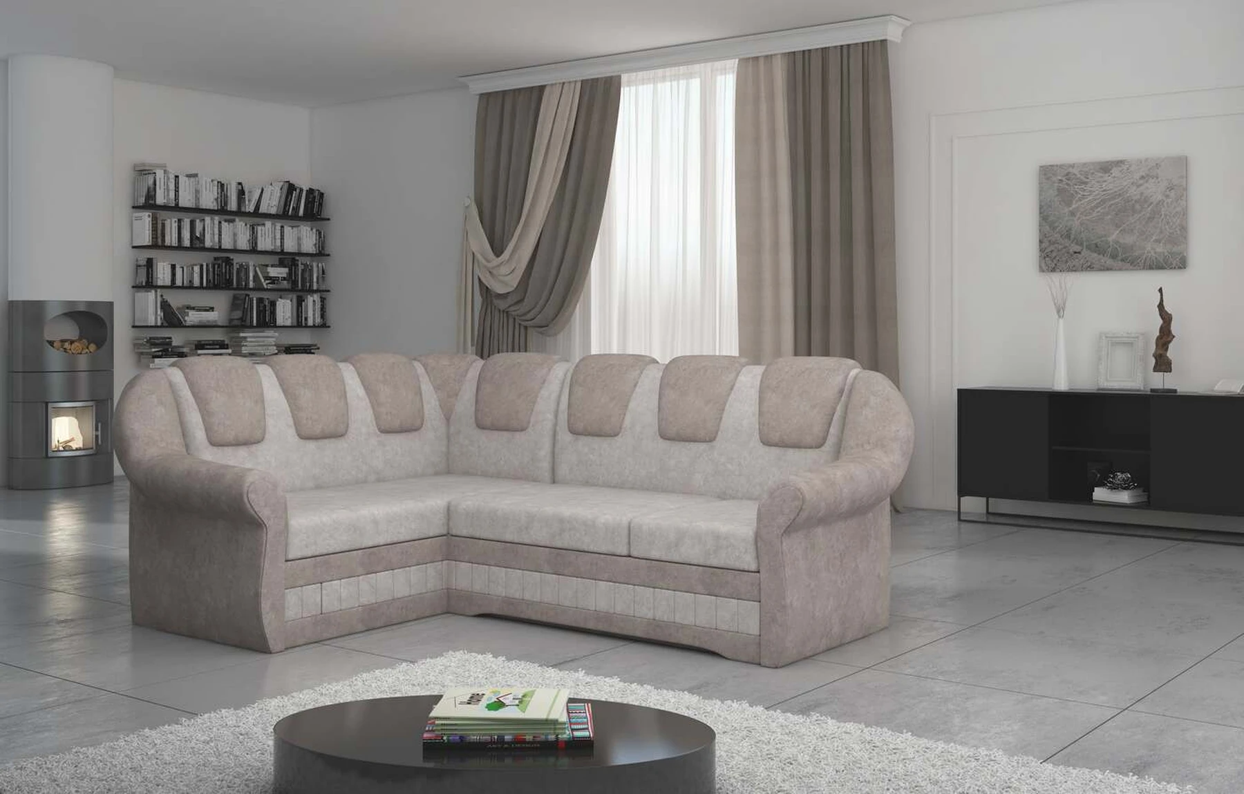 EL2950 yra patogi ir klasikinė kampinė sofa, o kartu ir išskirtinė bei funkcionali svetainės puošmena. Įdomią blokelio formą sulaužė banguota apdaila, stilingos atlošo siūlės, taip pat raukšlės palei baldus. Kampinės sofos matmenys 243 x 190 x 105 cm suteikia pakankamai erdvės poilsiui bet kuriuo dienos ar nakties metu. Šiuose balduose yra 195 x 125 cm miegojimo funkcija, taip pat talpi ir gili patalynės saugykla, esanti pufas. Delfino tipo išskleidimo funkcijos dėka baldus pritaikyti pagal esamus poreikius yra intuityvus ir nesudėtingas. Dėl gofruoto spyruoklės ir T30 putplasčio derinio kampinės sofos sėdynė yra minkšta ir lanksti. Kampinė sofa Lord – tai gero skonio, stiliaus ir klasikinių apdailos formų derinys. Tai tikrai bus tinkamas pasirinkimas tradicinei buto apdailai.