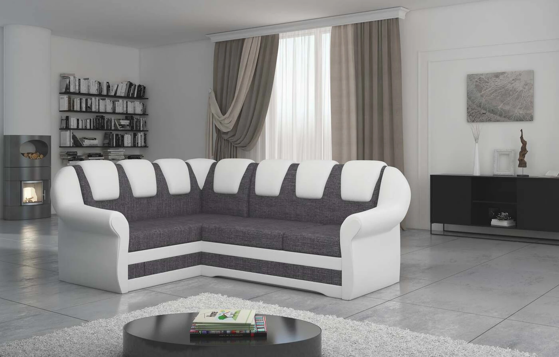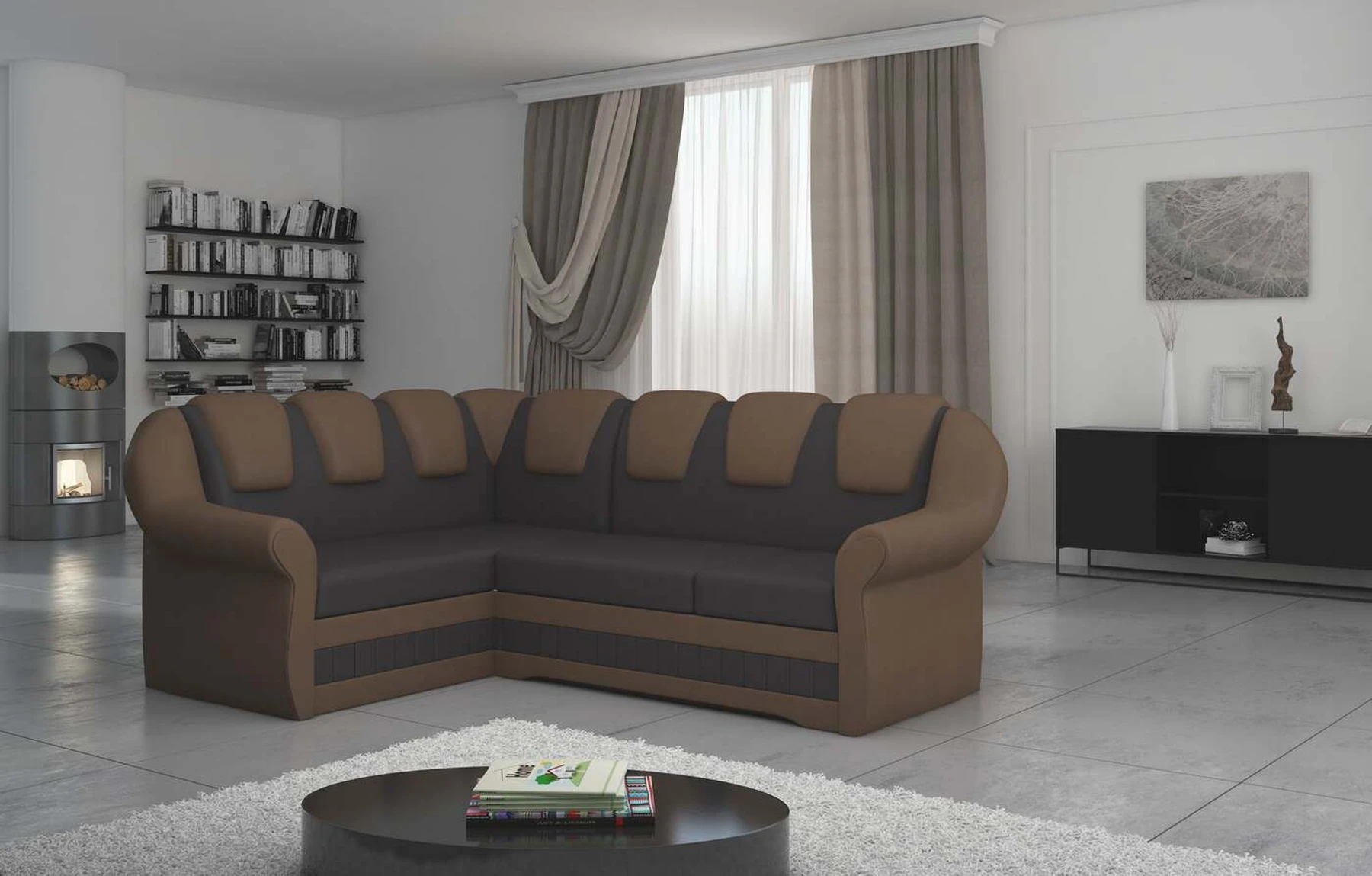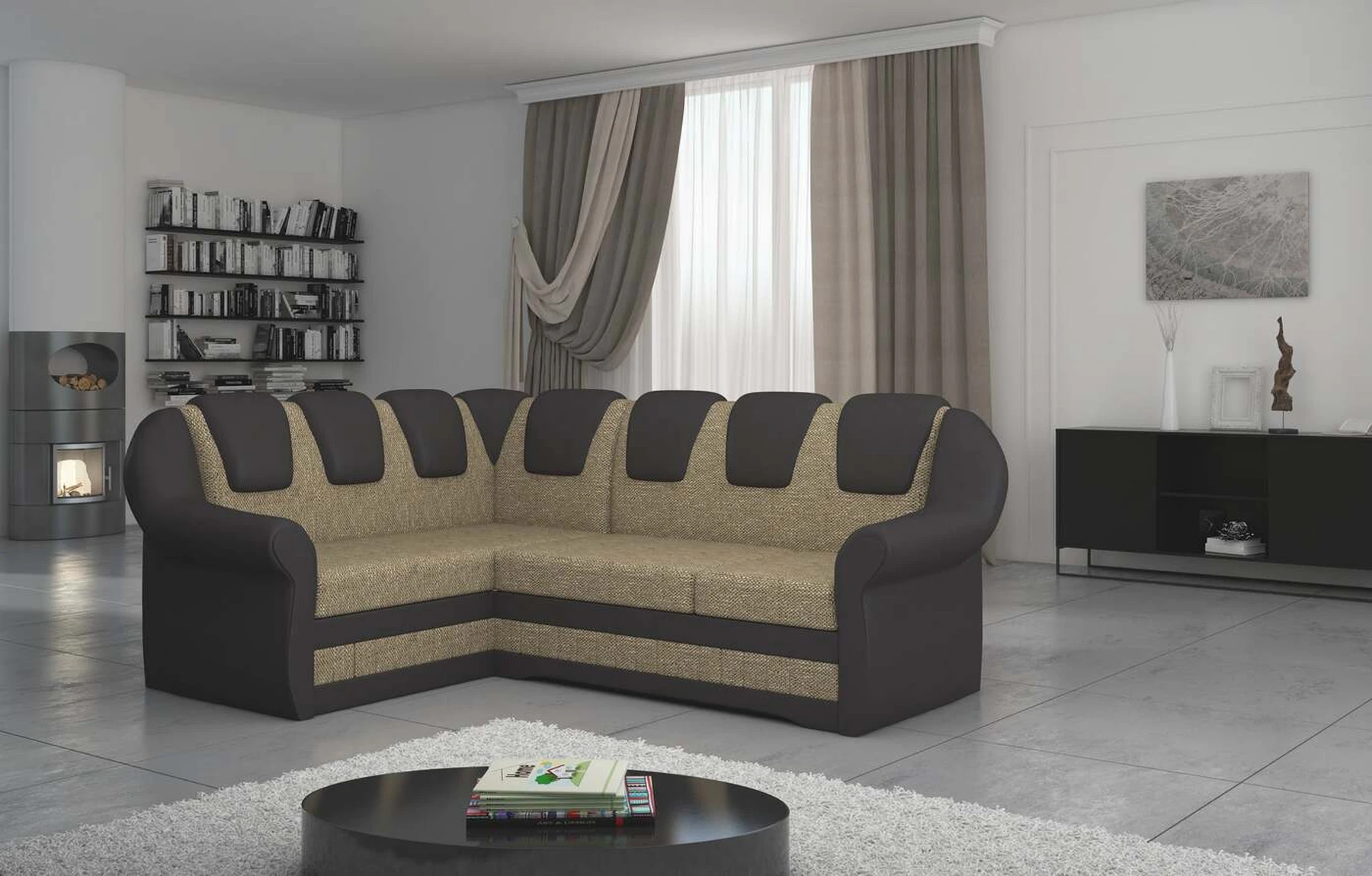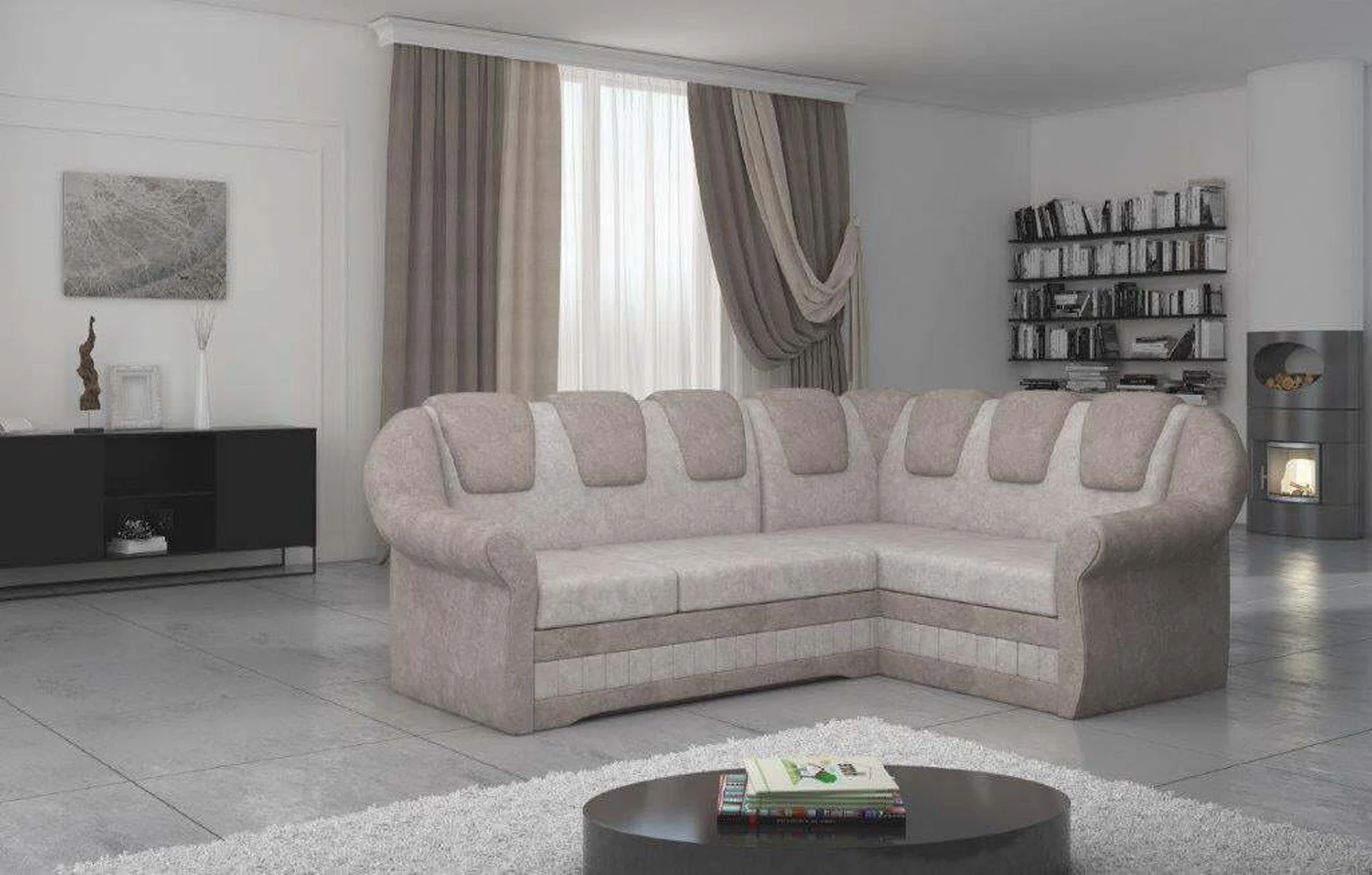 EL2950 yra patogi ir klasikinė kampinė sofa, o kartu ir išskirtinė bei funkcionali svetainės puošmena. Įdomią blokelio formą sulaužė banguota apdaila, stilingos atlošo siūlės, taip pat raukšlės palei baldus. Kampinės sofos matmenys 243 x 190 x 105 cm suteikia pakankamai erdvės poilsiui bet kuriuo dienos ar nakties metu. Šiuose balduose yra 195 x 125 cm miegojimo funkcija, taip pat talpi ir gili patalynės saugykla, esanti pufas. Delfino tipo išskleidimo funkcijos dėka baldus pritaikyti pagal esamus poreikius yra intuityvus ir nesudėtingas. Dėl gofruoto spyruoklės ir T30 putplasčio derinio kampinės sofos sėdynė yra minkšta ir lanksti. Kampinė sofa Lord – tai gero skonio, stiliaus ir klasikinių apdailos formų derinys. Tai tikrai bus tinkamas pasirinkimas tradicinei buto apdailai.