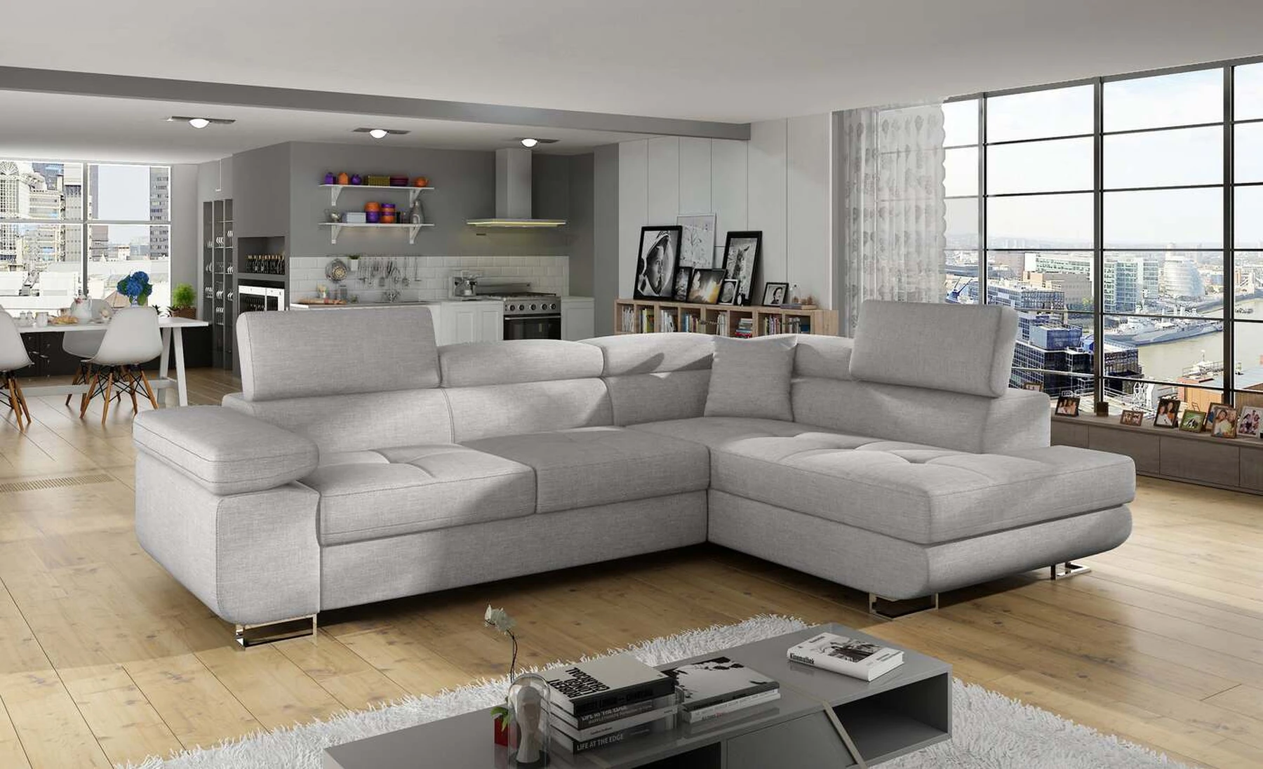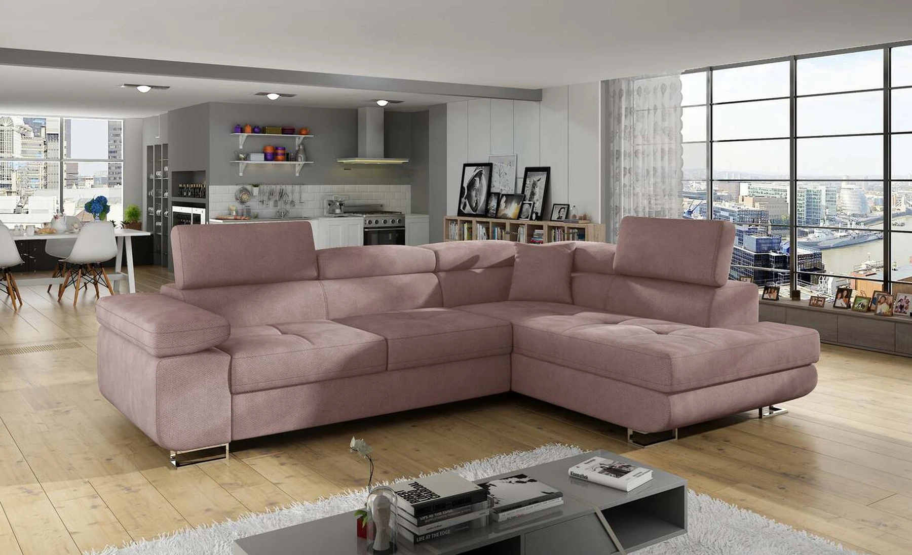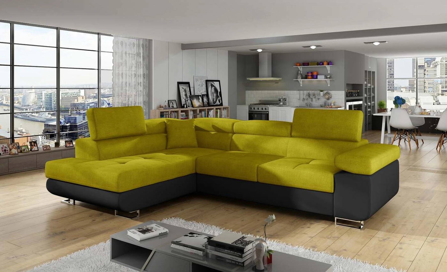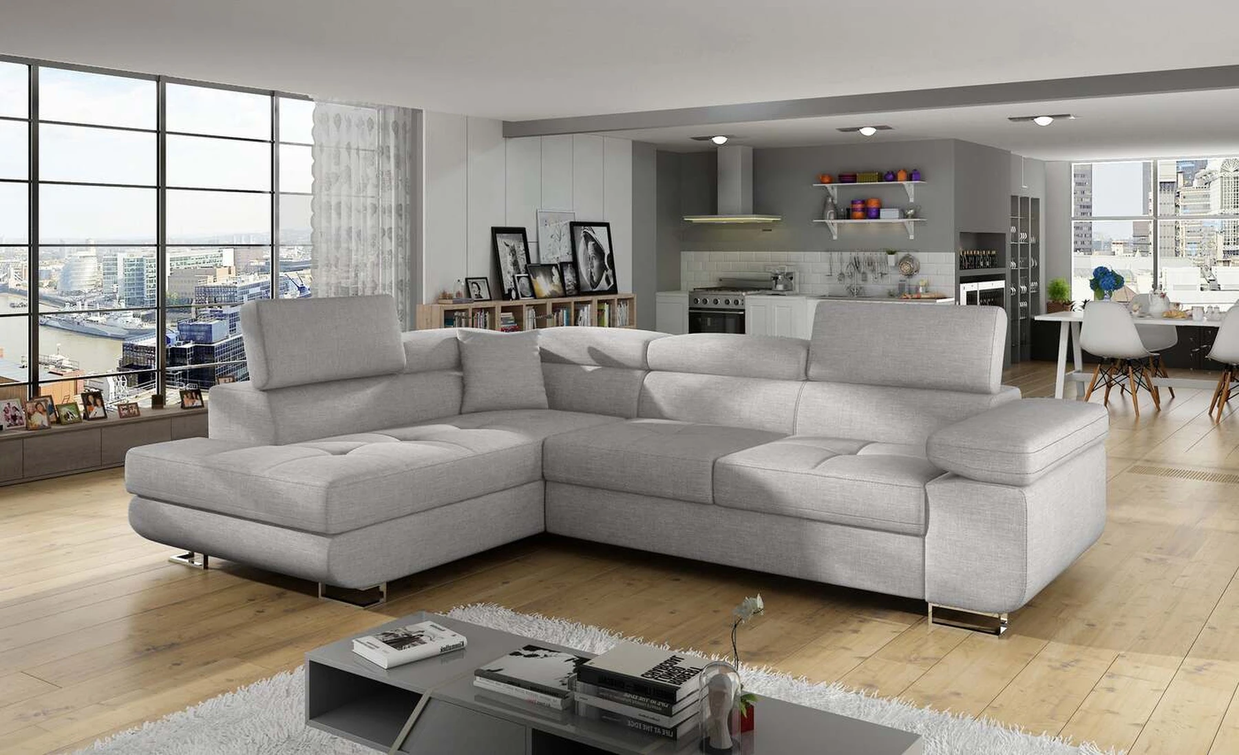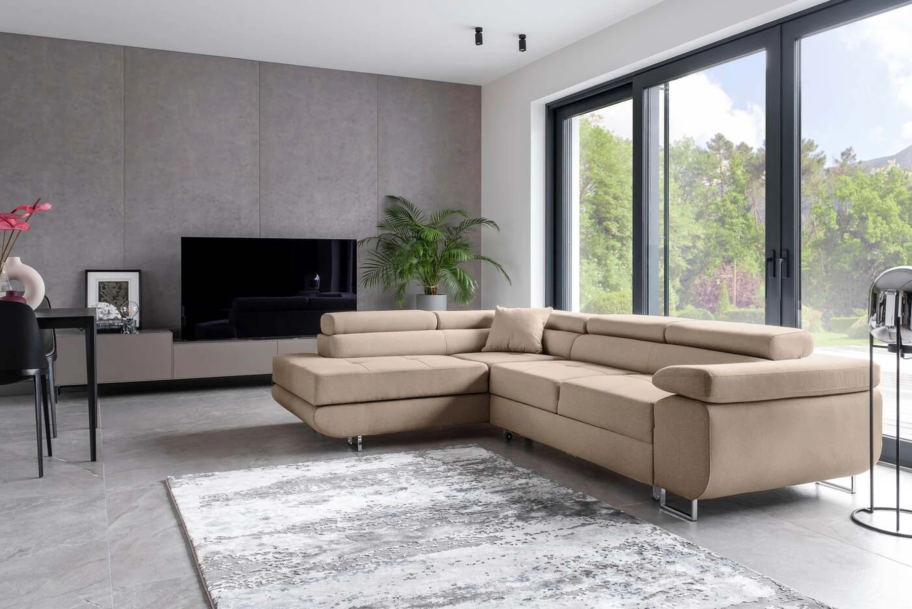 EL3550 yra daugiafunkcė ir erdvi kampinė sofa-lova, pagaminta modernaus stiliaus. Tai yra aukštos kokybės ir maksimalaus komforto sinonimas dėl plačios 60 cm gylio sėdynės ir itin elastingos T30 putos. EL3550, išmatavimai 275 x 202 x 90 cm su didele 125 x 193 cm miegamąja zona, reiškia gerai išsimiegoti. Balduose taip pat yra didelis skyrius patalynei. Didžiausią jaučiamo komforto efektą, be kita ko, įtakoja aukštos reguliuojamos galvos atramos, 28 centimetrų pločio porankiai, taip pat 9 cm aukščio metalinės kojos. Jei susidomėjote, ką dar siūlo EL3550 – raginame rinktis mūsų kampinę sofą-lovą.