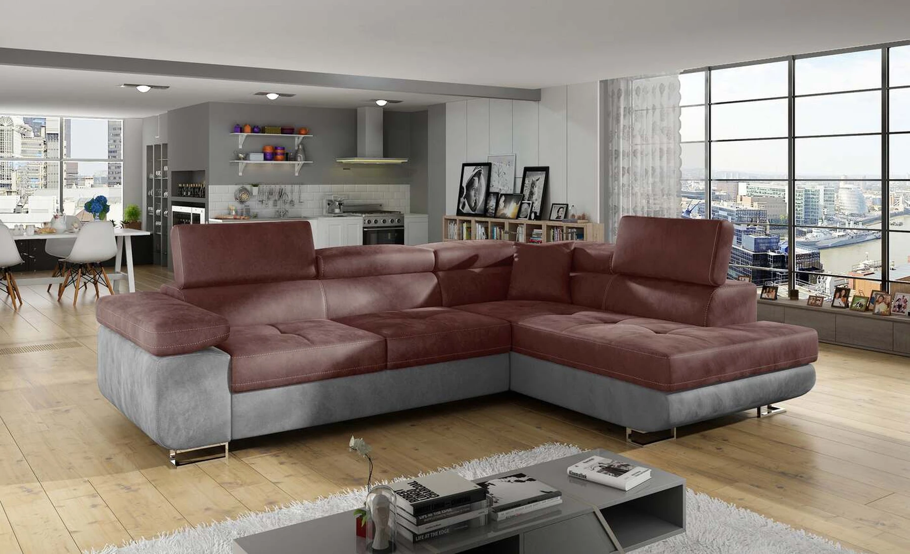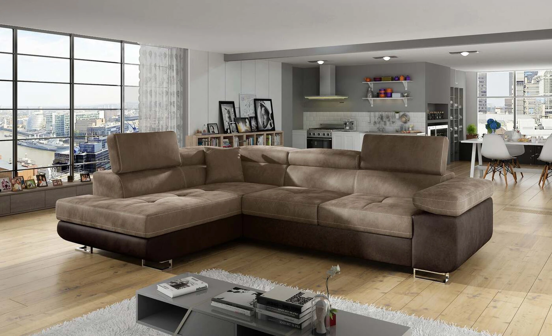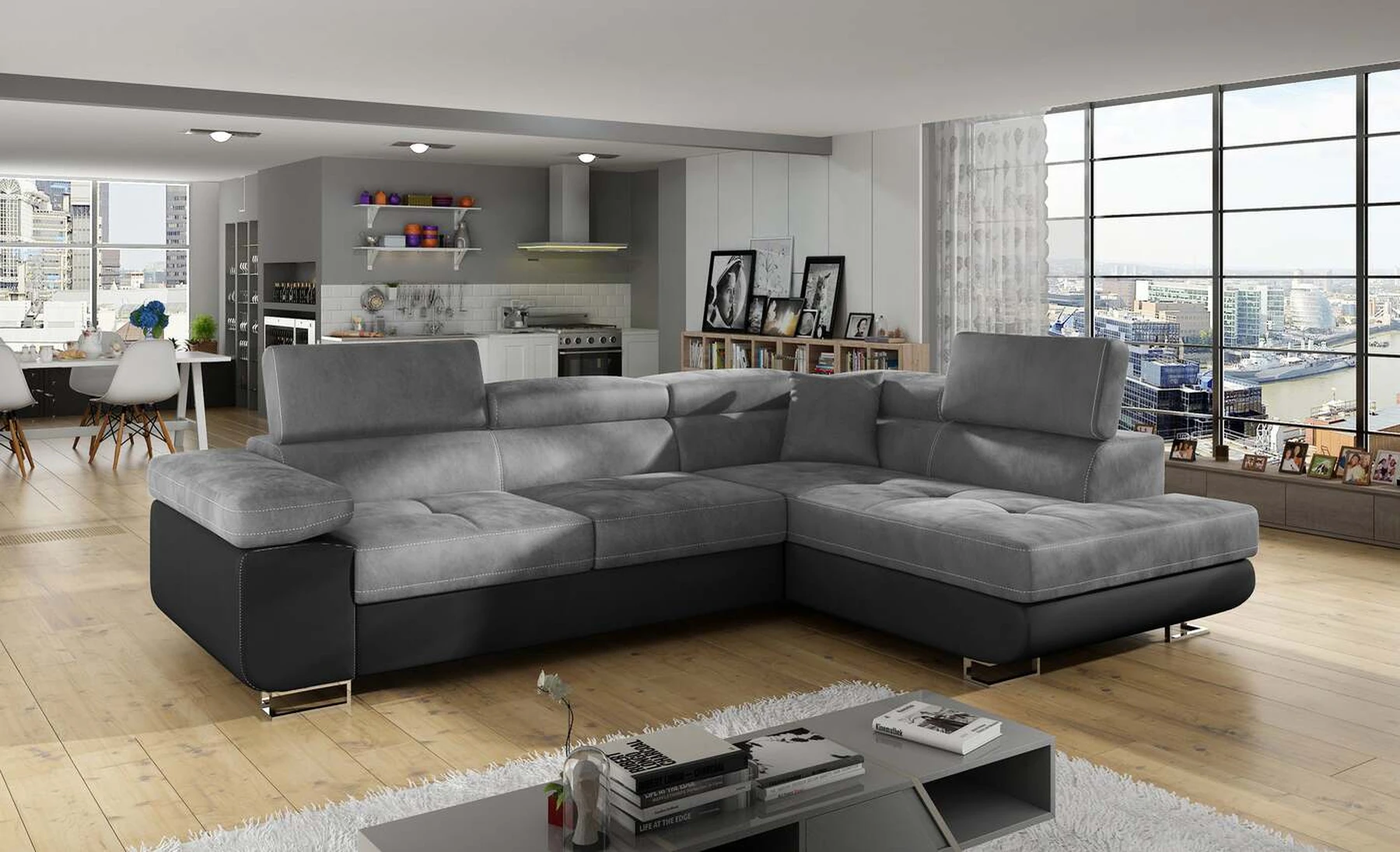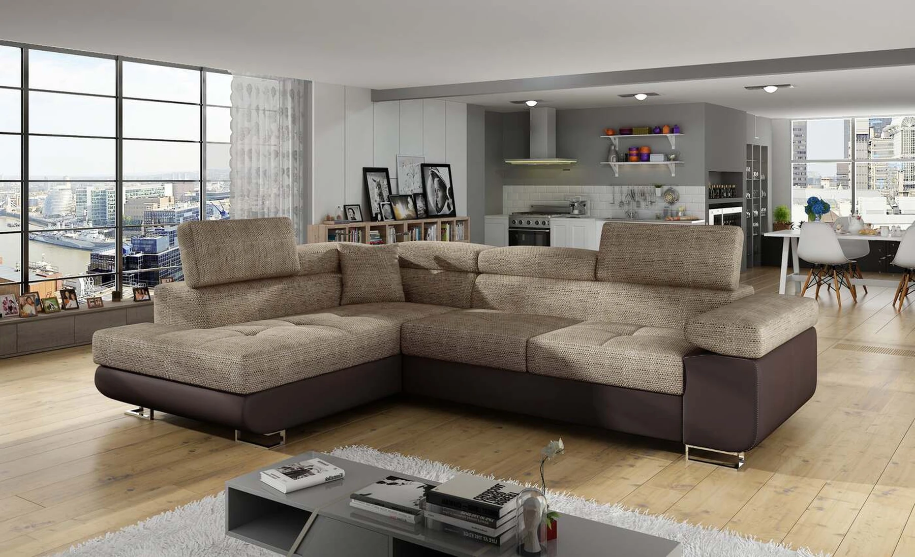 EL3550 yra daugiafunkcė ir erdvi kampinė sofa-lova, pagaminta modernaus stiliaus. Tai yra aukštos kokybės ir maksimalaus komforto sinonimas dėl plačios 60 cm gylio sėdynės ir itin elastingos T30 putos. EL3550, išmatavimai 275 x 202 x 90 cm su didele 125 x 193 cm miegamąja zona, reiškia gerai išsimiegoti. Balduose taip pat yra didelis skyrius patalynei. Didžiausią jaučiamo komforto efektą, be kita ko, įtakoja aukštos reguliuojamos galvos atramos, 28 centimetrų pločio porankiai, taip pat 9 cm aukščio metalinės kojos. Jei susidomėjote, ką dar siūlo EL3550 – raginame rinktis mūsų kampinę sofą-lovą.