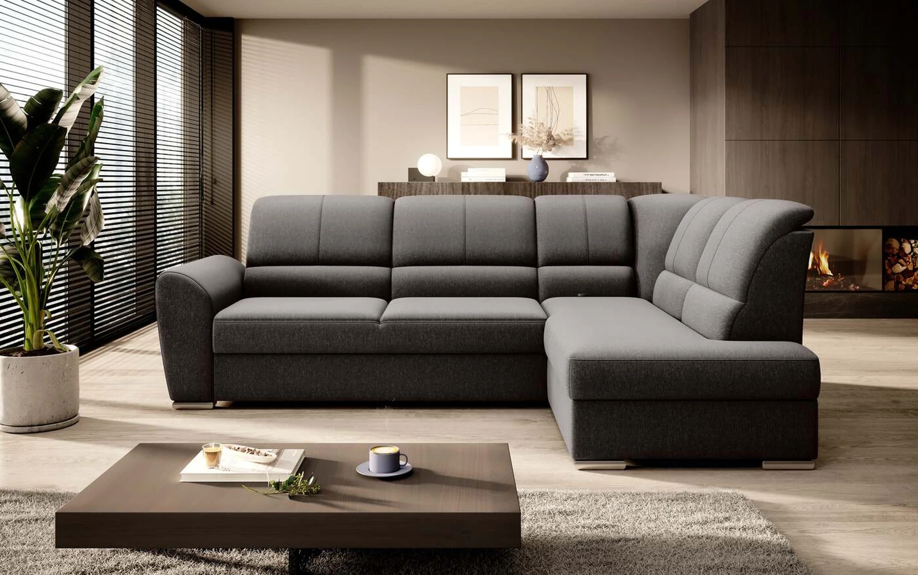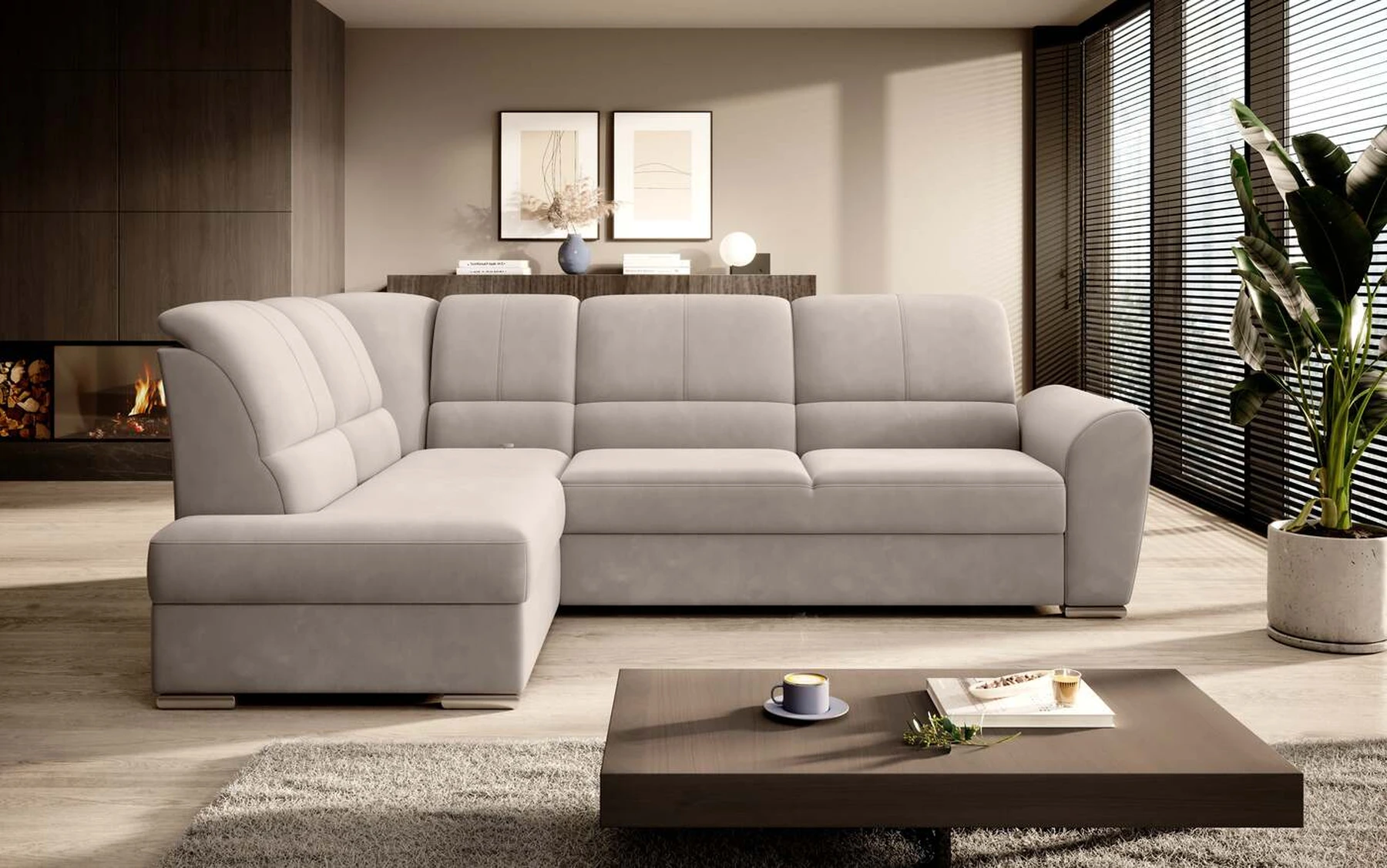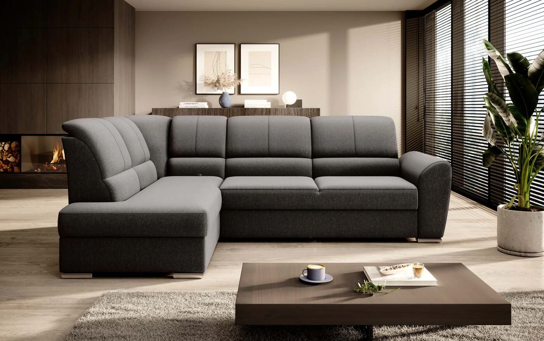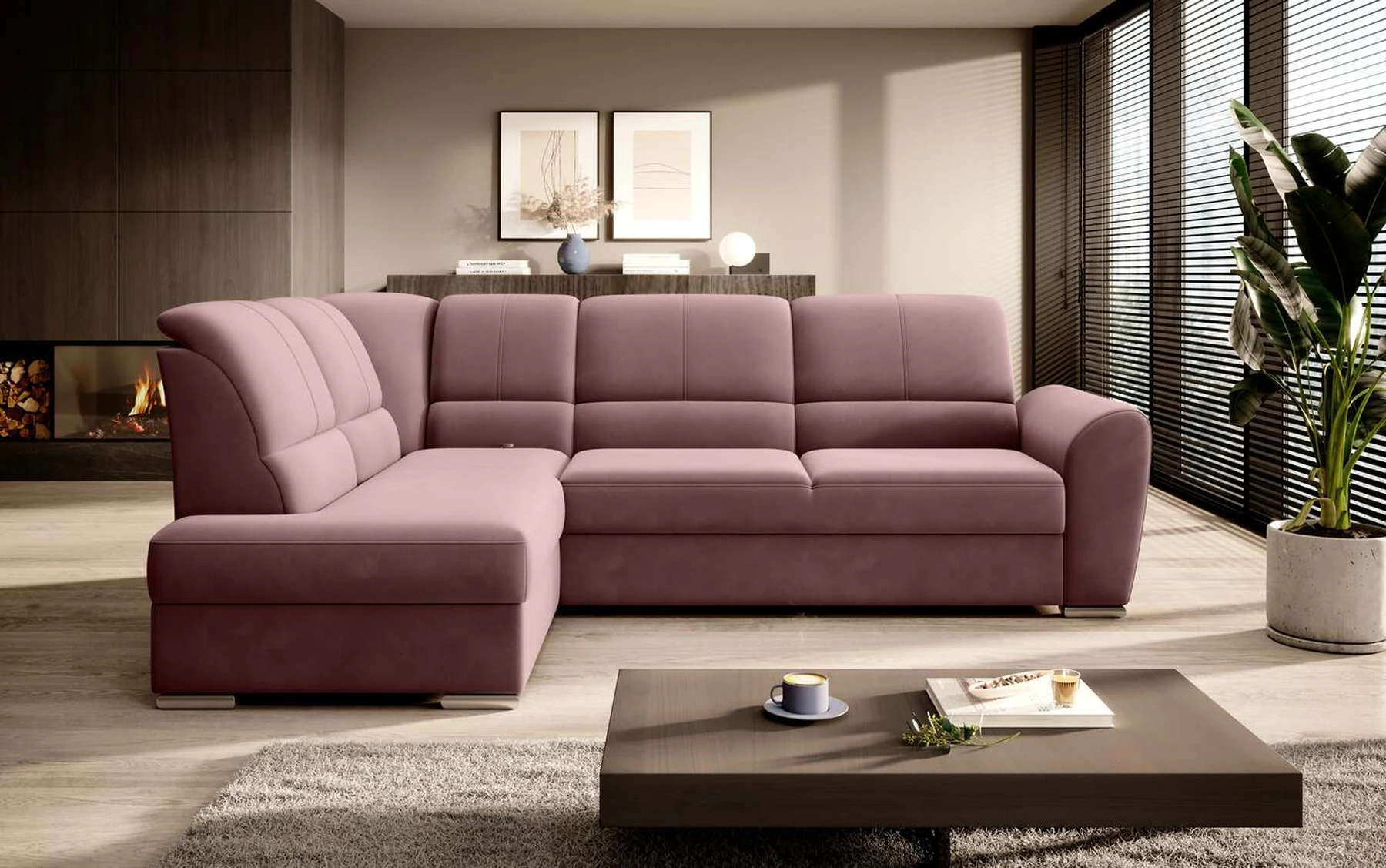 Kampinė sofa EL4636 yra puikus sprendimas žmonėms, kurie vertina tvarką ir organizuotumą. Tai padeda sutaupyti vietos dėl didelio patalynės konteinerio. Aukšto profilio reguliuojami atlošai, dekoruoti stilingomis siūlėmis, net valandas pailsės su mėgstamais TV serialais patogia ir patogia patirtimi. Kampinės sofos išmatavimai: 270 x 186 x 93 cm, leidžianti ramiai ilsėtis didesniam žmonių skaičiui be papildomo poilsio baldų. Be to, kampinė sofa gali tapti papildoma lova dėl sulankstomos miegojimo funkcijos, kurios plotas 205 x 125 cm. Šiame balde naudojamas delfinų sulankstymo mechanizmas yra puikus ir paprastas būdas kampinę sofą paversti viso dydžio lova. Taip pat verta paminėti reguliuojamus atlošus, kurie gali padėti patogiai atsipalaiduoti skaitant knygą ar žiūrint televizorių. Įdomūs šio baldo elementai yra 5 cm aukščio medinės kojelės, taip pat sėdynė, užpildyta T30 putplasčiu, užtikrinančiu puikų elastingumą ir didelį tankį.