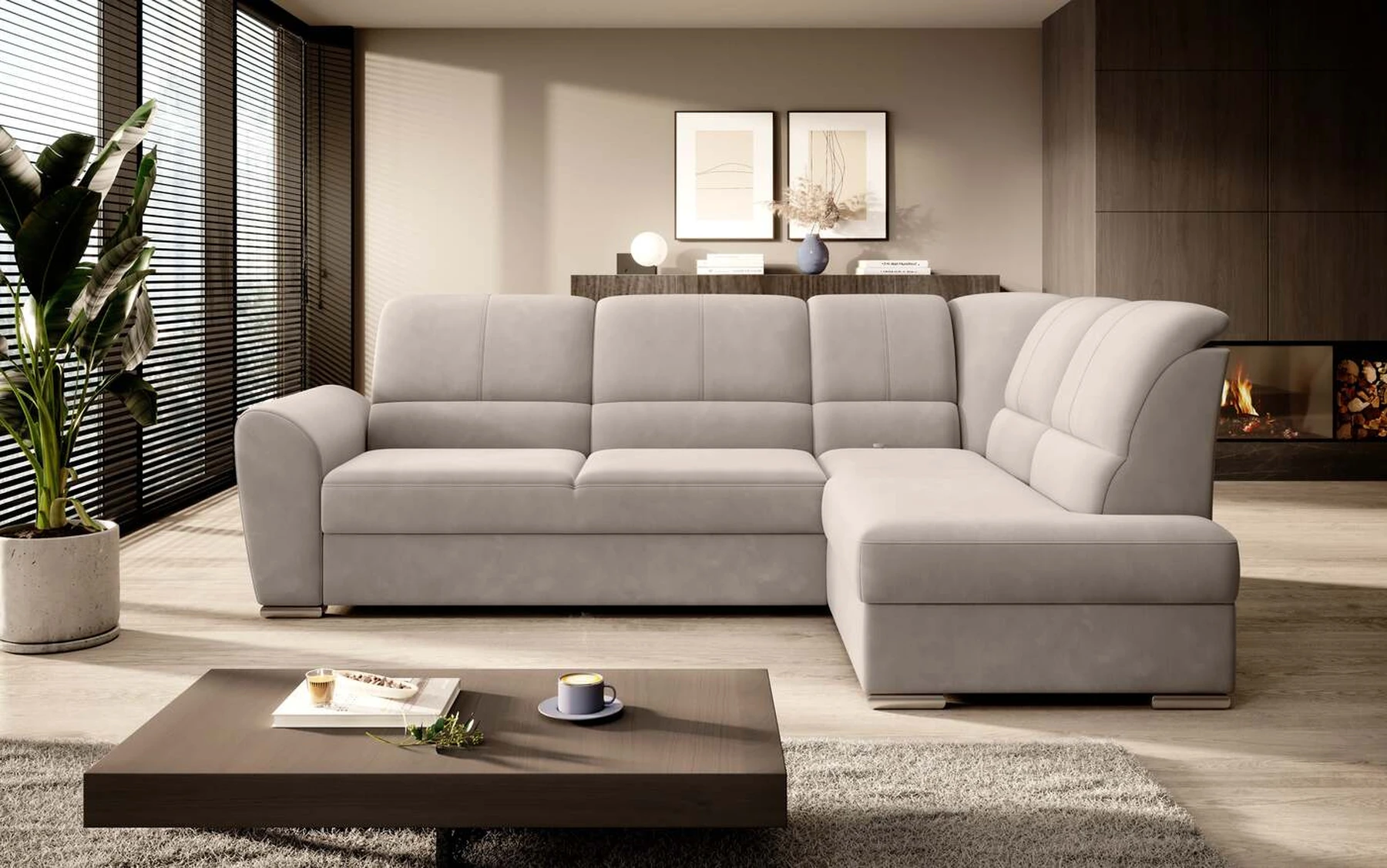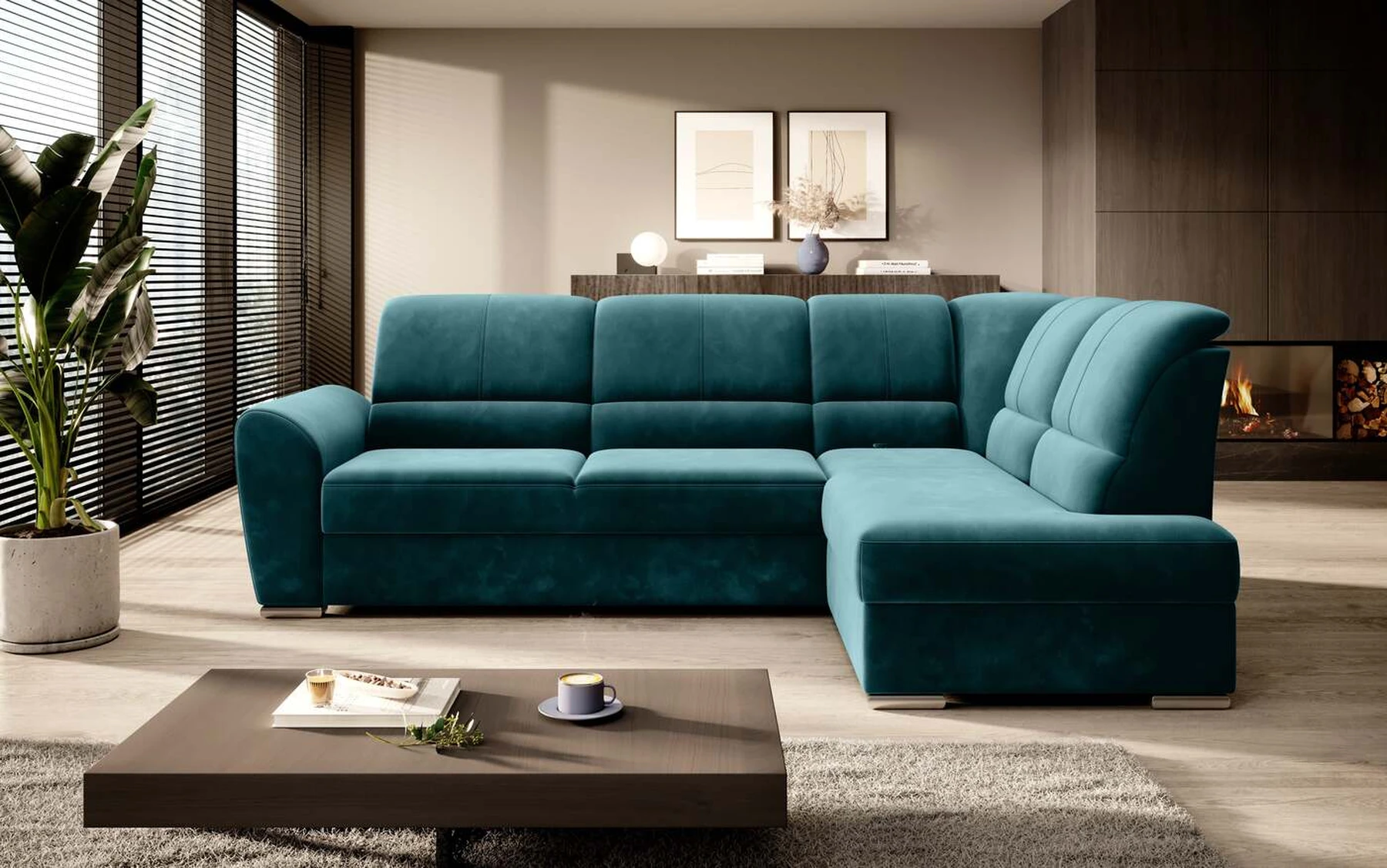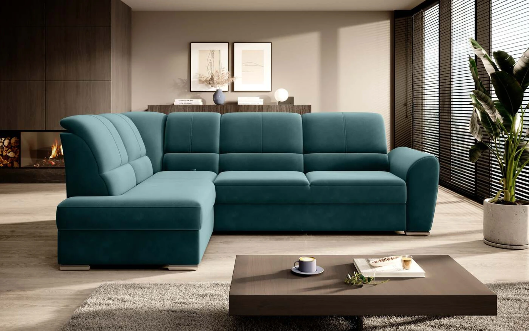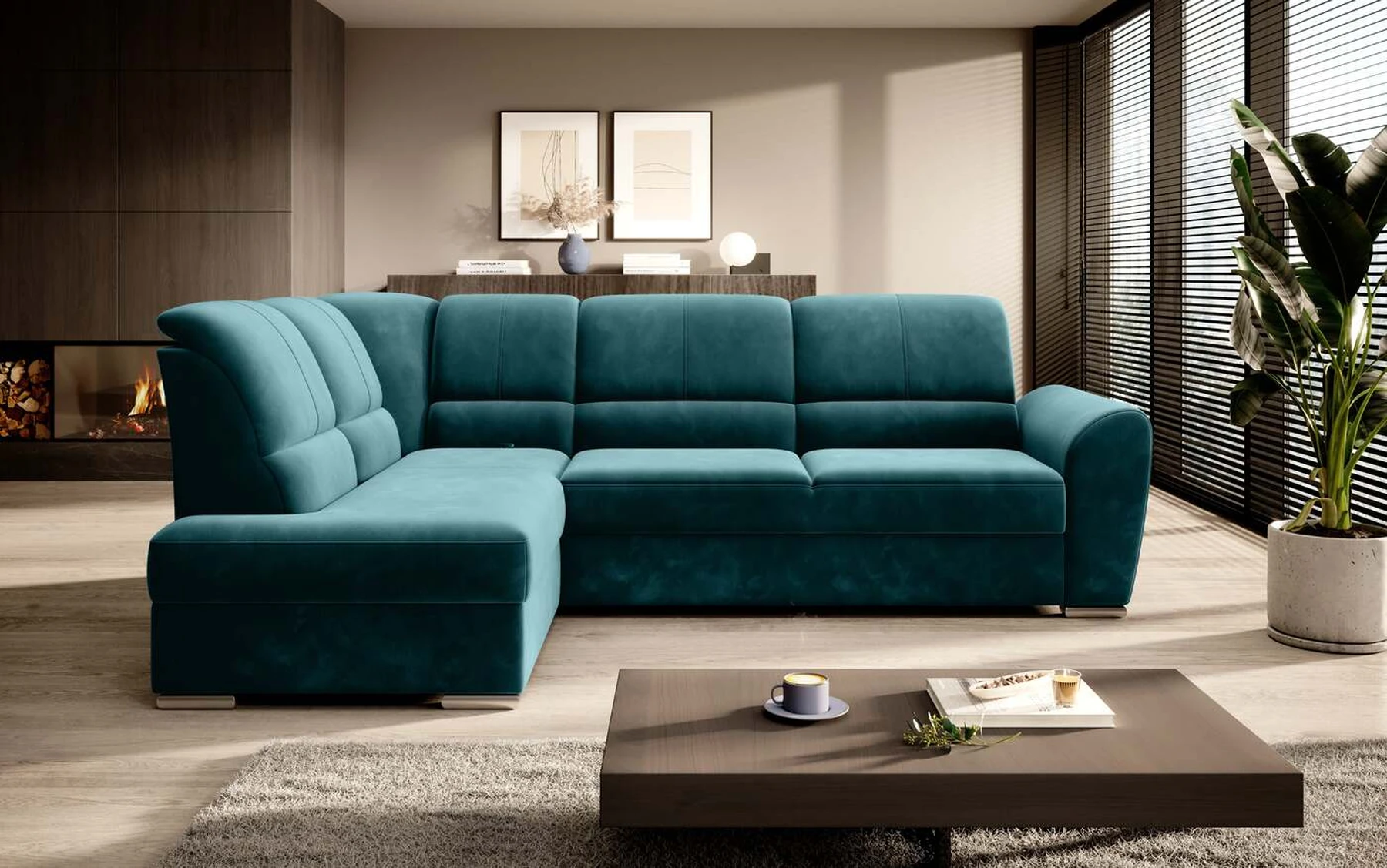 Kampinė sofa EL4636 yra puikus sprendimas žmonėms, kurie vertina tvarką ir organizuotumą. Tai padeda sutaupyti vietos dėl didelio patalynės konteinerio. Aukšto profilio reguliuojami atlošai, dekoruoti stilingomis siūlėmis, net valandas pailsės su mėgstamais TV serialais patogia ir patogia patirtimi. Kampinės sofos išmatavimai: 270 x 186 x 93 cm, leidžianti ramiai ilsėtis didesniam žmonių skaičiui be papildomo poilsio baldų. Be to, kampinė sofa gali tapti papildoma lova dėl sulankstomos miegojimo funkcijos, kurios plotas 205 x 125 cm. Šiame balde naudojamas delfinų sulankstymo mechanizmas yra puikus ir paprastas būdas kampinę sofą paversti viso dydžio lova. Taip pat verta paminėti reguliuojamus atlošus, kurie gali padėti patogiai atsipalaiduoti skaitant knygą ar žiūrint televizorių. Įdomūs šio baldo elementai yra 5 cm aukščio medinės kojelės, taip pat sėdynė, užpildyta T30 putplasčiu, užtikrinančiu puikų elastingumą ir didelį tankį.