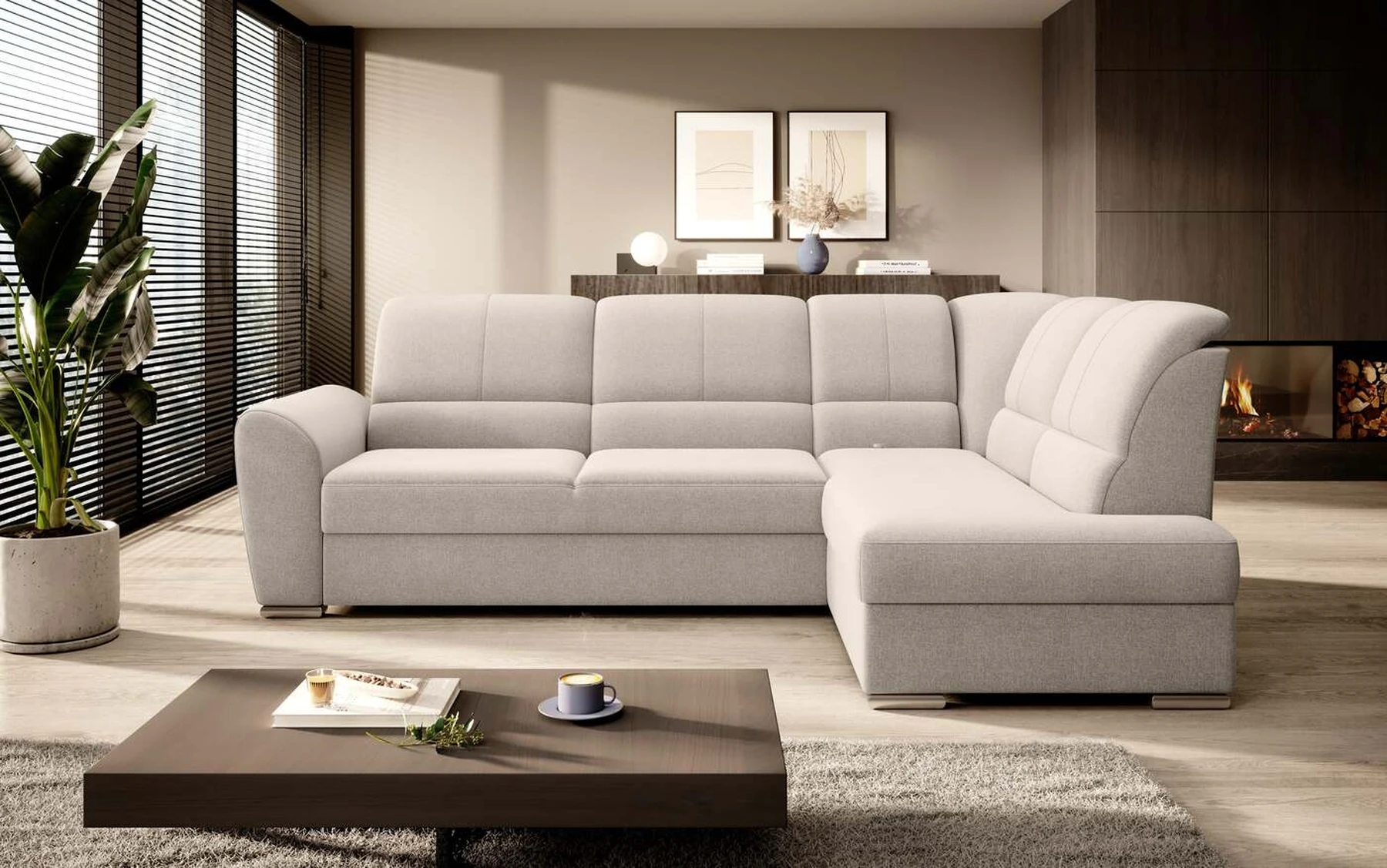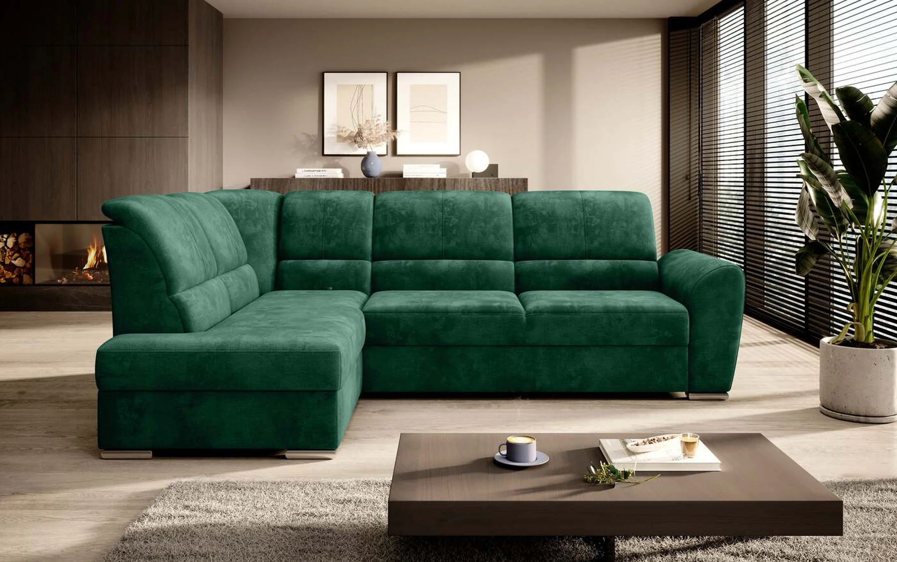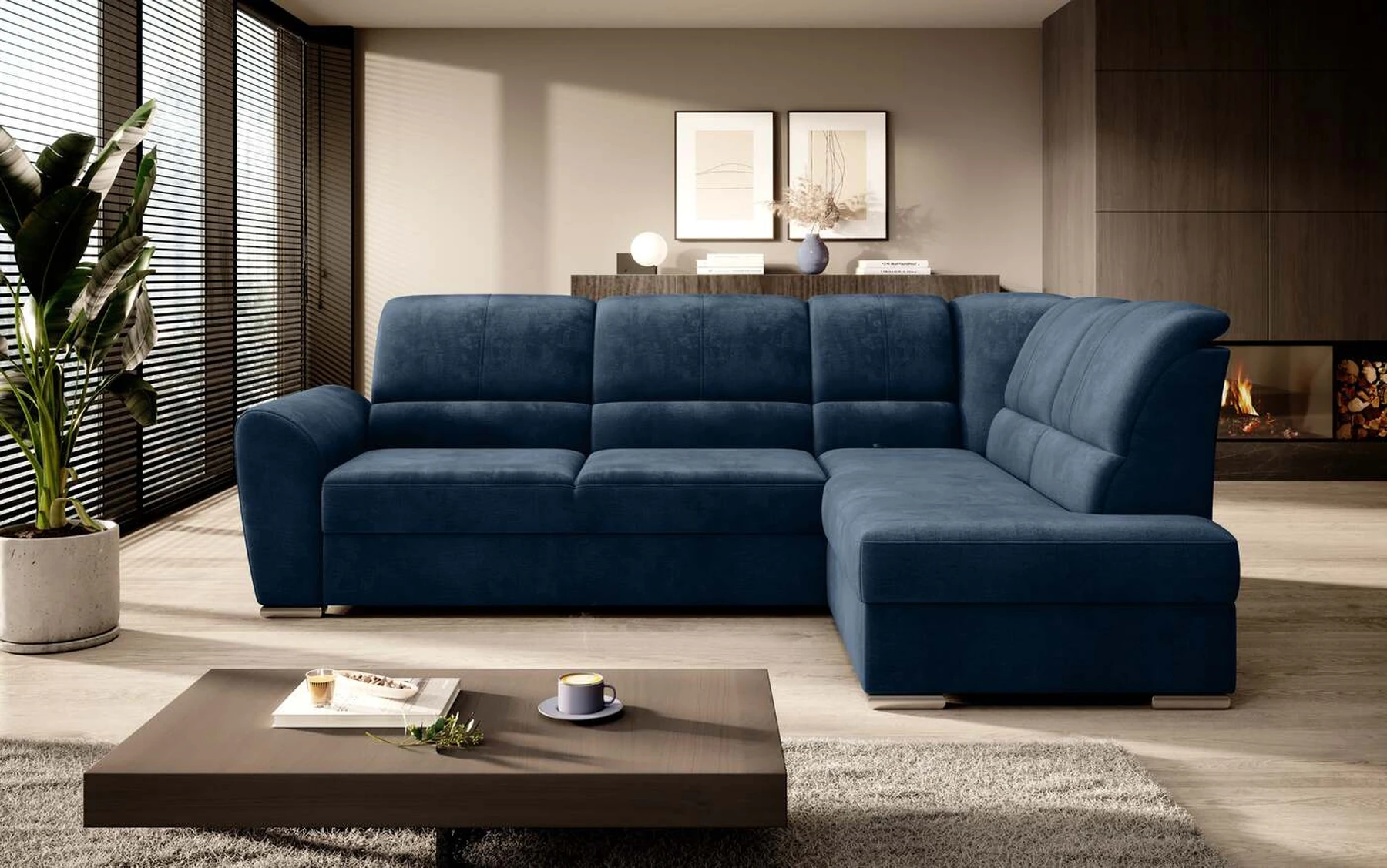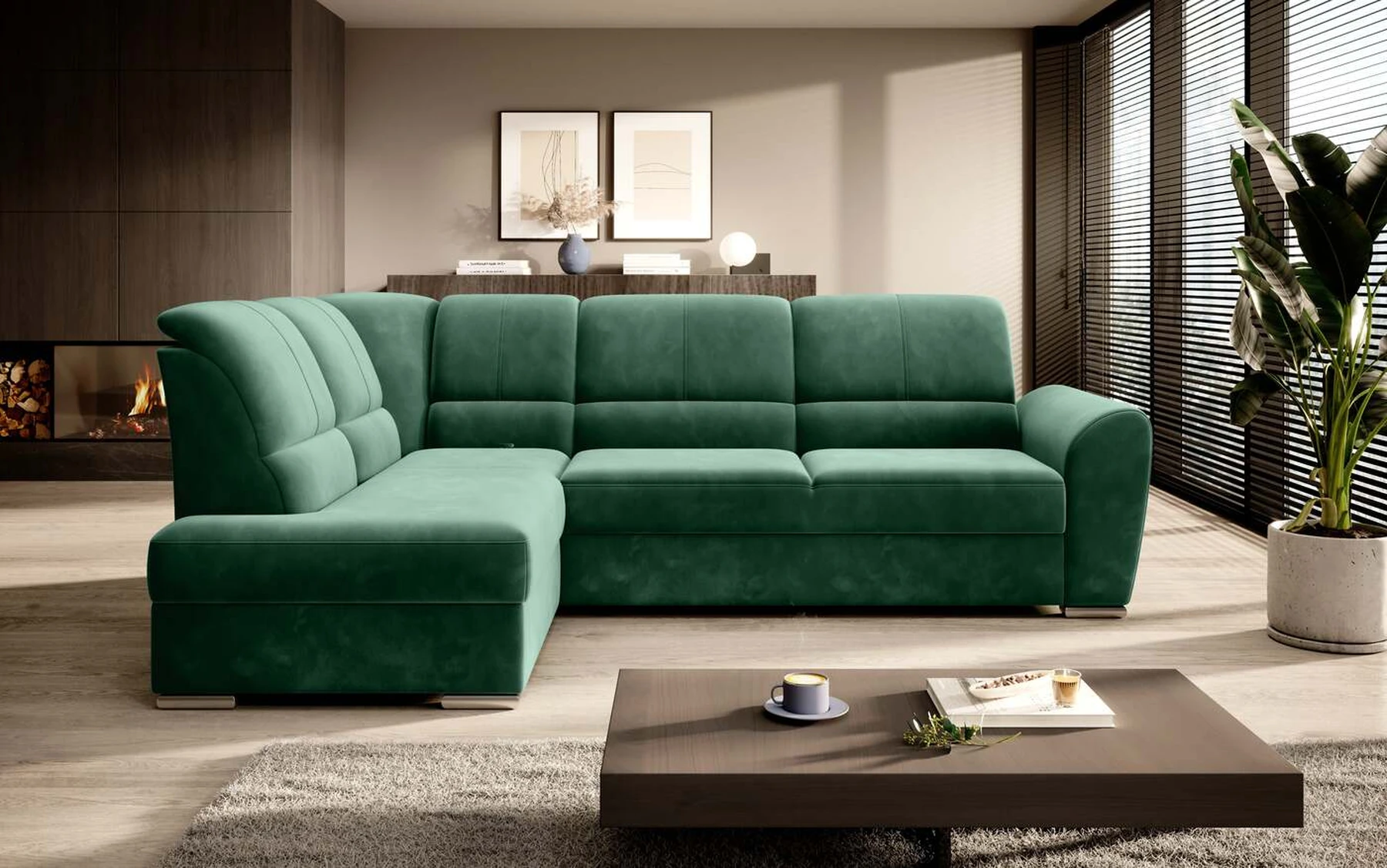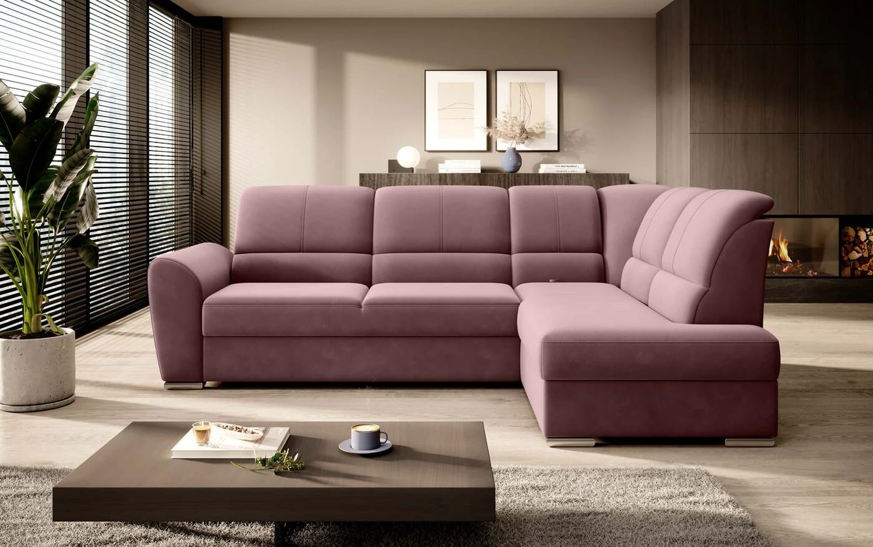 Kampinė sofa EL4636 yra puikus sprendimas žmonėms, kurie vertina tvarką ir organizuotumą. Tai padeda sutaupyti vietos dėl didelio patalynės konteinerio. Aukšto profilio reguliuojami atlošai, dekoruoti stilingomis siūlėmis, net valandas pailsės su mėgstamais TV serialais patogia ir patogia patirtimi. Kampinės sofos išmatavimai: 270 x 186 x 93 cm, leidžianti ramiai ilsėtis didesniam žmonių skaičiui be papildomo poilsio baldų. Be to, kampinė sofa gali tapti papildoma lova dėl sulankstomos miegojimo funkcijos, kurios plotas 205 x 125 cm. Šiame balde naudojamas delfinų sulankstymo mechanizmas yra puikus ir paprastas būdas kampinę sofą paversti viso dydžio lova. Taip pat verta paminėti reguliuojamus atlošus, kurie gali padėti patogiai atsipalaiduoti skaitant knygą ar žiūrint televizorių. Įdomūs šio baldo elementai yra 5 cm aukščio medinės kojelės, taip pat sėdynė, užpildyta T30 putplasčiu, užtikrinančiu puikų elastingumą ir didelį tankį.