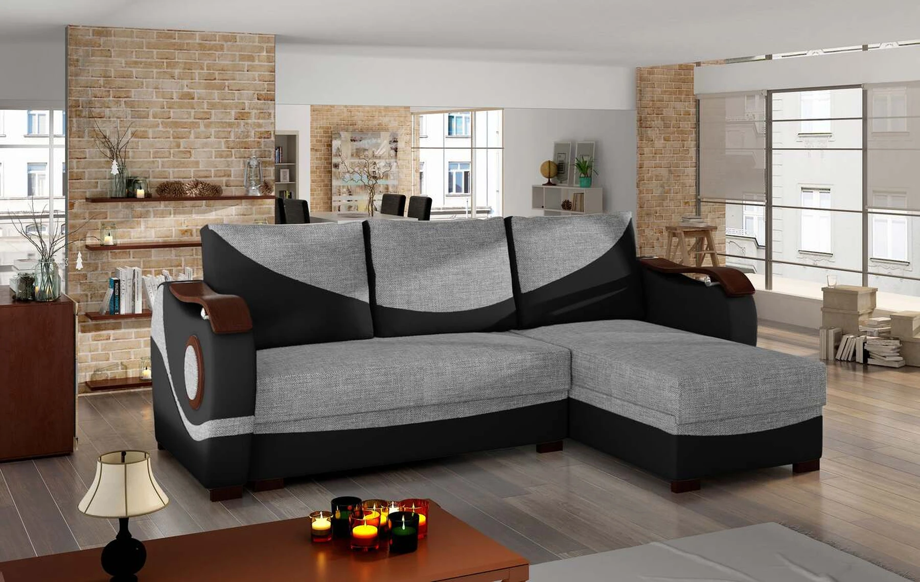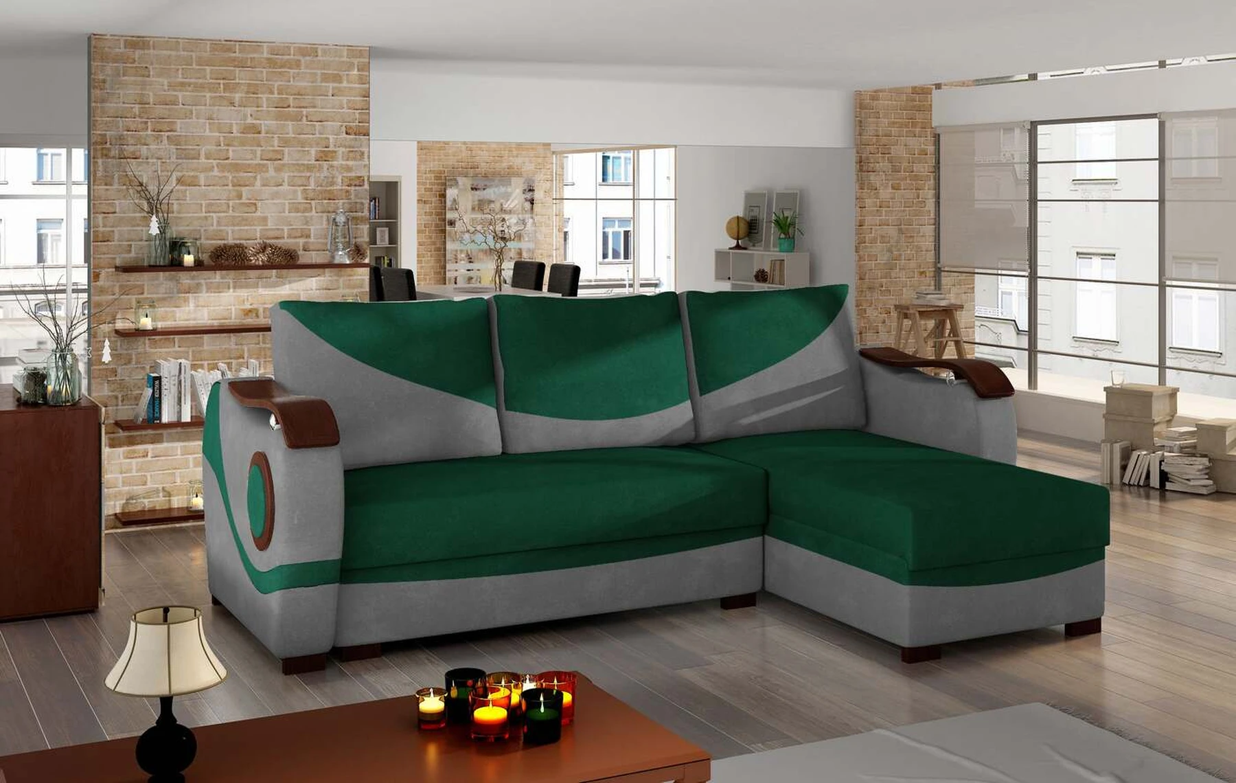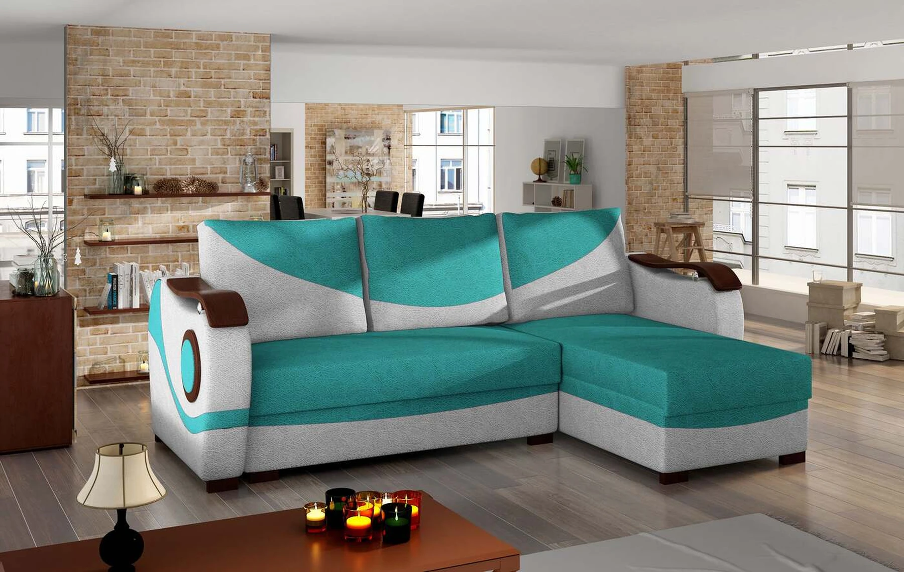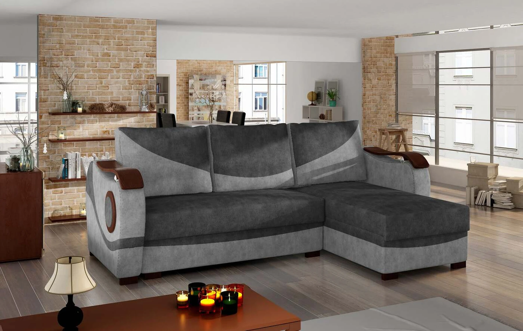 EL4663 – tai įmantri, originali ir moderni kampinė sofa, skirta originalių sprendimų žinovams. Baldai, kurių matmenys 235 x 140 x 90 cm, garantuoja erdvumą ir patogumą naudoti dieną bei maksimalų komfortą ir ramų miegą ant 195 x 125 cm paviršiaus naktį. Paprastas išskleidžiamas mechanizmas, kurį sudaro ištraukiamas dugnas ir atlenkiamas atlošas, leidžia aiškiai pritaikyti kampinę sofą pagal esamus poreikius. Kampinėje sofoje yra du talpūs patalynės laikymo skyriai - vienas iš jų yra pufas, o kitas yra pritaikius baldus prie naktinės funkcijos. Išskirtinio minkštumo patirtis įmanoma dėl bonel ir T25 putų derinio. Būtent šis derinys įtakoja mūsų baldų teikiamą maksimalų atsipalaidavimo malonumą. Tarp išskirtinių šio modelio bruožų tikrai galime įtraukti papildomų dekoracijų medinių elementų pavidalu ant porankių, šonų ir kojų – visa tai paverčia originaliu visumos tonu. Jei norėtumėte pajusti energiją, sklindančią iš EL4663 kampo – raginame į tai pažvelgti iš arčiau.