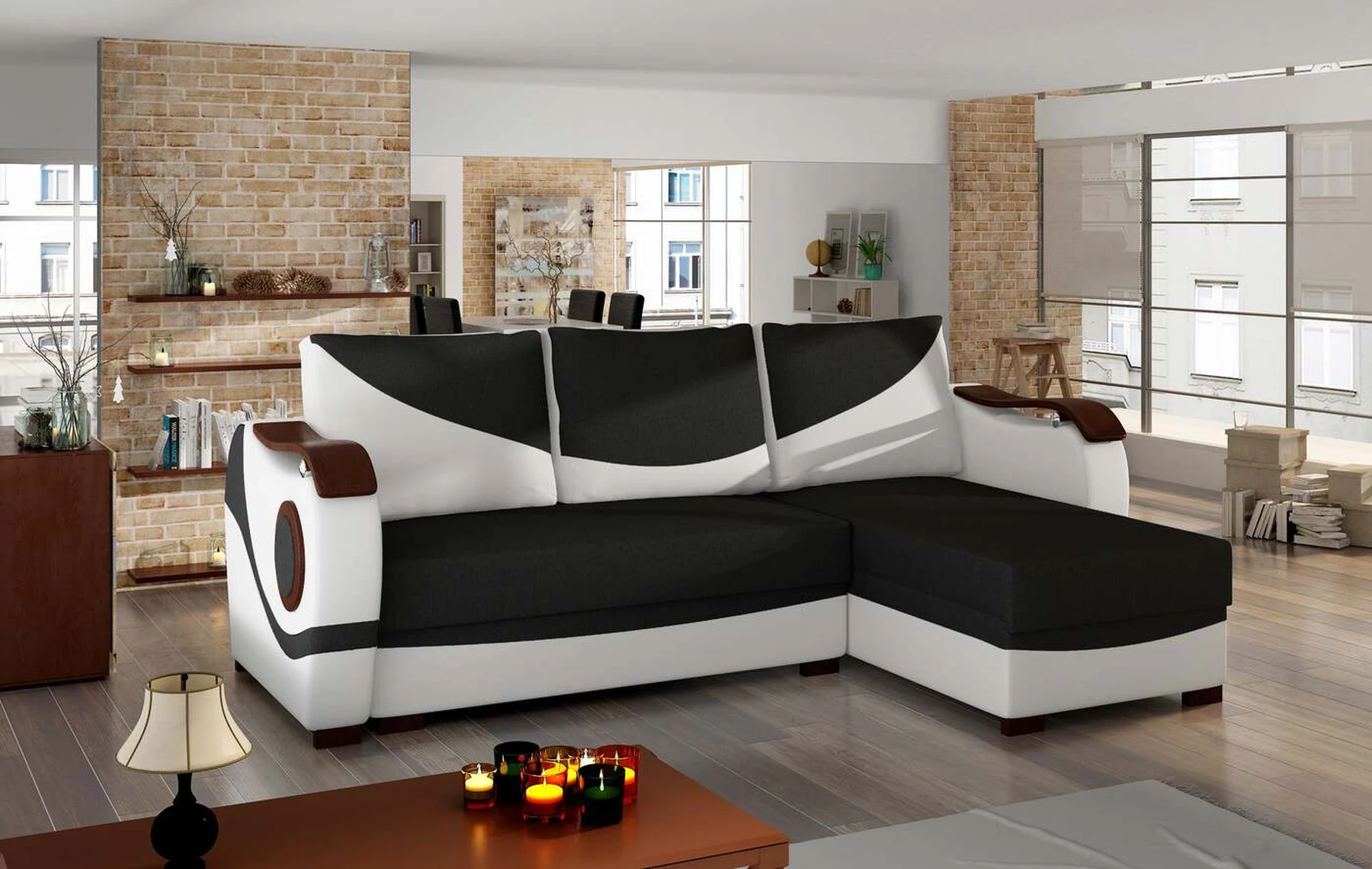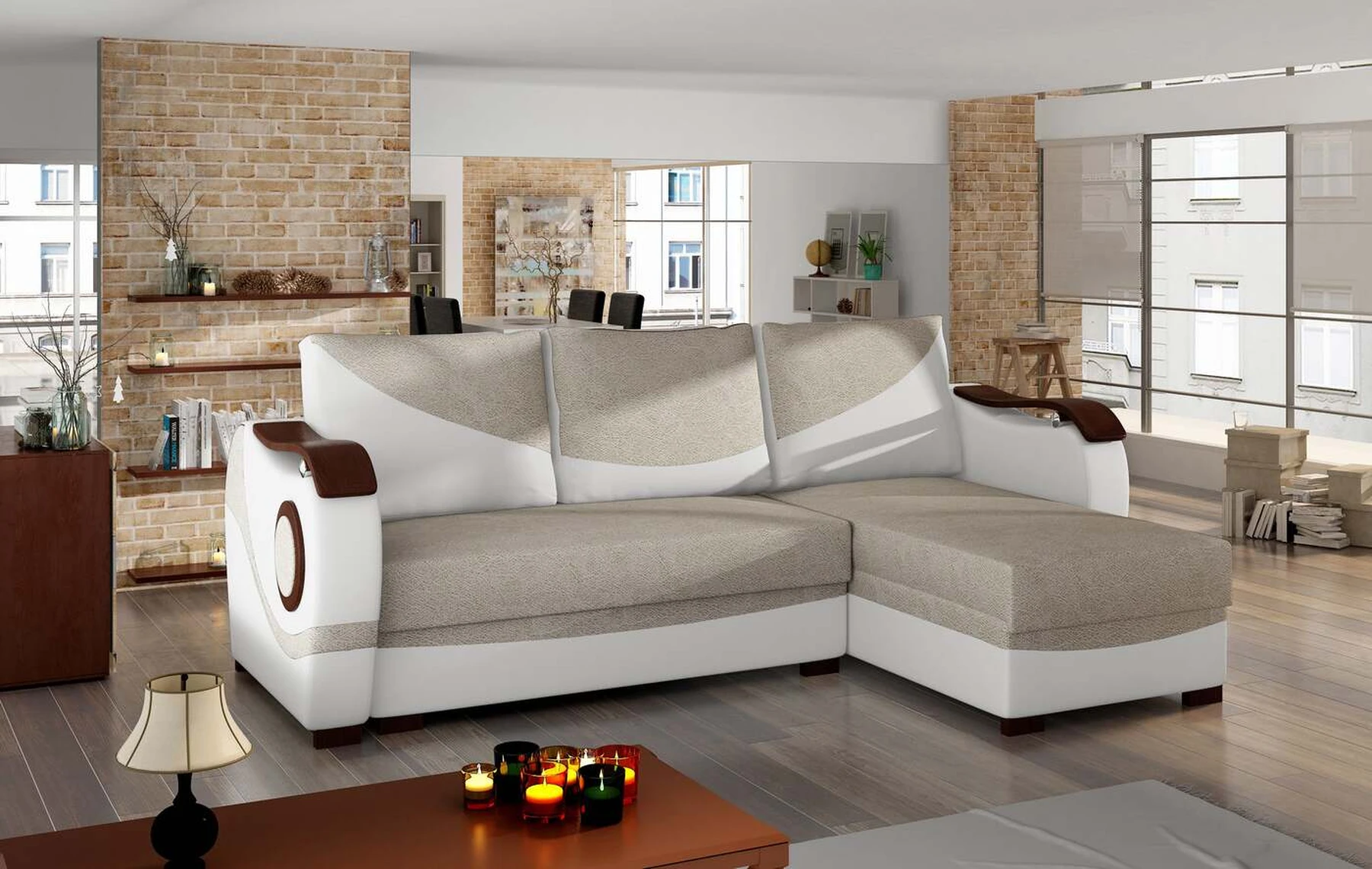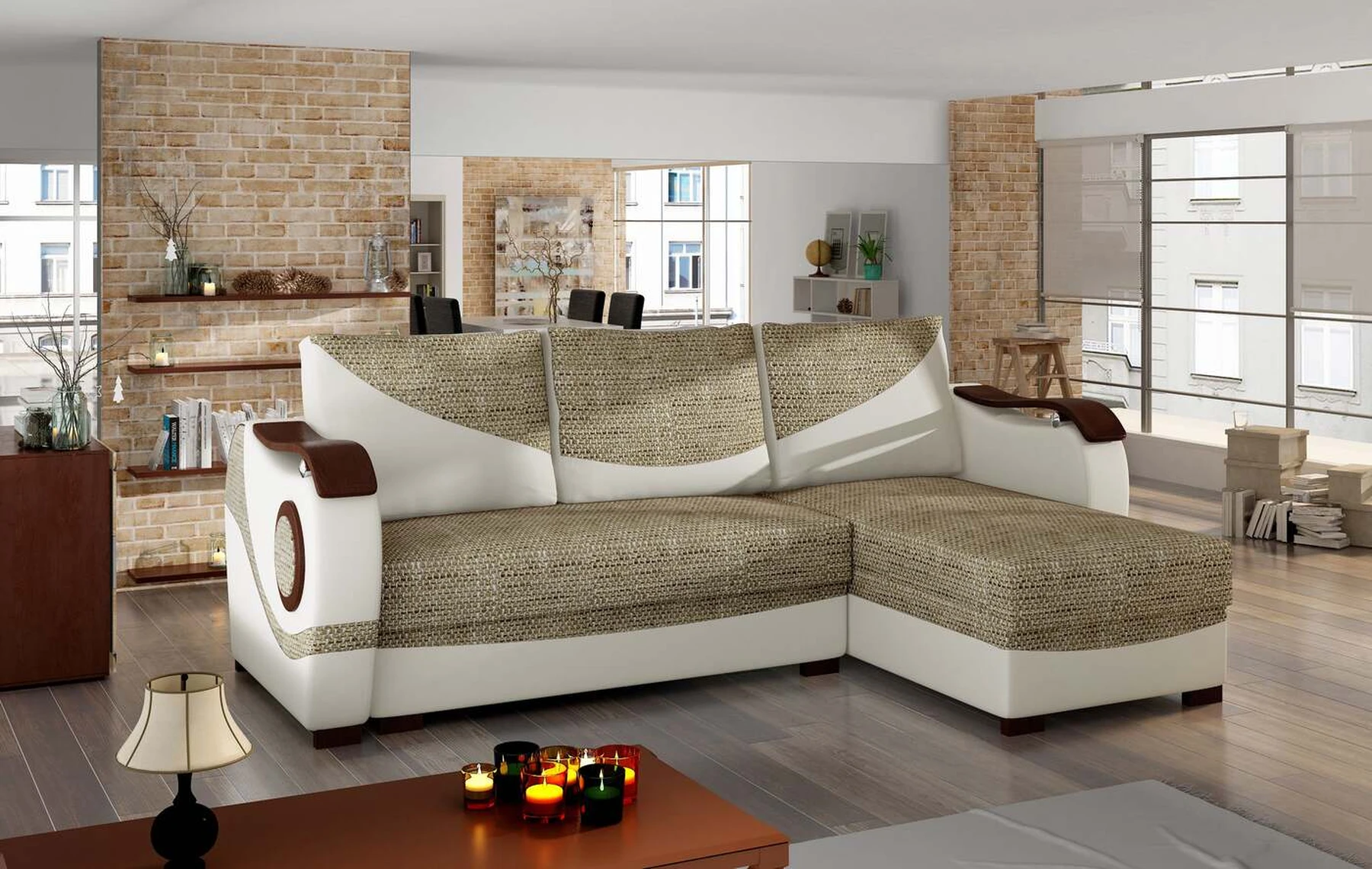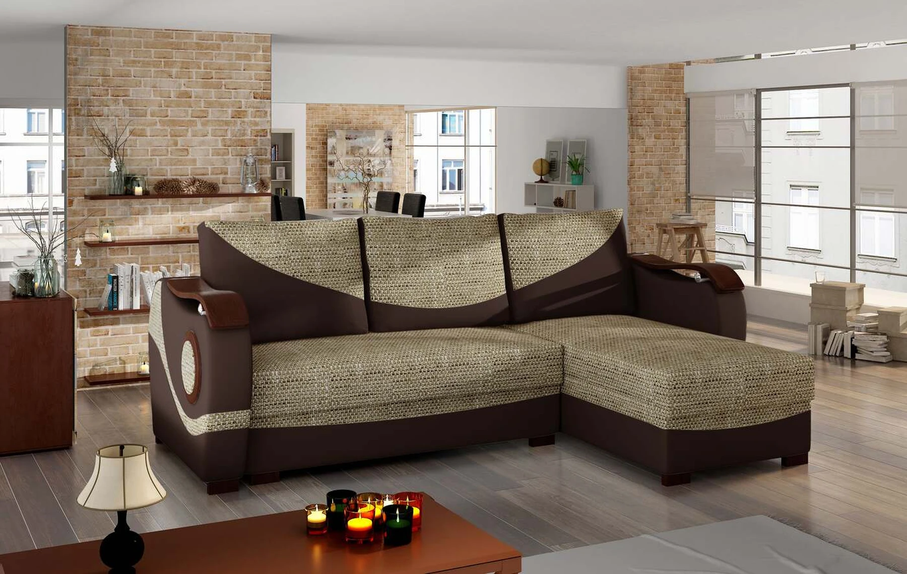EL4663 – tai įmantri, originali ir moderni kampinė sofa, skirta originalių sprendimų žinovams. Baldai, kurių matmenys 235 x 140 x 90 cm, garantuoja erdvumą ir patogumą naudoti dieną bei maksimalų komfortą ir ramų miegą ant 195 x 125 cm paviršiaus naktį. Paprastas išskleidžiamas mechanizmas, kurį sudaro ištraukiamas dugnas ir atlenkiamas atlošas, leidžia aiškiai pritaikyti kampinę sofą pagal esamus poreikius. Kampinėje sofoje yra du talpūs patalynės laikymo skyriai - vienas iš jų yra pufas, o kitas yra pritaikius baldus prie naktinės funkcijos. Išskirtinio minkštumo patirtis įmanoma dėl bonel ir T25 putų derinio. Būtent šis derinys įtakoja mūsų baldų teikiamą maksimalų atsipalaidavimo malonumą. Tarp išskirtinių šio modelio bruožų tikrai galime įtraukti papildomų dekoracijų medinių elementų pavidalu ant porankių, šonų ir kojų – visa tai paverčia originaliu visumos tonu. Jei norėtumėte pajusti energiją, sklindančią iš EL4663 kampo – raginame į tai pažvelgti iš arčiau.