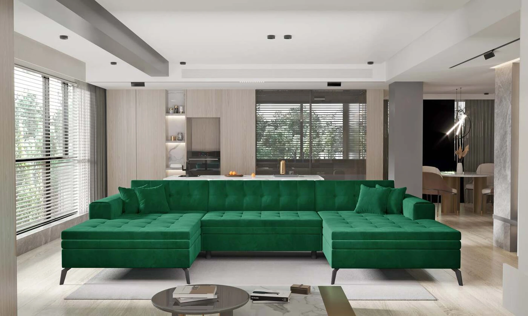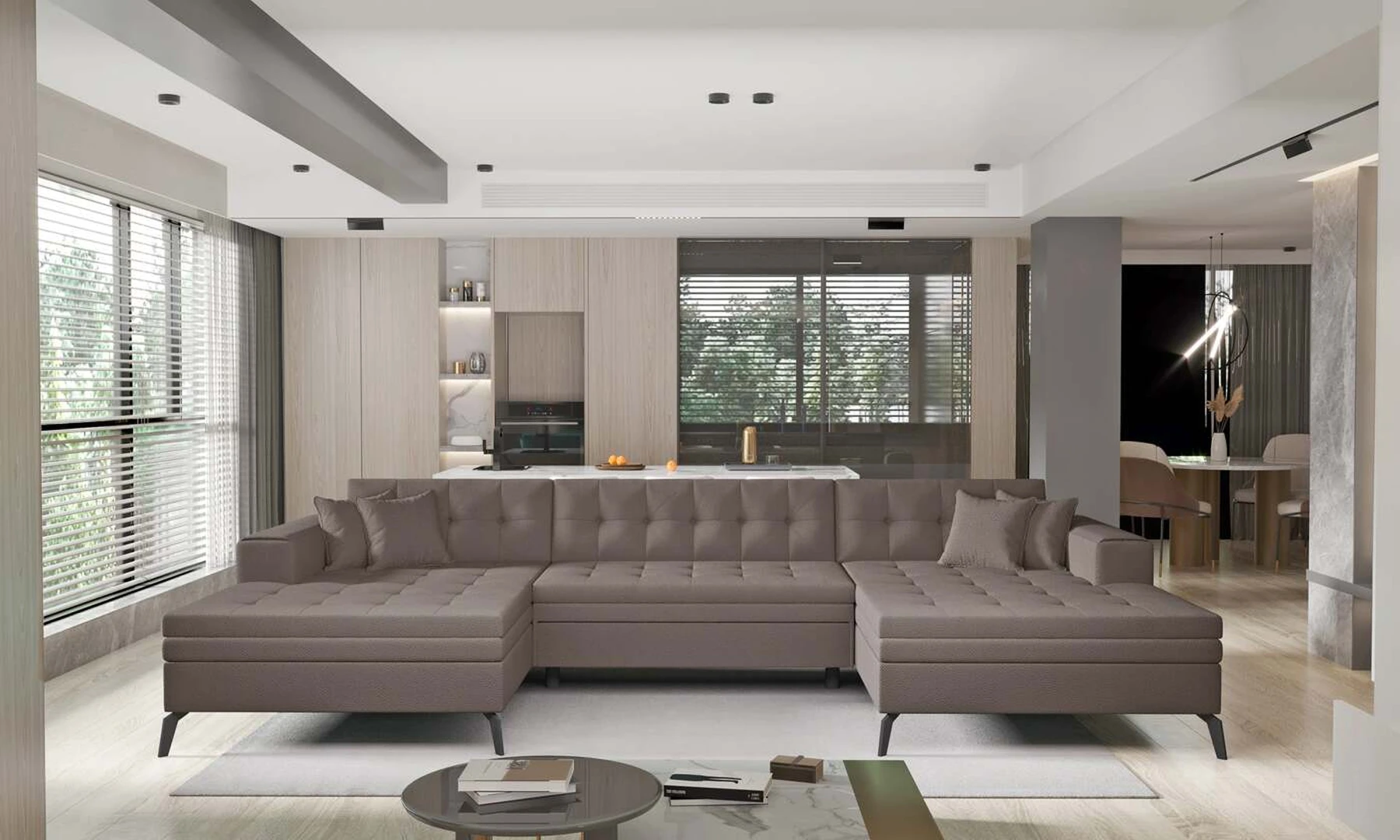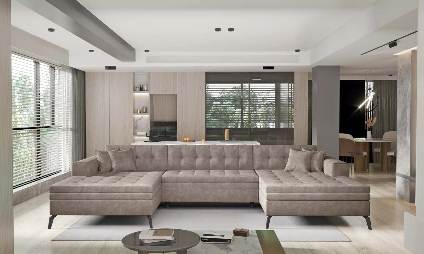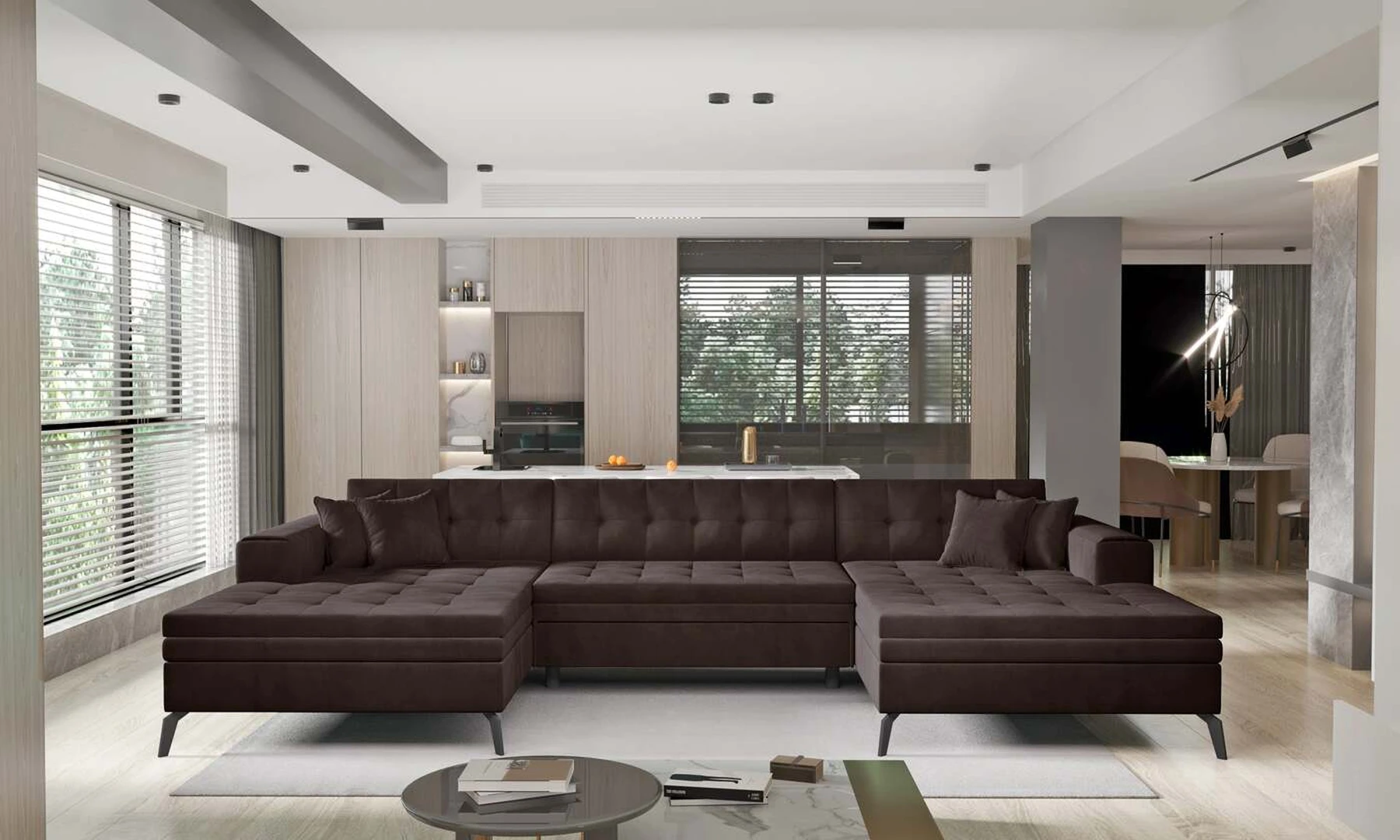 EL7153 yra moderni, didelė litrų, U formos kampinė sofa, kuri taps bet kurios svetainės akcentu. Jo paprasta elegantiška linija puikiai tiks tiek moderniame, tiek klasikiniame interjere. Dėl aukštos metalinės kojos jis įgauna lieknumo ir lengvumo bei neužgožia savo dydžiu. Dviejų porolonų T3040 ir T2542 dėka jis itin patogus ir patogus. Be to, du pufai puikiai pailsės visai šeimai. Kampinės sofos matmenys, 350*170*93 cm, suteiks poilsį ir komfortą ir jų dėka įgyjame didelę 295*110 cm miegamąją erdvę. Delfinų tipo išlankstymas leidžia lengvai ir greitai išskleisti kampinę sofą, kurią vienu rankos judesiu paverčiame erdvia lova. Kampinė sofa EL7153 sukurta taip, kad atitiktų dabartines tendencijas, o tuo pačiu yra patvari, tvirtos konstrukcijos ir patogi naudoti. Elegantiškas dygsniuotas baldas suteikia prašmatnumo, o juoda koja puikiai tiks prie bet kokio interjero. EL7153 kampinė sofa yra įvairių audinių ir spalvų. Esame įsitikinę, kad EL7153 patenkins išrankiausius skonius.