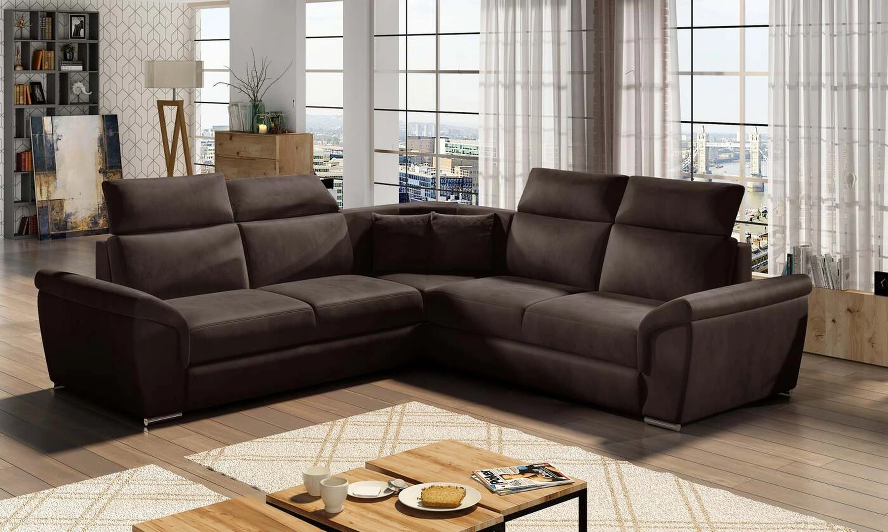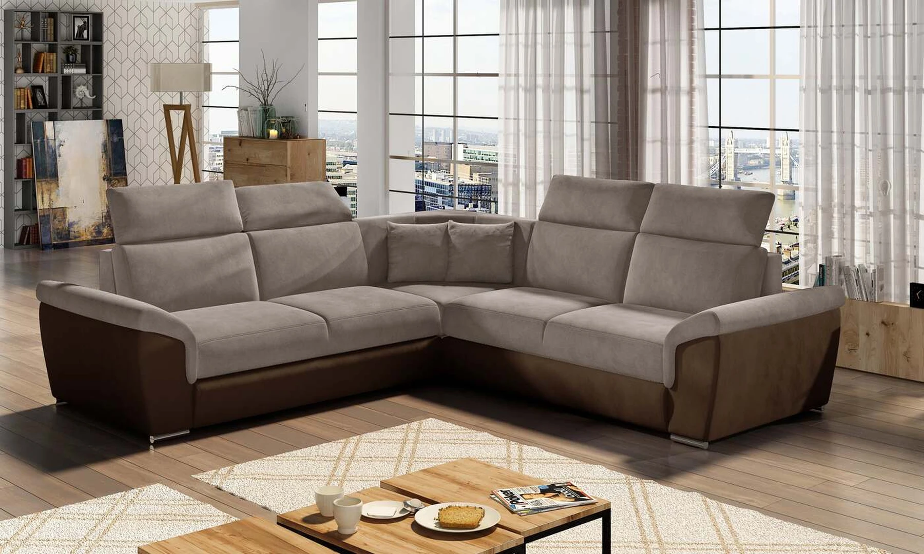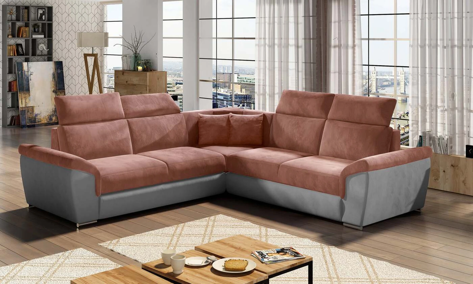 EL8253 yra klasikinis simetriškas, tačiau išskirtinis ir funkcionalus svetainės papuošalas. Paprastą formą laužo modernūs elementai: platūs, nuožulni porankiai, aukšti atlošai su keturiomis reguliuojamomis galvos atramomis ir dekoratyvinės pagalvės. Kampinės sofos matmenys 268 x 268 x 102 cm suteikia pakankamai erdvės atsipalaiduoti bet kuriuo dienos ar nakties metu. Šiame balde yra 120 x 200 cm miegojimo funkcija, taip pat erdvi ir gili patalynės saugykla, esanti pufas. Dėl delfininio tipo išskleidimo funkcijos baldo pritaikymas prie esamų poreikių yra intuityvus ir patogus.Baldo sėdynė pagaminta iš gofruoto spyruoklės ir T30 putplasčio – toks derinys suteikia minkštumo, lankstumo ir pakankamą atramą kūnui poilsio metu . Kampinė sofa EL8253 yra tinkamas pasirinkimas bet kurioje svetainėje, kur svarbi tvarka, universalumas ir tuo pačiu elegantiška atskirų elementų apdaila. Garantuojame, kad EL8253 atitiks visus jūsų reikalavimus.