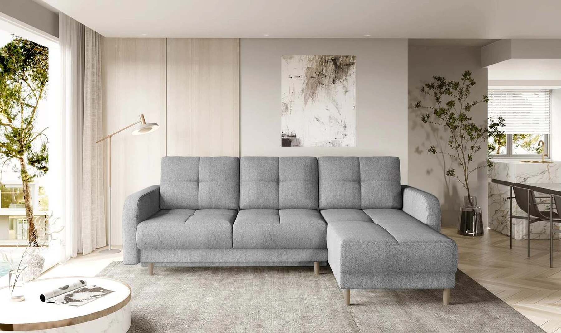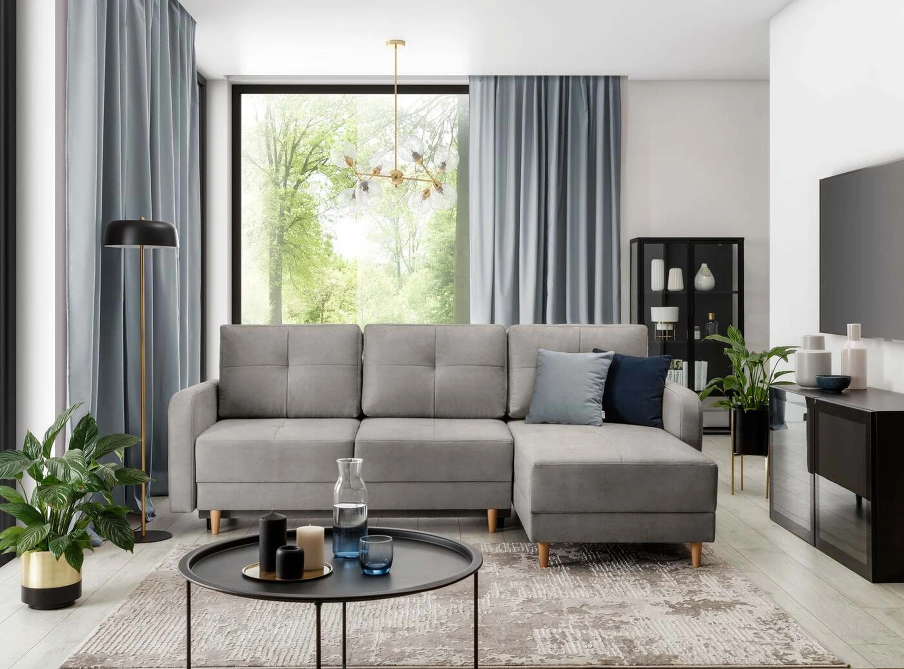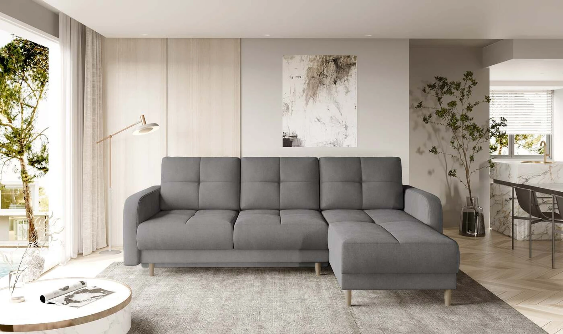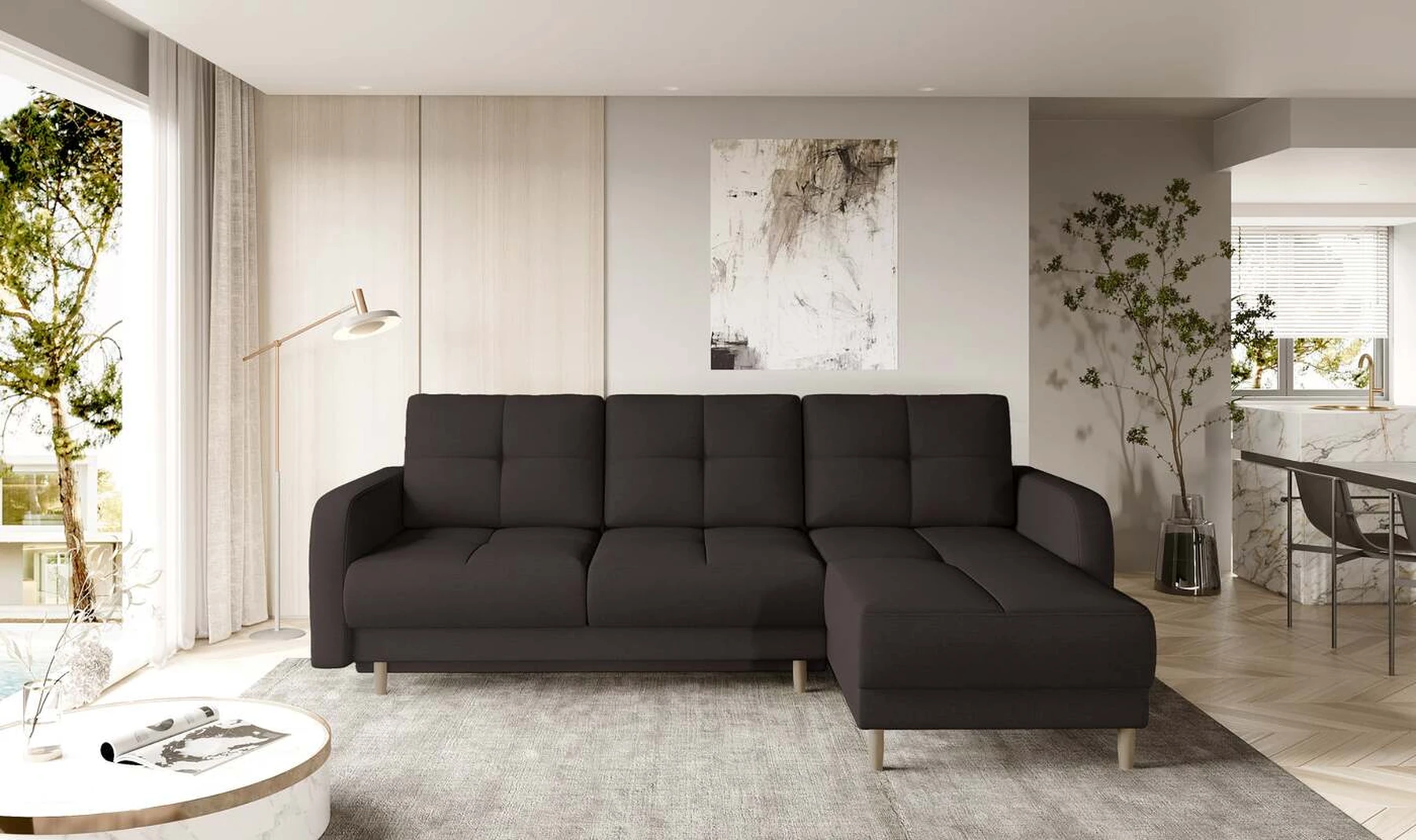 Elegantiškos linijos, paprastas stilius ir patogi vieta daiktams laikyti – tai yra EL9258 kampinės sofos. Tai puikus pasirinkimas gyvenant vidutinio dydžio erdvėse, nes jo matmenys yra 240 x 165 x 90 centimetrų. Šio baldo sėdynę sudaro labai patogi pagalvėlė, pagaminta iš dviejų putų derinio: didelio tamprumo HR putplasčio ir deformacijoms atsparaus T30 putplasčio, taip pat aukštos kokybės apmušalai ir B tipo gofruota spyruoklė, užtikrinanti ilgaamžiškumą. baldo. Šios kampinės sofos gale buvo panaudotas universalus T25 putplastis. Baldo kojelėms gaminti buvo panaudota alksnio mediena. Kampinėje sofoje EL9258 taip pat yra 215 x 120 centimetrų miegamoji erdvė, todėl ji puikiai tiks iš anksto nepranešusiems svečiams. Dar vienas šios kampinės sofos privalumas – patalynės konteineris, kuris leidžia patogiai susidėti papildomas pagalves, antklodes ar patalynę Jūsų svečiams. Kampinę sofą puošiantys skiautiniai ir dygsniai suteikia interjerui, kuriame stovi EL9258, daugiau charakterio, bet taip pat patraukia dėmesį ir pristato originalų stilių.