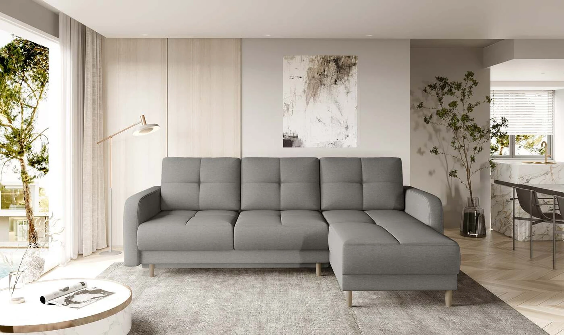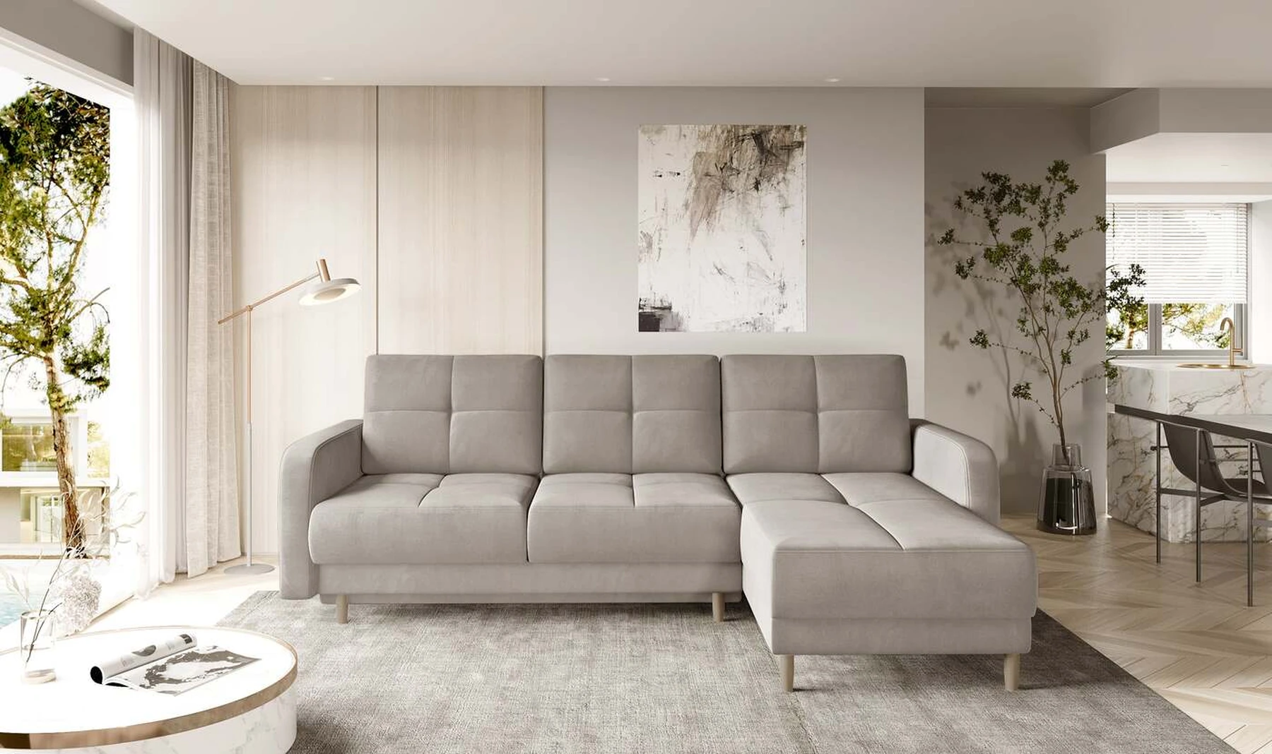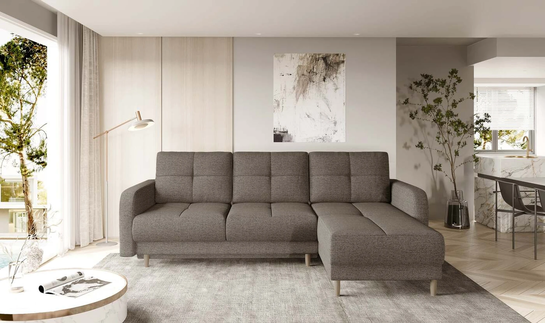 Elegantiškos linijos, paprastas stilius ir patogi vieta daiktams laikyti – tai yra EL9258 kampinės sofos. Tai puikus pasirinkimas gyvenant vidutinio dydžio erdvėse, nes jo matmenys yra 240 x 165 x 90 centimetrų. Šio baldo sėdynę sudaro labai patogi pagalvėlė, pagaminta iš dviejų putų derinio: didelio tamprumo HR putplasčio ir deformacijoms atsparaus T30 putplasčio, taip pat aukštos kokybės apmušalai ir B tipo gofruota spyruoklė, užtikrinanti ilgaamžiškumą. baldo. Šios kampinės sofos gale buvo panaudotas universalus T25 putplastis. Baldo kojelėms gaminti buvo panaudota alksnio mediena. Kampinėje sofoje EL9258 taip pat yra 215 x 120 centimetrų miegamoji erdvė, todėl ji puikiai tiks iš anksto nepranešusiems svečiams. Dar vienas šios kampinės sofos privalumas – patalynės konteineris, kuris leidžia patogiai susidėti papildomas pagalves, antklodes ar patalynę Jūsų svečiams. Kampinę sofą puošiantys skiautiniai ir dygsniai suteikia interjerui, kuriame stovi EL9258, daugiau charakterio, bet taip pat patraukia dėmesį ir pristato originalų stilių.