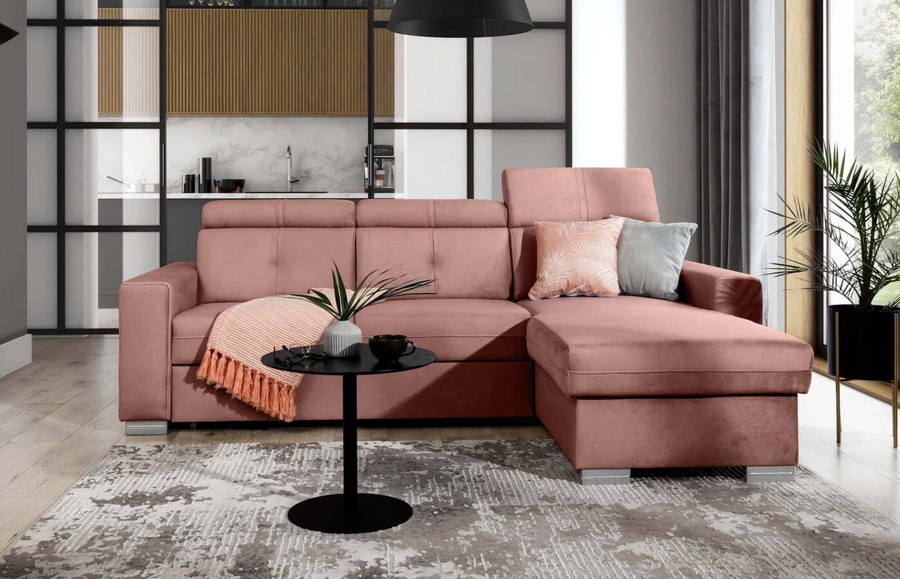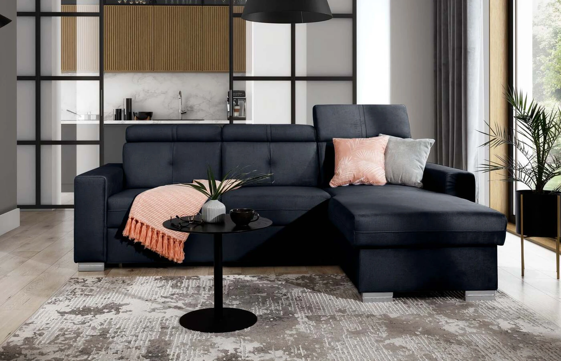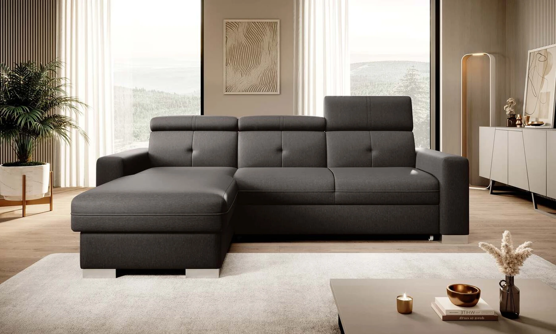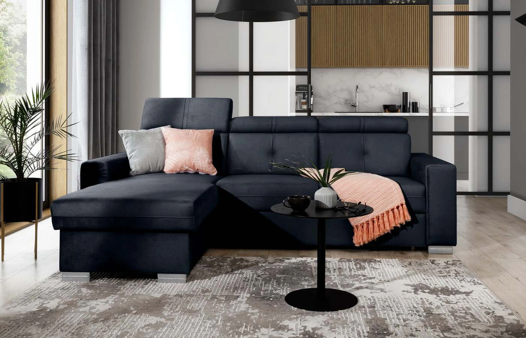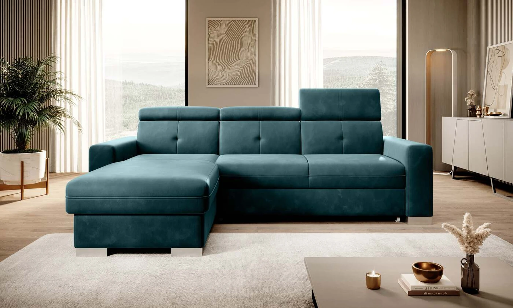 Kampinė sofa EL9641 yra L formos baldas, kuris puikiai atrodo ir buvo sukurtas turint omenyje palaimingą poilsį. Be to, ne tik suteikia estetinių vertybių, bet ir labai funkcionalus bei patogus, nes yra 3 judančios galvos atramos. EL9641 yra 247 cm pločio, 176 cm gylio ir 104 cm aukščio baldas. EL9641 medinės ir chromuotos 5,5 cm ilgio kojelės yra graži puošmena ir pabrėžia elegantišką išvaizdą. Kitas kampinės sofos privalumas – patalynės konteineris, kurio dėka galėsite palaikyti tvarką svetainėje ar svečių kambaryje. Išlankstoma funkcija taip pat suteikia 204 x 126 cm miegamąją zoną – puiki galimybė netikėtai atvykus svečiams. Kampinės sofos atidarymo mechanizmas yra labai populiarus ir patogus delfinų tipas. Įspūdingi kolekcijos apmušalai suteikia baldui charakterio ir stiliaus. Pasiūloje yra tiek klasikinių, tiek originalesnių spalvų. Dėl T30 putų užpildytos sėdynės kampinė sofa užtikrina stabilų atramą ir patogų poilsį. Kita svarbi minkštų baldų dalis – spyruoklės. Kampinėje sofoje EL9641 buvo panaudota B tipo gofruotoji spyruoklė, todėl šio baldo sėdynė yra lankstesnė ir lankstesnė, todėl itin patogi.