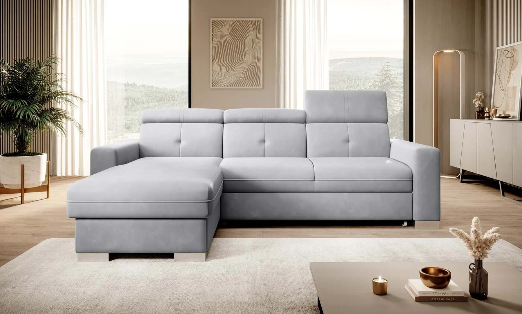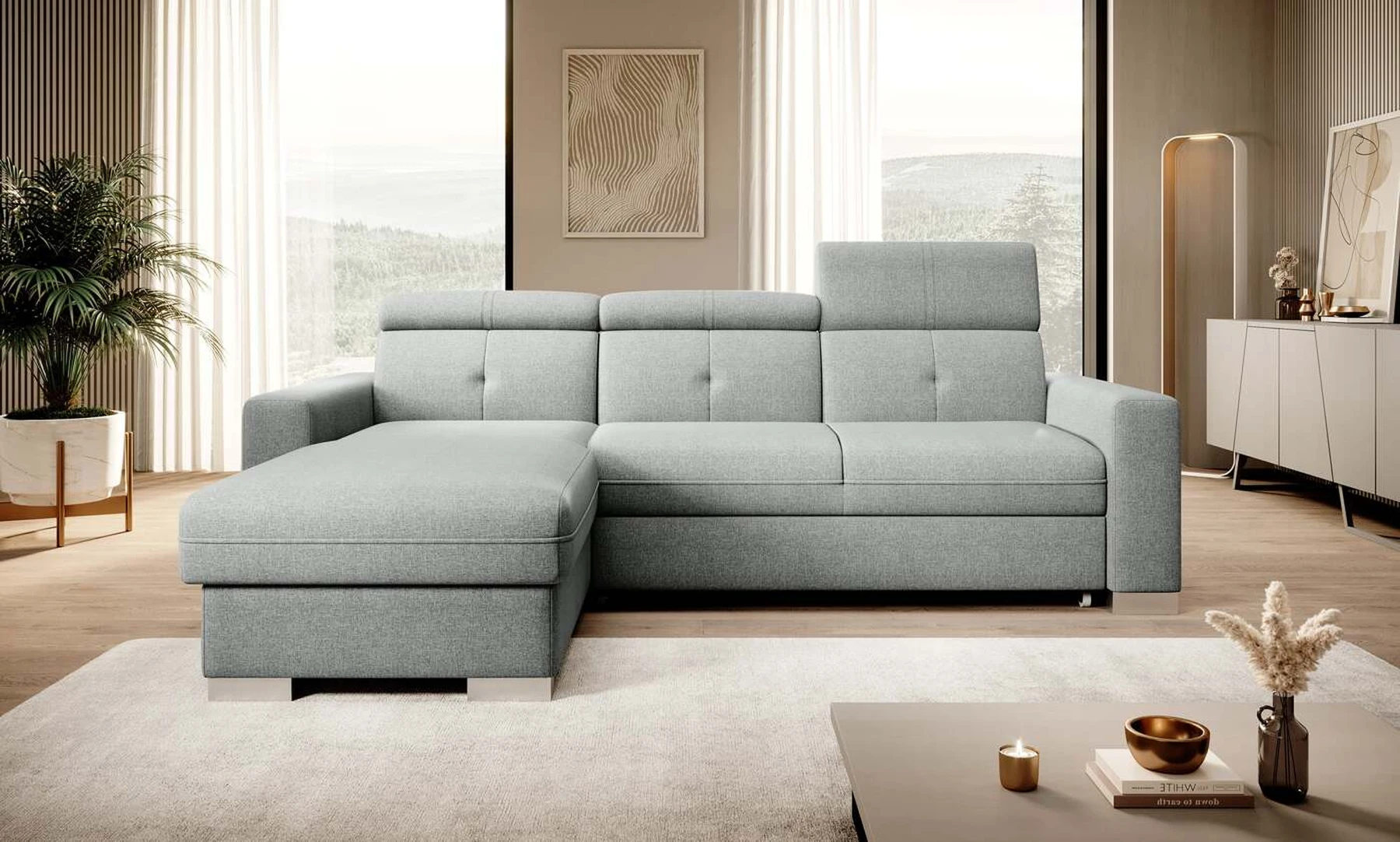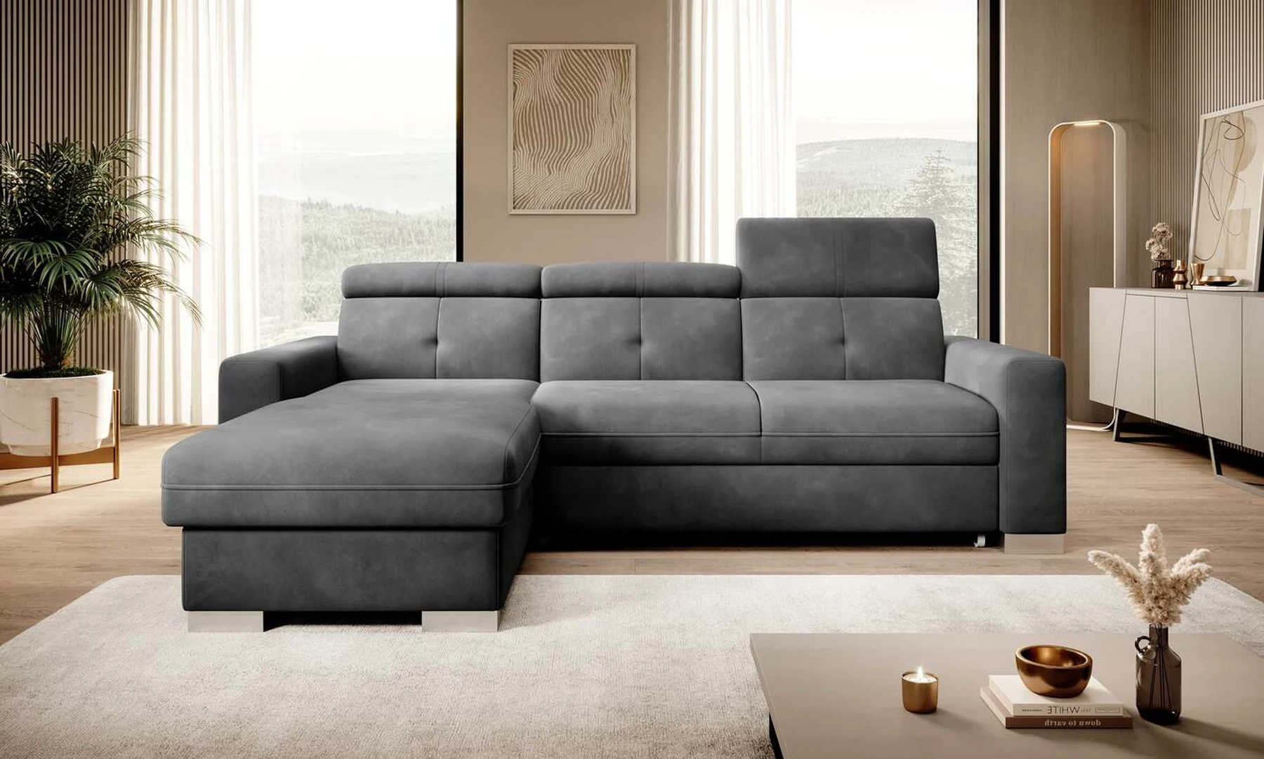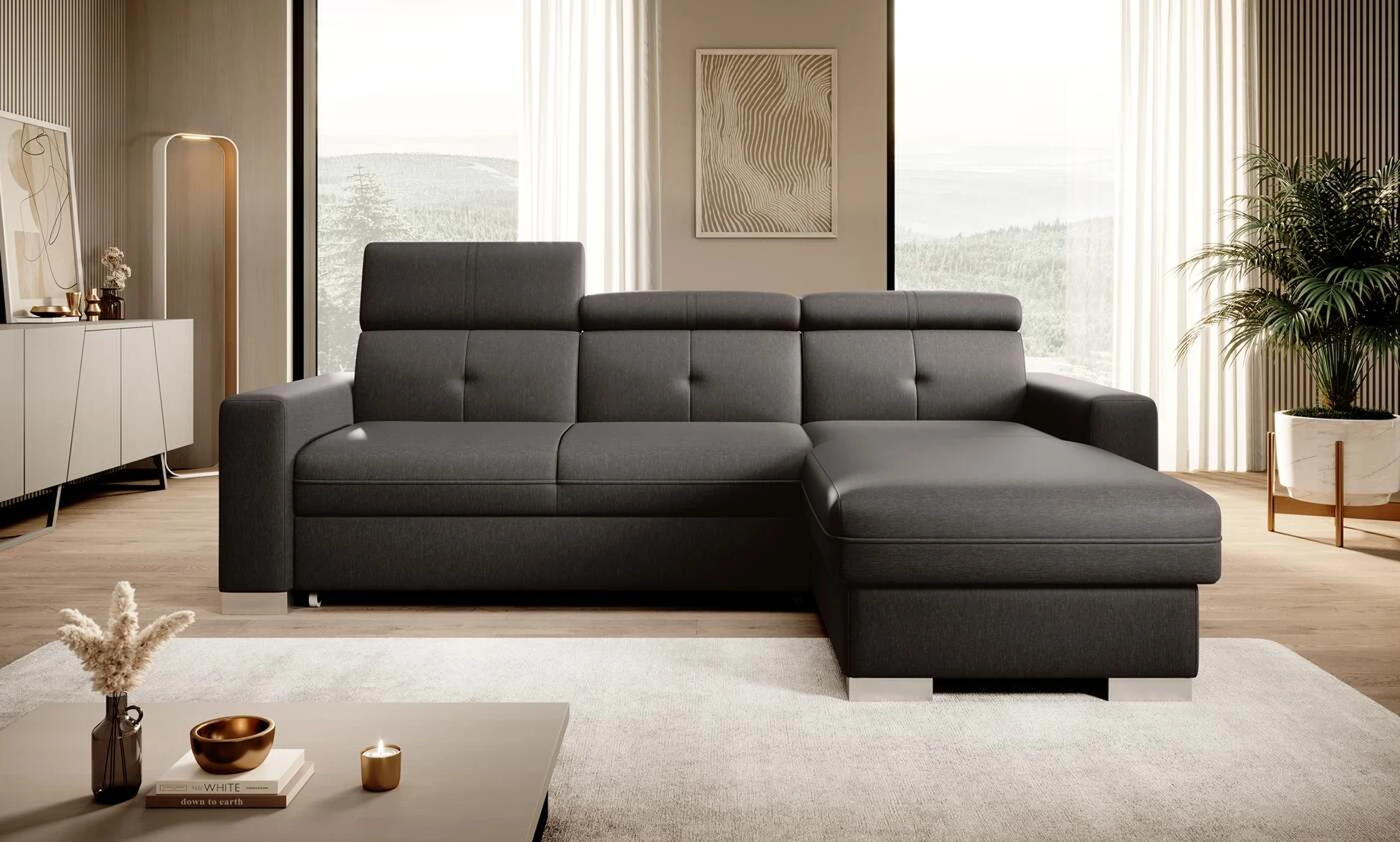 Kampinė sofa EL9641 yra L formos baldas, kuris puikiai atrodo ir buvo sukurtas turint omenyje palaimingą poilsį. Be to, ne tik suteikia estetinių vertybių, bet ir labai funkcionalus bei patogus, nes yra 3 judančios galvos atramos. EL9641 yra 247 cm pločio, 176 cm gylio ir 104 cm aukščio baldas. EL9641 medinės ir chromuotos 5,5 cm ilgio kojelės yra graži puošmena ir pabrėžia elegantišką išvaizdą. Kitas kampinės sofos privalumas – patalynės konteineris, kurio dėka galėsite palaikyti tvarką svetainėje ar svečių kambaryje. Išlankstoma funkcija taip pat suteikia 204 x 126 cm miegamąją zoną – puiki galimybė netikėtai atvykus svečiams. Kampinės sofos atidarymo mechanizmas yra labai populiarus ir patogus delfinų tipas. Įspūdingi kolekcijos apmušalai suteikia baldui charakterio ir stiliaus. Pasiūloje yra tiek klasikinių, tiek originalesnių spalvų. Dėl T30 putų užpildytos sėdynės kampinė sofa užtikrina stabilų atramą ir patogų poilsį. Kita svarbi minkštų baldų dalis – spyruoklės. Kampinėje sofoje EL9641 buvo panaudota B tipo gofruotoji spyruoklė, todėl šio baldo sėdynė yra lankstesnė ir lankstesnė, todėl itin patogi.