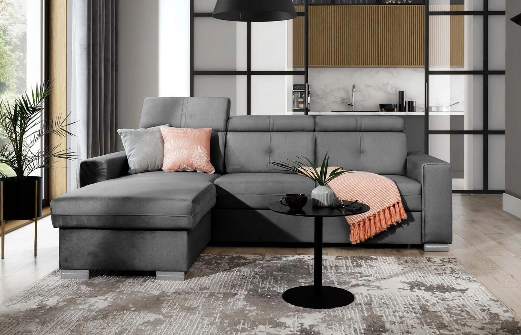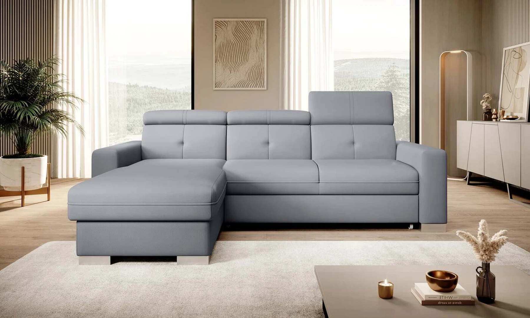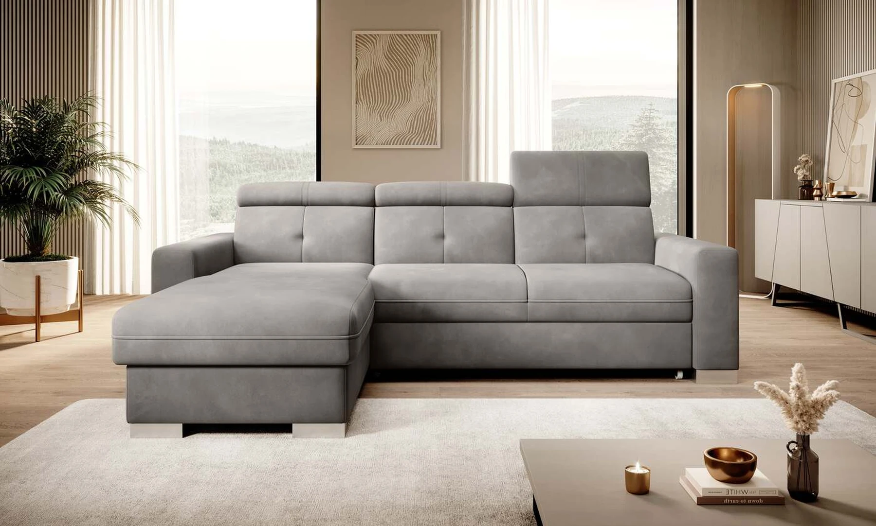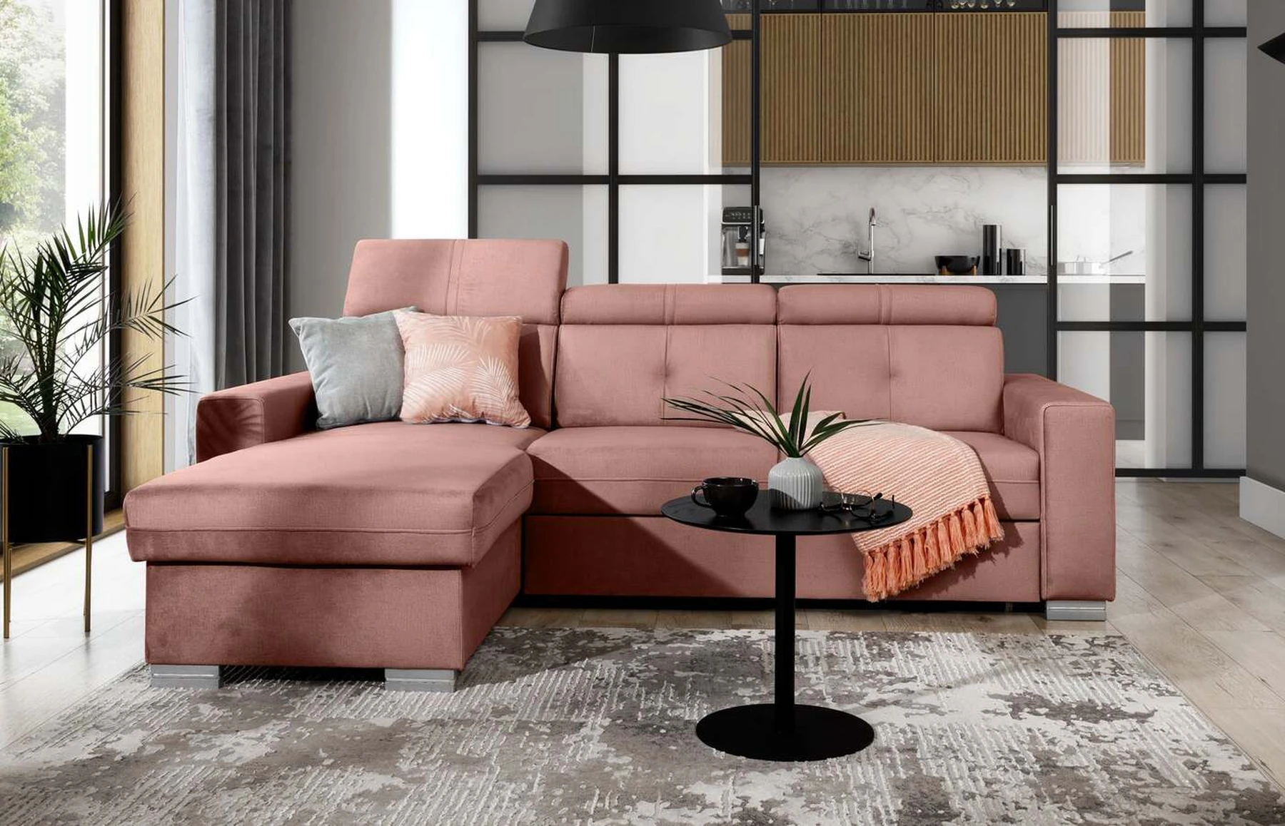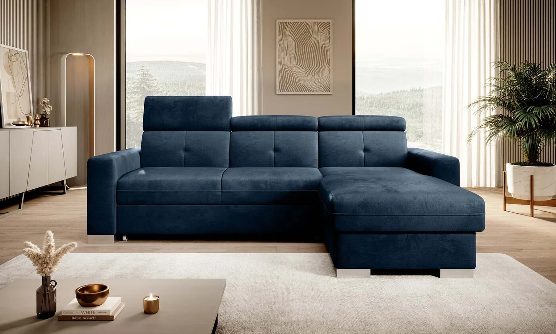Kampinė sofa EL9641 yra L formos baldas, kuris puikiai atrodo ir buvo sukurtas turint omenyje palaimingą poilsį. Be to, ne tik suteikia estetinių vertybių, bet ir labai funkcionalus bei patogus, nes yra 3 judančios galvos atramos. EL9641 yra 247 cm pločio, 176 cm gylio ir 104 cm aukščio baldas. EL9641 medinės ir chromuotos 5,5 cm ilgio kojelės yra graži puošmena ir pabrėžia elegantišką išvaizdą. Kitas kampinės sofos privalumas – patalynės konteineris, kurio dėka galėsite palaikyti tvarką svetainėje ar svečių kambaryje. Išlankstoma funkcija taip pat suteikia 204 x 126 cm miegamąją zoną – puiki galimybė netikėtai atvykus svečiams. Kampinės sofos atidarymo mechanizmas yra labai populiarus ir patogus delfinų tipas. Įspūdingi kolekcijos apmušalai suteikia baldui charakterio ir stiliaus. Pasiūloje yra tiek klasikinių, tiek originalesnių spalvų. Dėl T30 putų užpildytos sėdynės kampinė sofa užtikrina stabilų atramą ir patogų poilsį. Kita svarbi minkštų baldų dalis – spyruoklės. Kampinėje sofoje EL9641 buvo panaudota B tipo gofruotoji spyruoklė, todėl šio baldo sėdynė yra lankstesnė ir lankstesnė, todėl itin patogi.