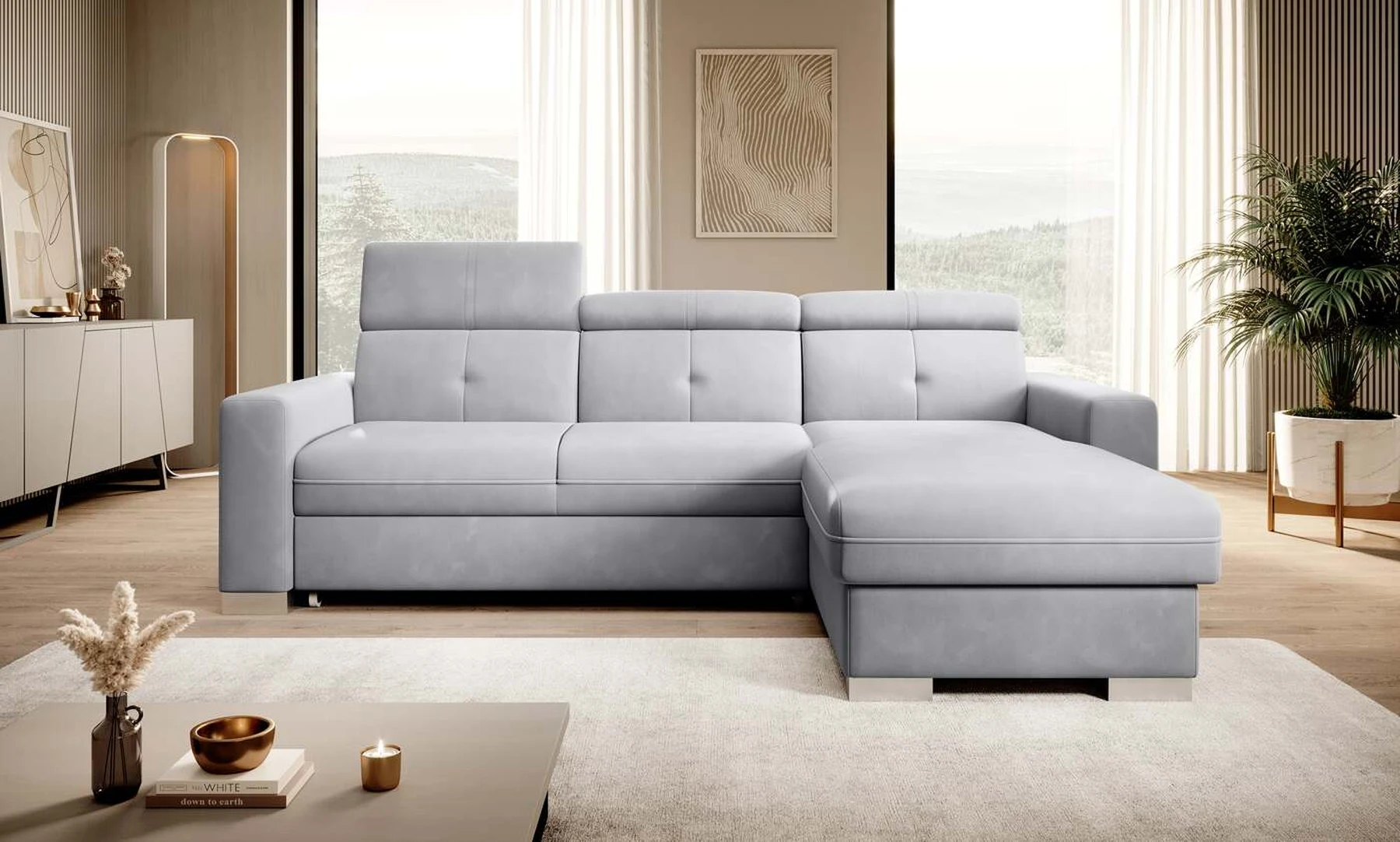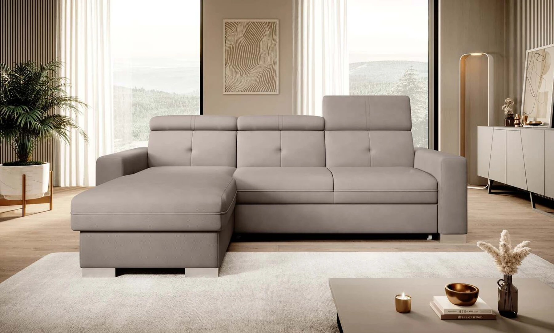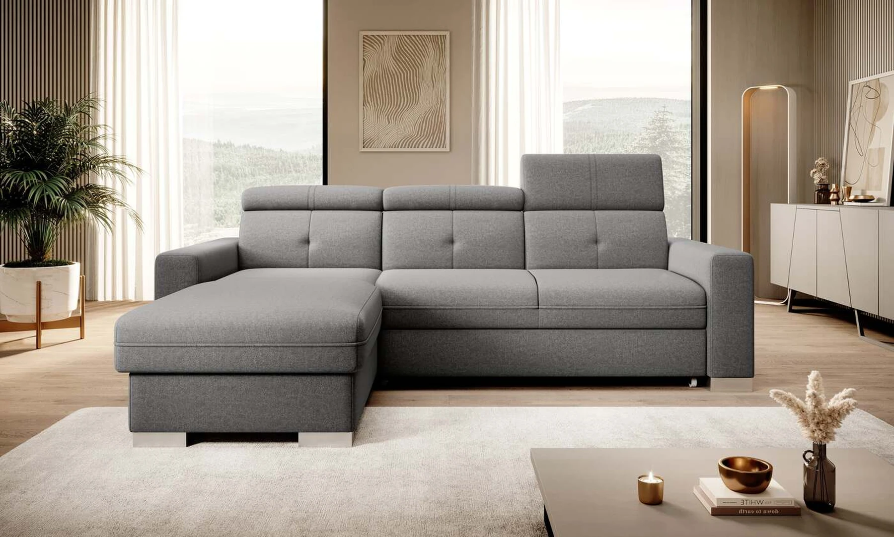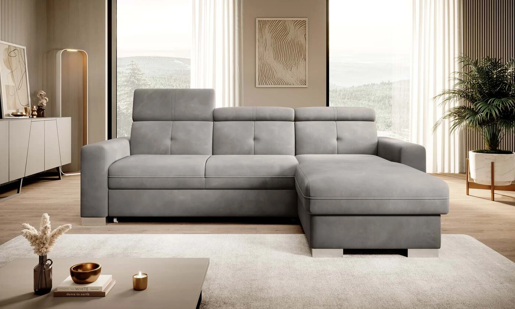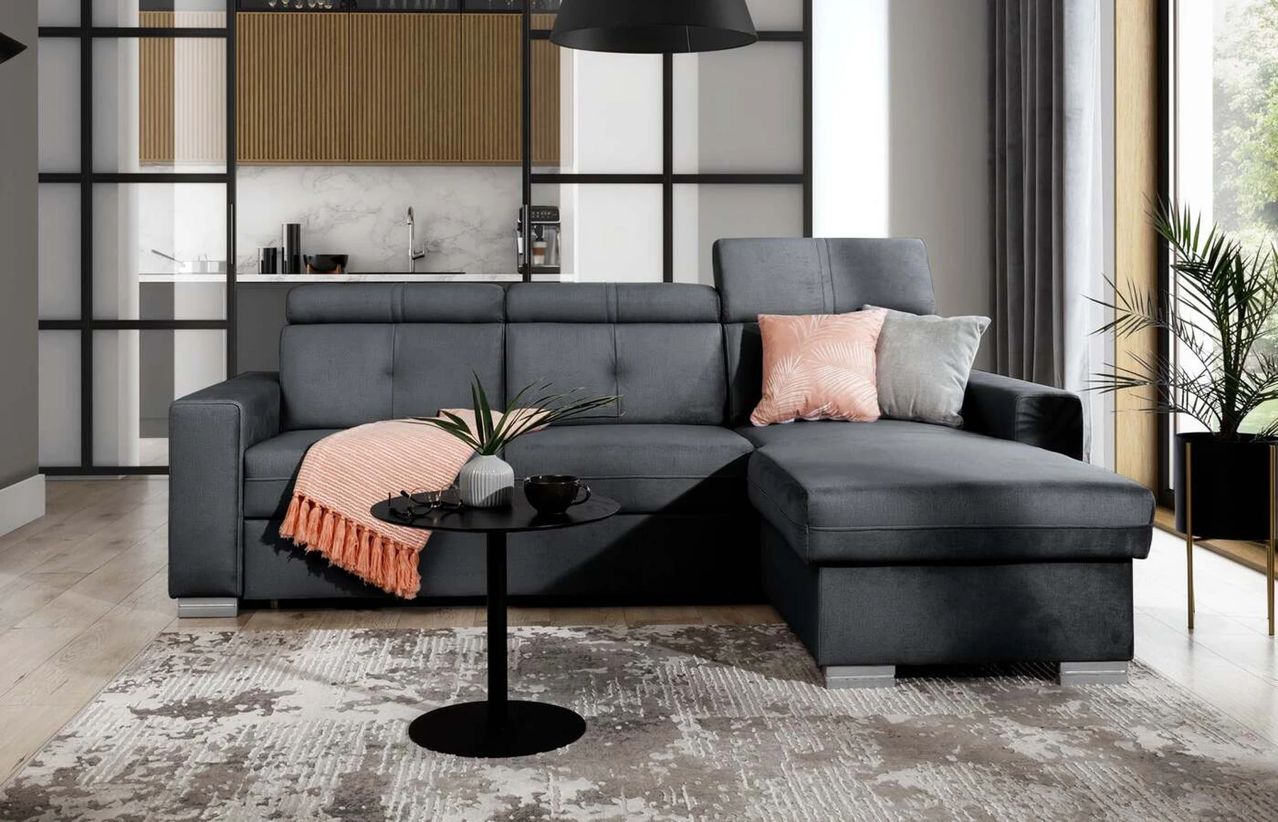 Kampinė sofa EL9641 yra L formos baldas, kuris puikiai atrodo ir buvo sukurtas turint omenyje palaimingą poilsį. Be to, ne tik suteikia estetinių vertybių, bet ir labai funkcionalus bei patogus, nes yra 3 judančios galvos atramos. EL9641 yra 247 cm pločio, 176 cm gylio ir 104 cm aukščio baldas. EL9641 medinės ir chromuotos 5,5 cm ilgio kojelės yra graži puošmena ir pabrėžia elegantišką išvaizdą. Kitas kampinės sofos privalumas – patalynės konteineris, kurio dėka galėsite palaikyti tvarką svetainėje ar svečių kambaryje. Išlankstoma funkcija taip pat suteikia 204 x 126 cm miegamąją zoną – puiki galimybė netikėtai atvykus svečiams. Kampinės sofos atidarymo mechanizmas yra labai populiarus ir patogus delfinų tipas. Įspūdingi kolekcijos apmušalai suteikia baldui charakterio ir stiliaus. Pasiūloje yra tiek klasikinių, tiek originalesnių spalvų. Dėl T30 putų užpildytos sėdynės kampinė sofa užtikrina stabilų atramą ir patogų poilsį. Kita svarbi minkštų baldų dalis – spyruoklės. Kampinėje sofoje EL9641 buvo panaudota B tipo gofruotoji spyruoklė, todėl šio baldo sėdynė yra lankstesnė ir lankstesnė, todėl itin patogi.