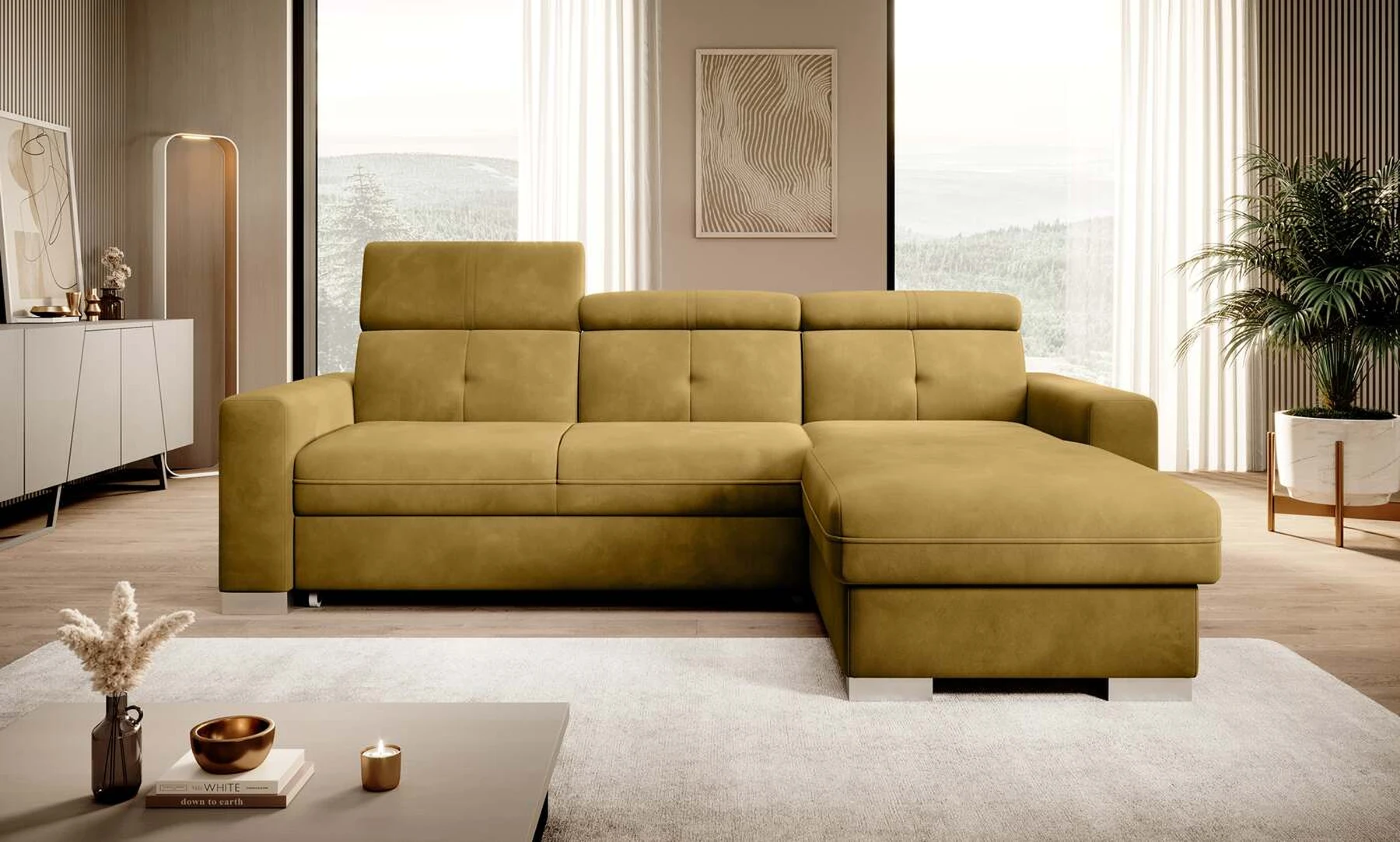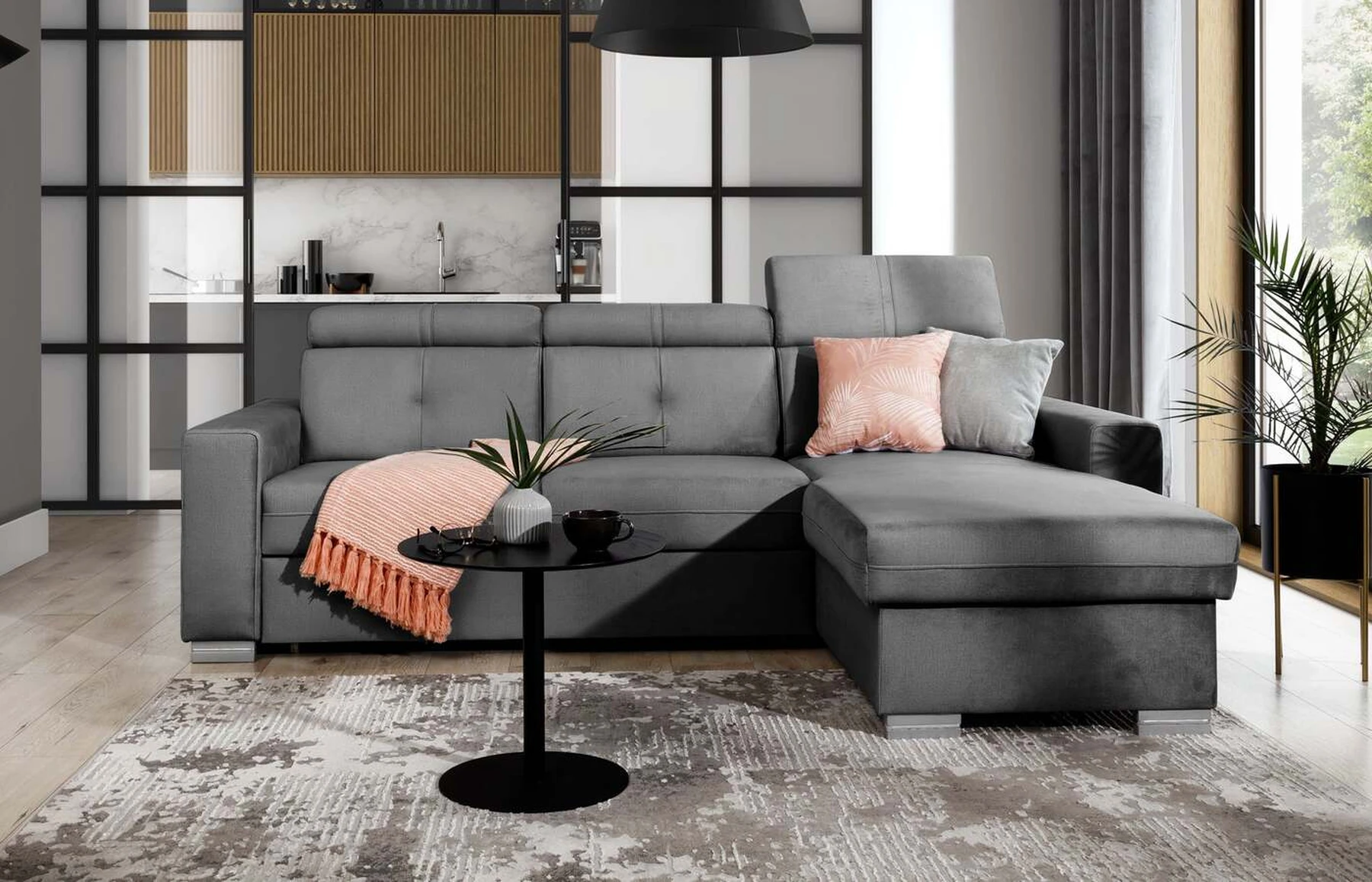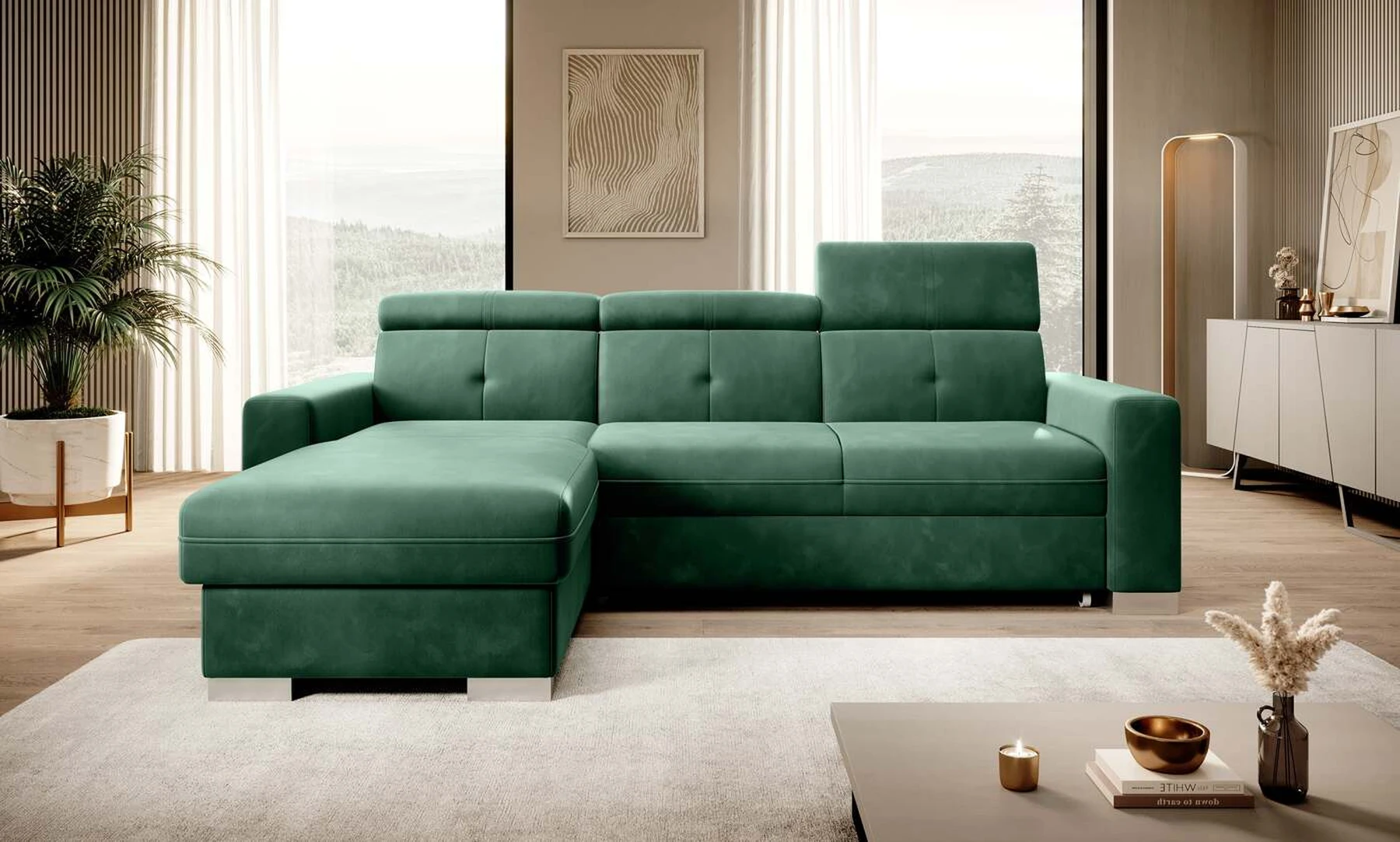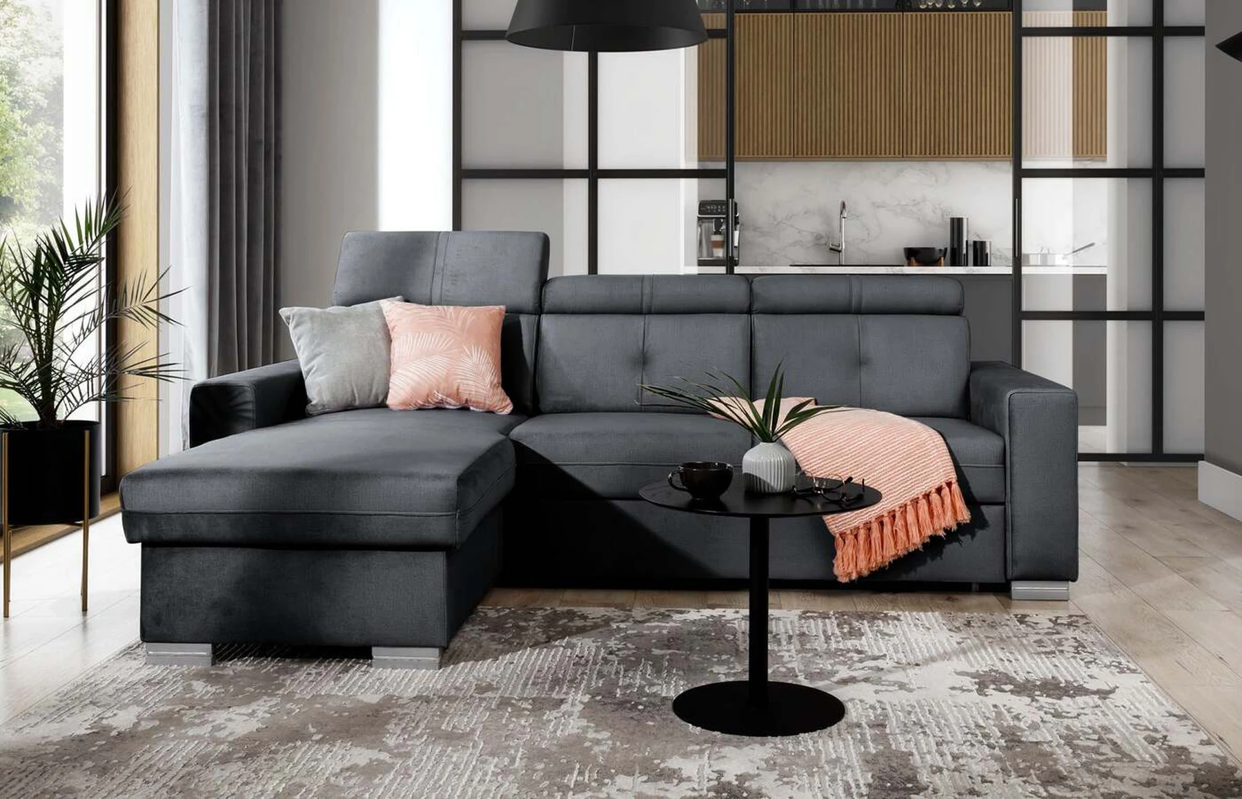 Kampinė sofa EL9641 yra L formos baldas, kuris puikiai atrodo ir buvo sukurtas turint omenyje palaimingą poilsį. Be to, ne tik suteikia estetinių vertybių, bet ir labai funkcionalus bei patogus, nes yra 3 judančios galvos atramos. EL9641 yra 247 cm pločio, 176 cm gylio ir 104 cm aukščio baldas. EL9641 medinės ir chromuotos 5,5 cm ilgio kojelės yra graži puošmena ir pabrėžia elegantišką išvaizdą. Kitas kampinės sofos privalumas – patalynės konteineris, kurio dėka galėsite palaikyti tvarką svetainėje ar svečių kambaryje. Išlankstoma funkcija taip pat suteikia 204 x 126 cm miegamąją zoną – puiki galimybė netikėtai atvykus svečiams. Kampinės sofos atidarymo mechanizmas yra labai populiarus ir patogus delfinų tipas. Įspūdingi kolekcijos apmušalai suteikia baldui charakterio ir stiliaus. Pasiūloje yra tiek klasikinių, tiek originalesnių spalvų. Dėl T30 putų užpildytos sėdynės kampinė sofa užtikrina stabilų atramą ir patogų poilsį. Kita svarbi minkštų baldų dalis – spyruoklės. Kampinėje sofoje EL9641 buvo panaudota B tipo gofruotoji spyruoklė, todėl šio baldo sėdynė yra lankstesnė ir lankstesnė, todėl itin patogi.