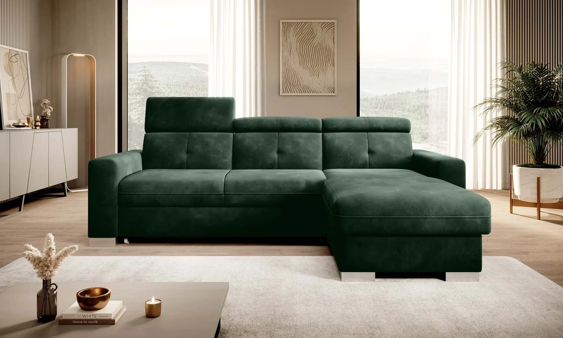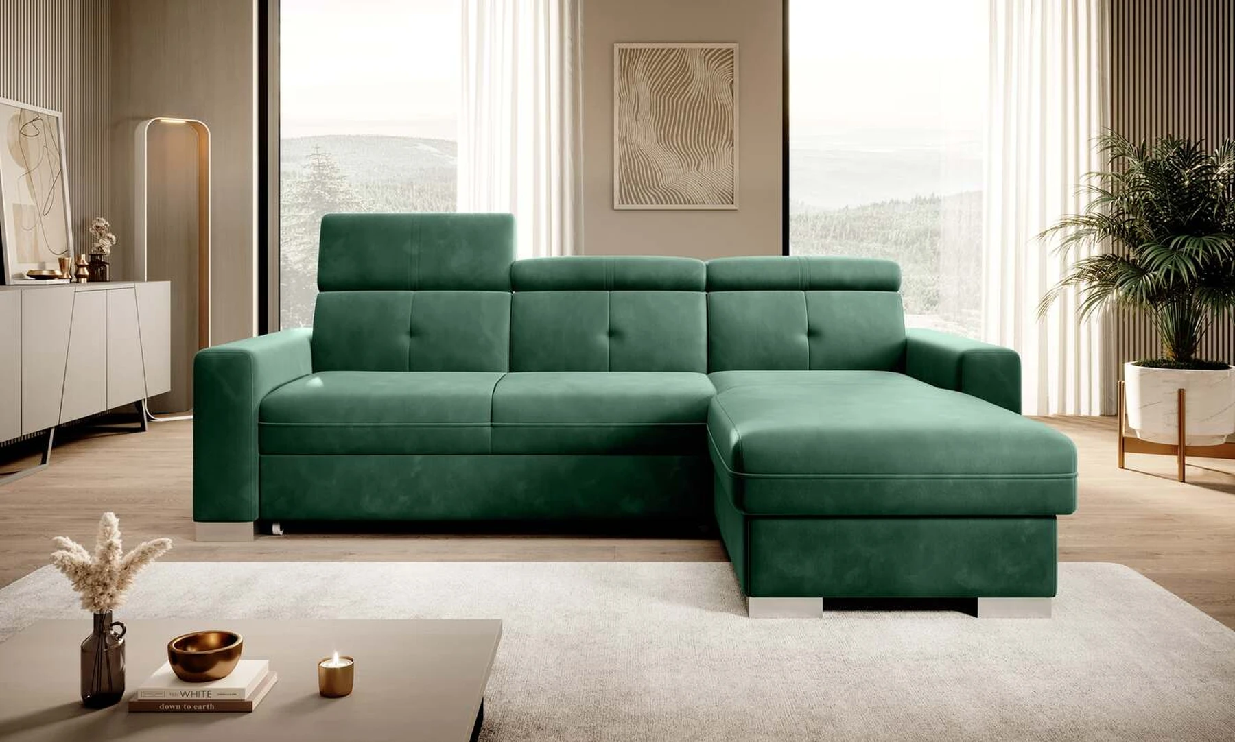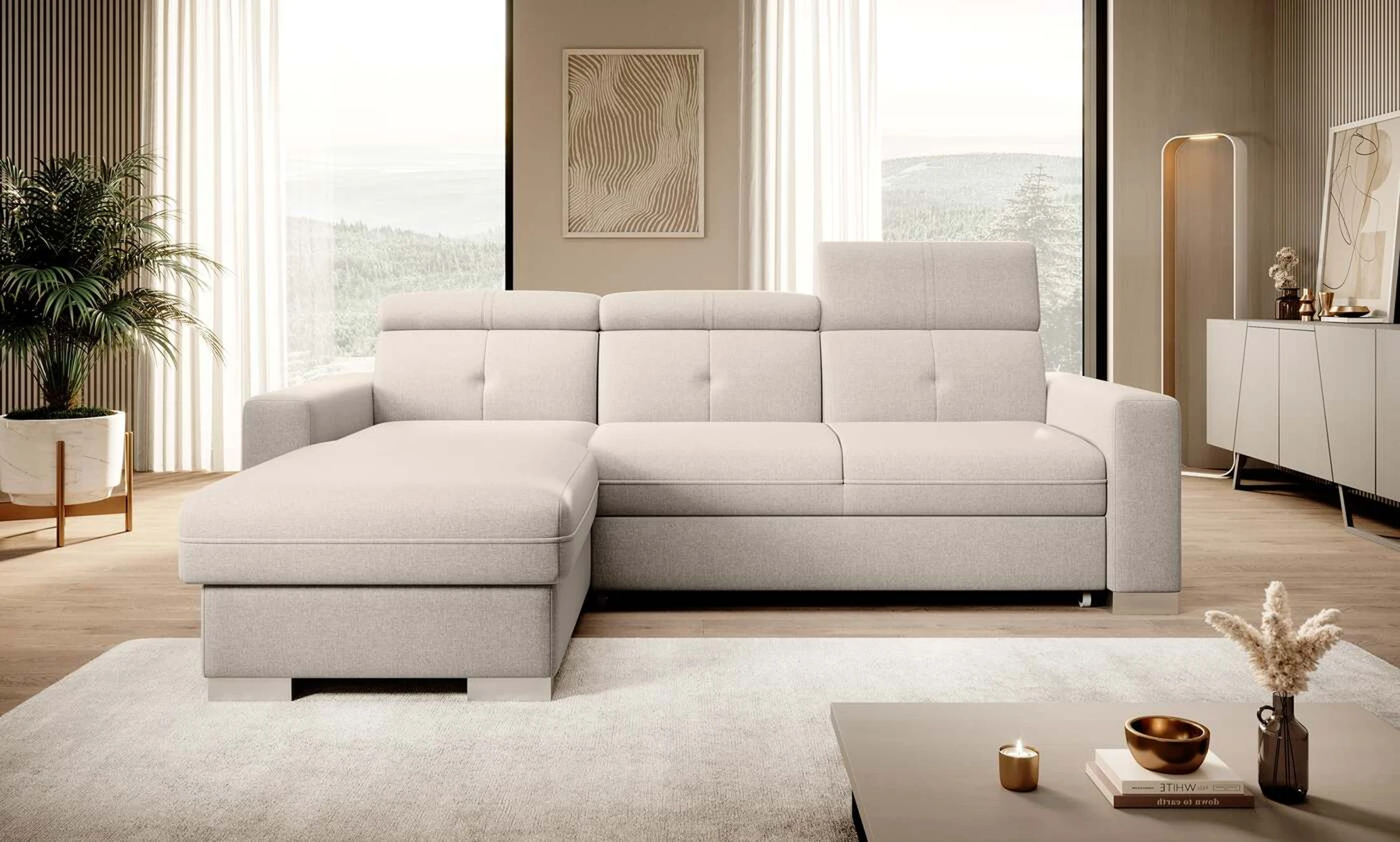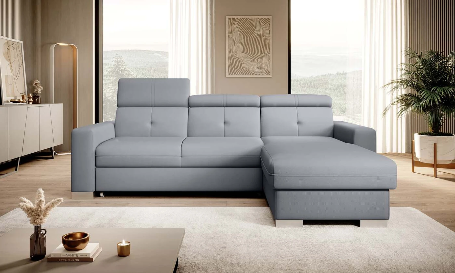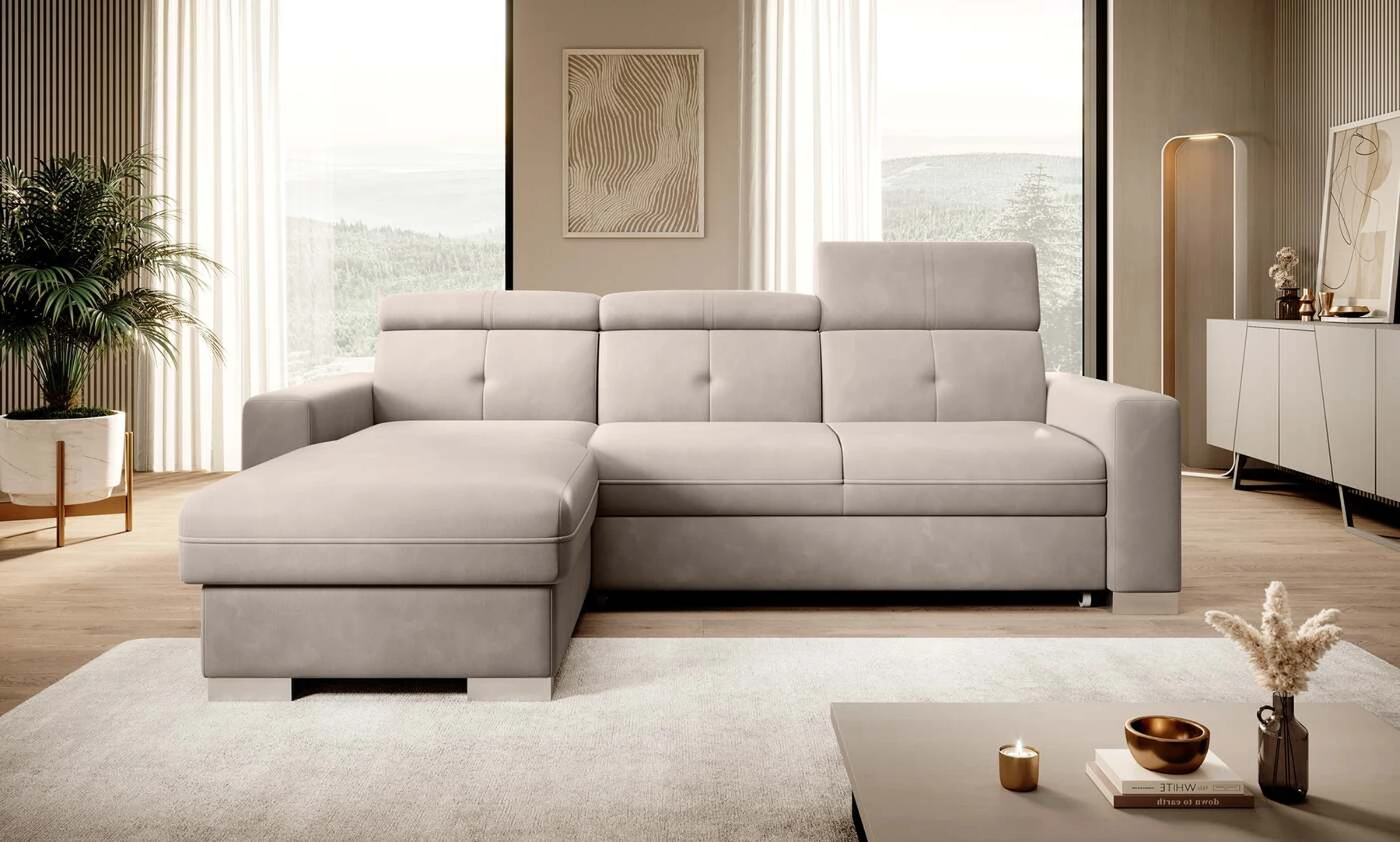 Kampinė sofa EL9641 yra L formos baldas, kuris puikiai atrodo ir buvo sukurtas turint omenyje palaimingą poilsį. Be to, ne tik suteikia estetinių vertybių, bet ir labai funkcionalus bei patogus, nes yra 3 judančios galvos atramos. EL9641 yra 247 cm pločio, 176 cm gylio ir 104 cm aukščio baldas. EL9641 medinės ir chromuotos 5,5 cm ilgio kojelės yra graži puošmena ir pabrėžia elegantišką išvaizdą. Kitas kampinės sofos privalumas – patalynės konteineris, kurio dėka galėsite palaikyti tvarką svetainėje ar svečių kambaryje. Išlankstoma funkcija taip pat suteikia 204 x 126 cm miegamąją zoną – puiki galimybė netikėtai atvykus svečiams. Kampinės sofos atidarymo mechanizmas yra labai populiarus ir patogus delfinų tipas. Įspūdingi kolekcijos apmušalai suteikia baldui charakterio ir stiliaus. Pasiūloje yra tiek klasikinių, tiek originalesnių spalvų. Dėl T30 putų užpildytos sėdynės kampinė sofa užtikrina stabilų atramą ir patogų poilsį. Kita svarbi minkštų baldų dalis – spyruoklės. Kampinėje sofoje EL9641 buvo panaudota B tipo gofruotoji spyruoklė, todėl šio baldo sėdynė yra lankstesnė ir lankstesnė, todėl itin patogi.