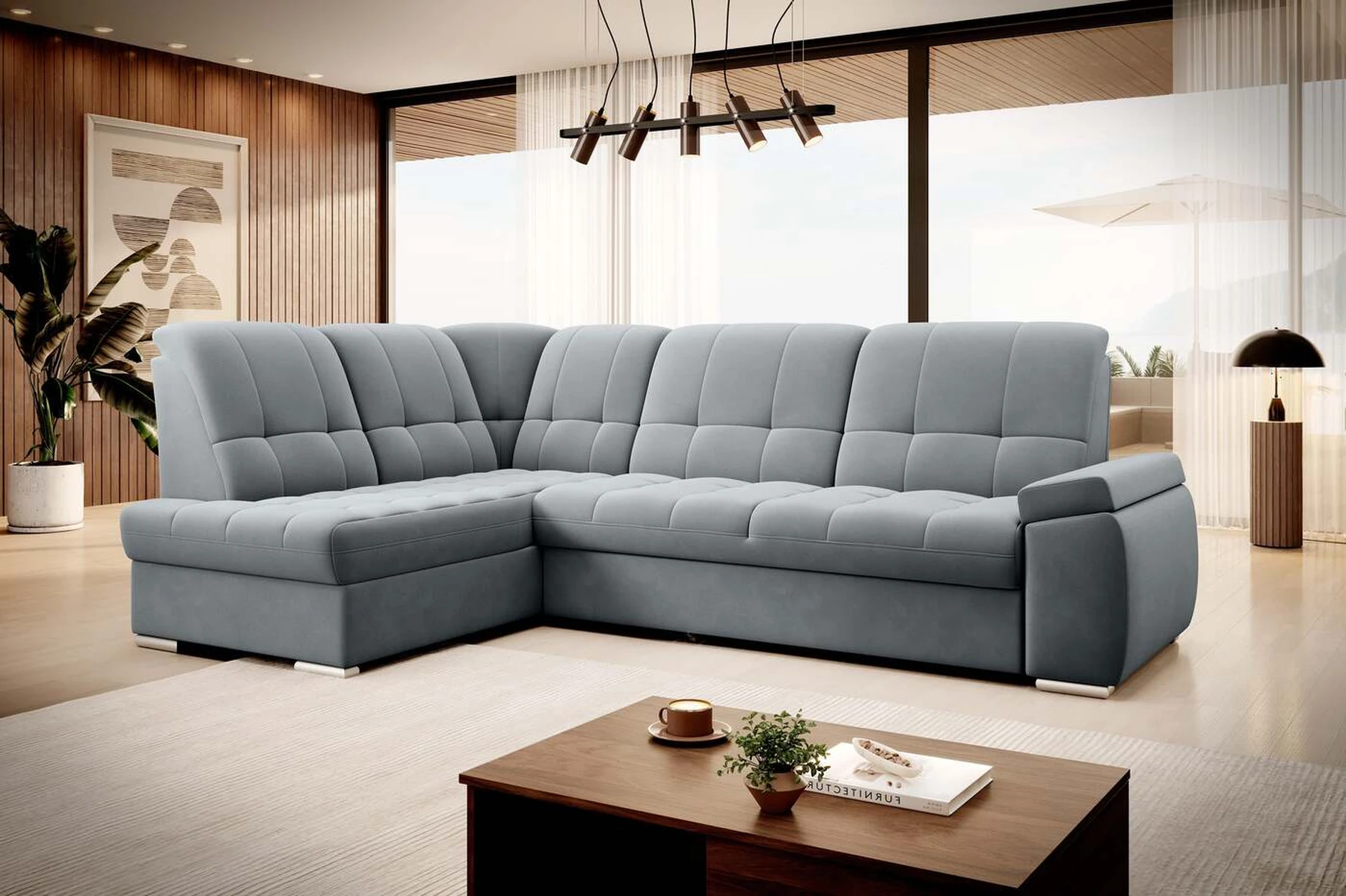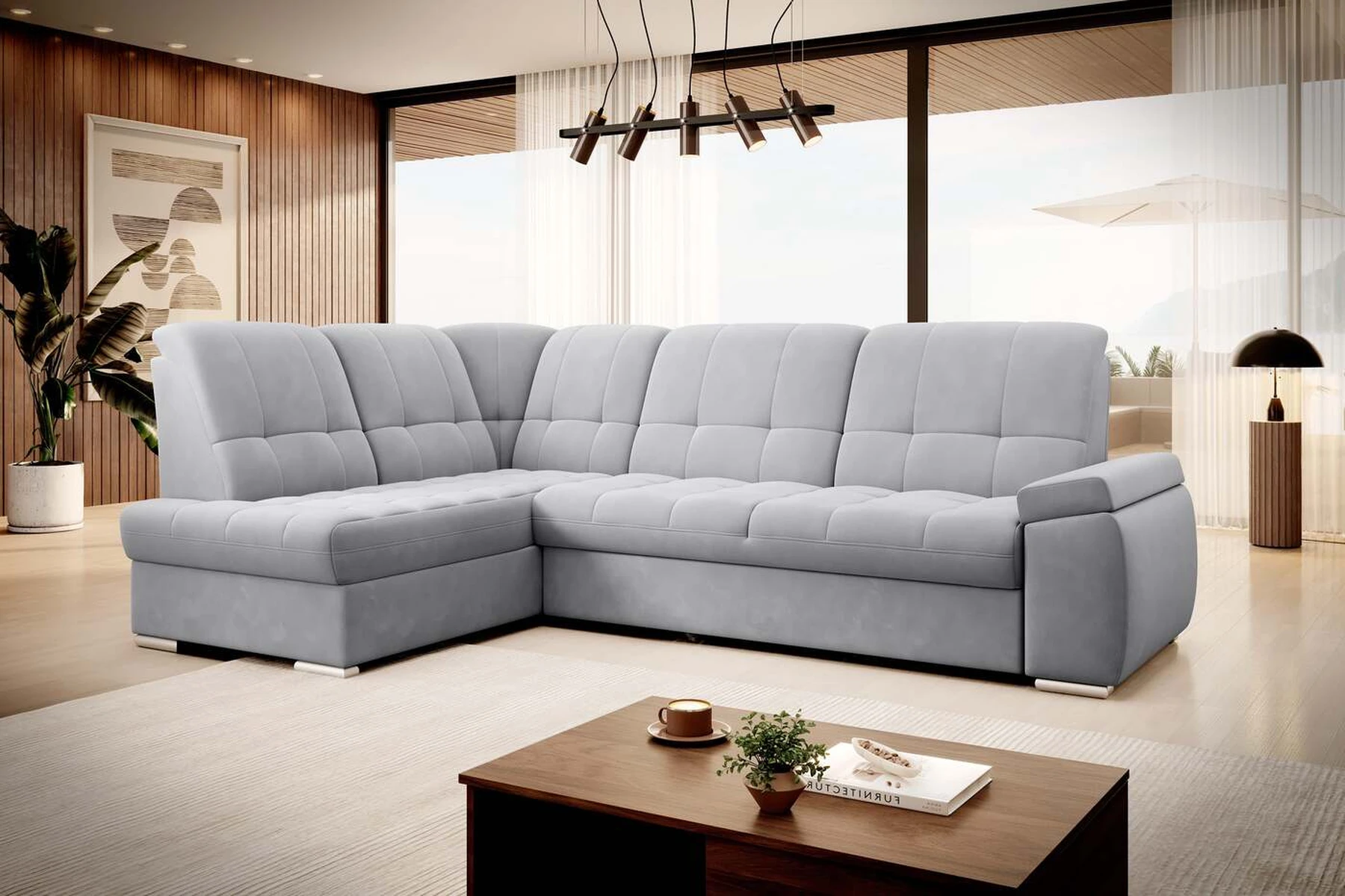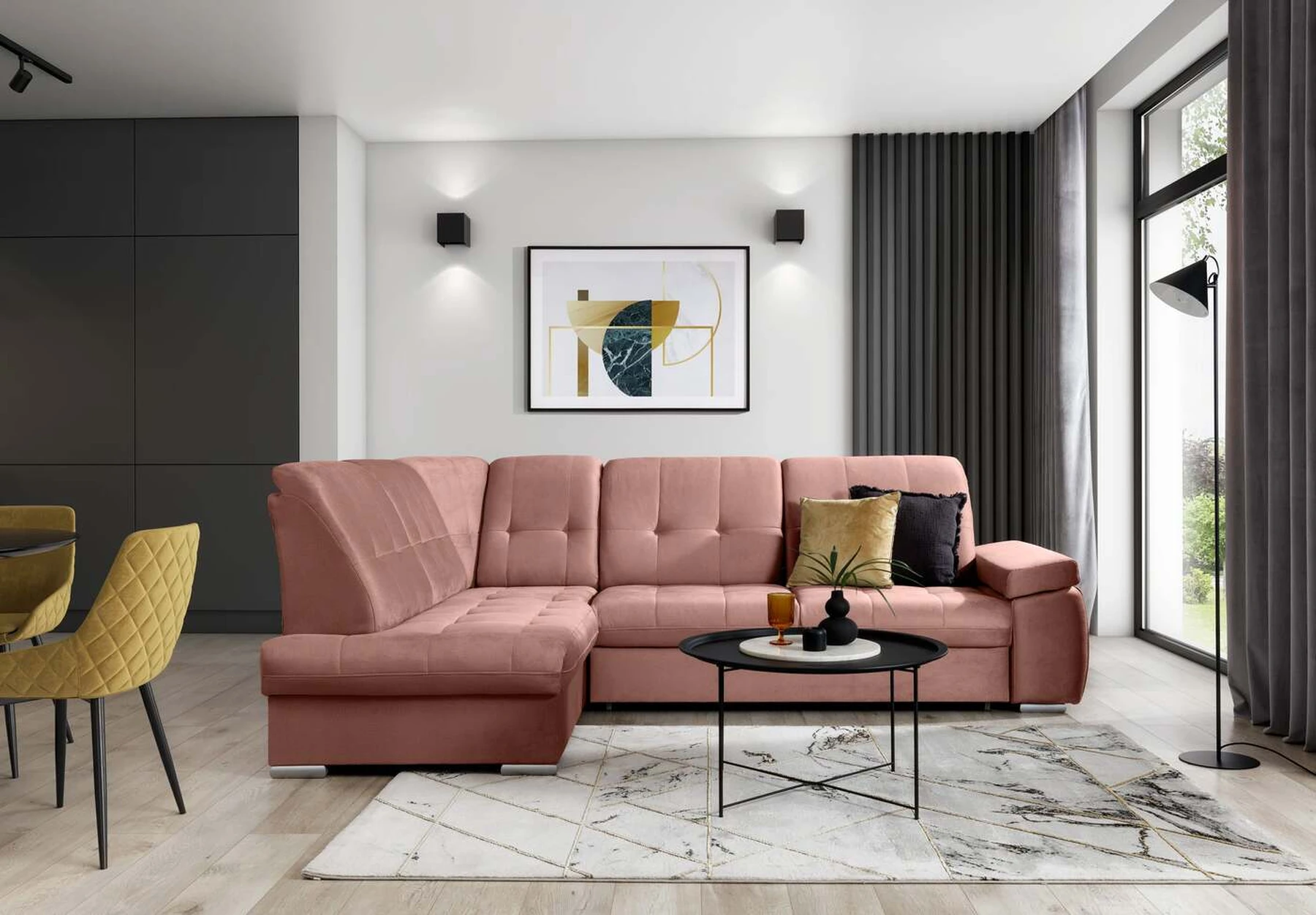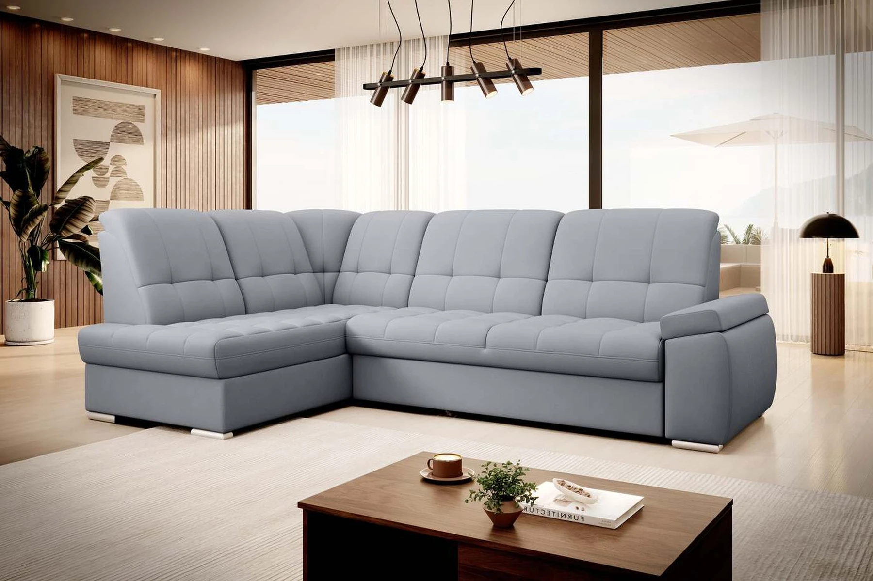 272 x 192 x 95 cm kampinė sofa EL9931 skirta patogiam poilsiui. Puikiai tinka žiūrėti filmus, idealiai tinka knygų skaitymui. Taip yra dėl profiliuoto atlošo su reguliavimo funkcija. Balduose taip pat įrengta 207 x 130 cm ploto sulankstoma miegojimo funkcija, todėl esant poreikiui EL9931 nesunkiai paverssite papildoma lova. Kitas kampinės sofos privalumas – labai paprastas ir intuityvus delfinų mechanizmas, naudojamas šio baldo sulankstymo funkcijai. Be to, pufaje esančiame konteineryje lengvai tilps lovos komplektas. Puiki saugykla žmonėms, kurie vertina erdvę! Taip pat verta paminėti patogų, profiliuotą porankį ir elegantiškas, sidabruotas medines kojas, kurios puikiai tiks šiuolaikiškose svetainėse. Be to, galite rinktis iš daugybės audinių, esančių plačioje kampinei sofos EL9931 medžiagų kolekcijoje.