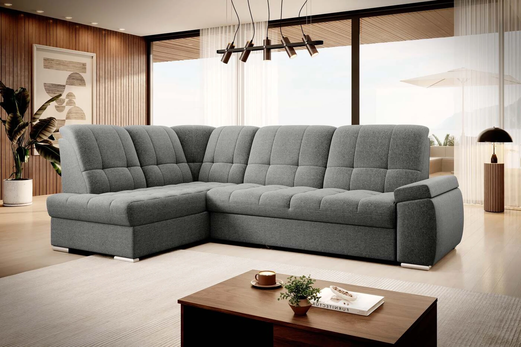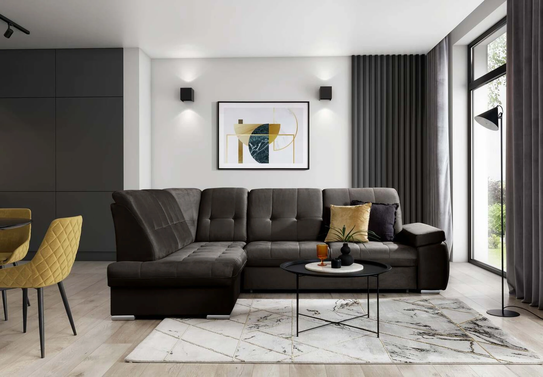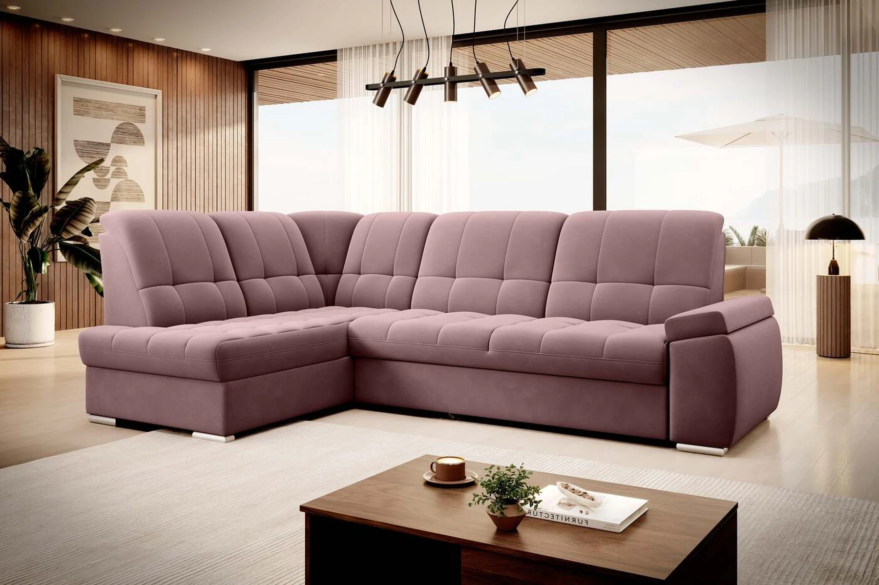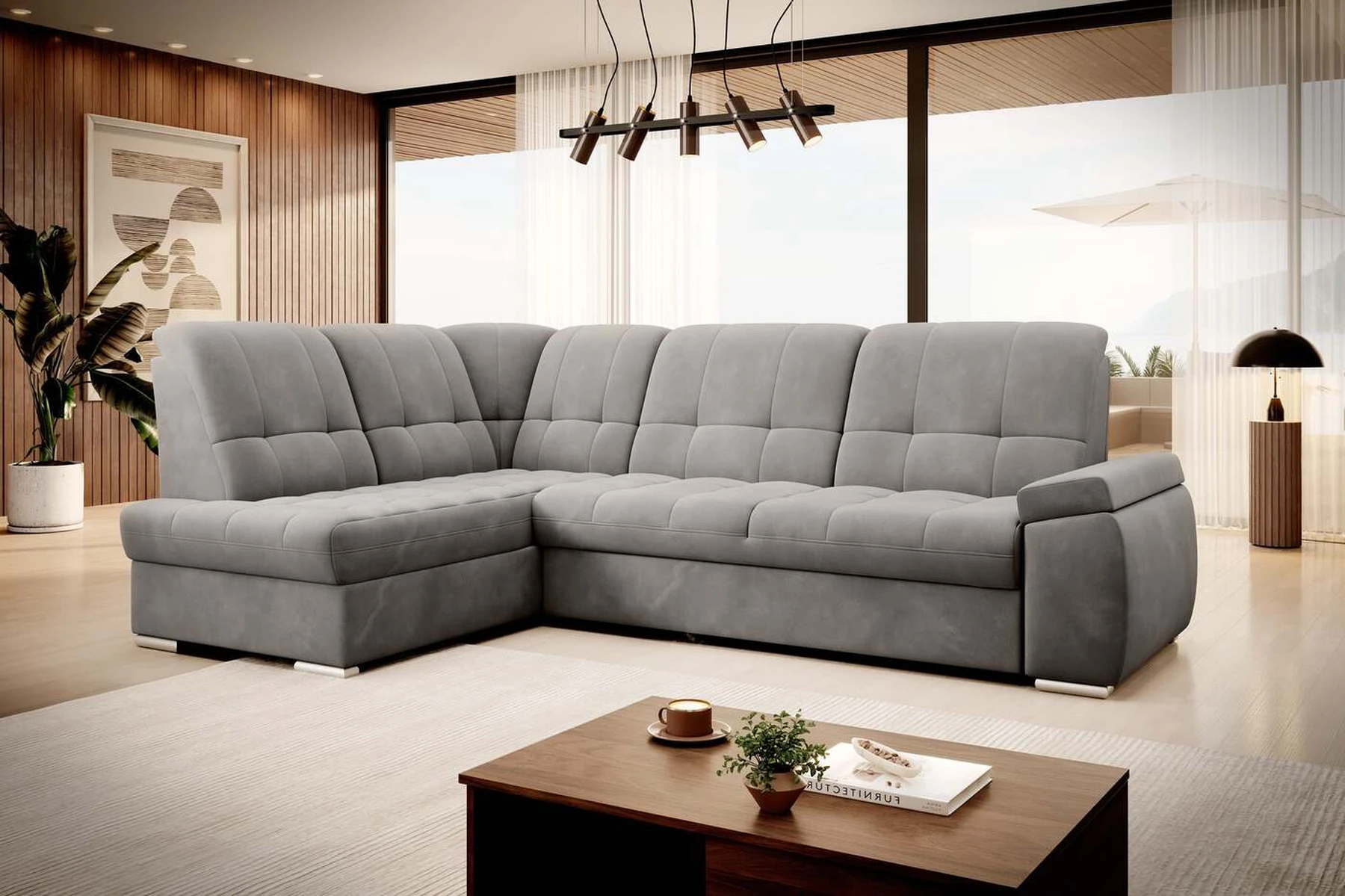 272 x 192 x 95 cm kampinė sofa EL9931 skirta patogiam poilsiui. Puikiai tinka žiūrėti filmus, idealiai tinka knygų skaitymui. Taip yra dėl profiliuoto atlošo su reguliavimo funkcija. Balduose taip pat įrengta 207 x 130 cm ploto sulankstoma miegojimo funkcija, todėl esant poreikiui EL9931 nesunkiai paverssite papildoma lova. Kitas kampinės sofos privalumas – labai paprastas ir intuityvus delfinų mechanizmas, naudojamas šio baldo sulankstymo funkcijai. Be to, pufaje esančiame konteineryje lengvai tilps lovos komplektas. Puiki saugykla žmonėms, kurie vertina erdvę! Taip pat verta paminėti patogų, profiliuotą porankį ir elegantiškas, sidabruotas medines kojas, kurios puikiai tiks šiuolaikiškose svetainėse. Be to, galite rinktis iš daugybės audinių, esančių plačioje kampinei sofos EL9931 medžiagų kolekcijoje.