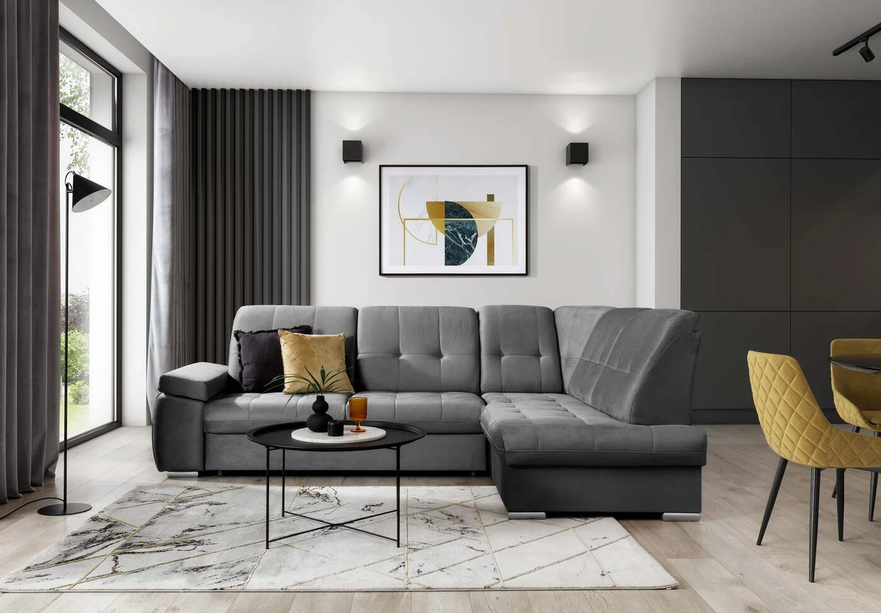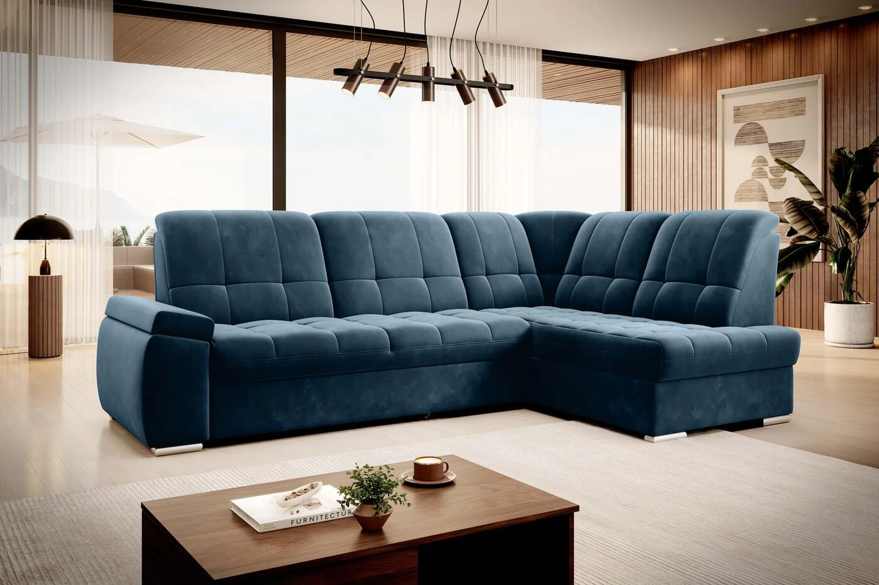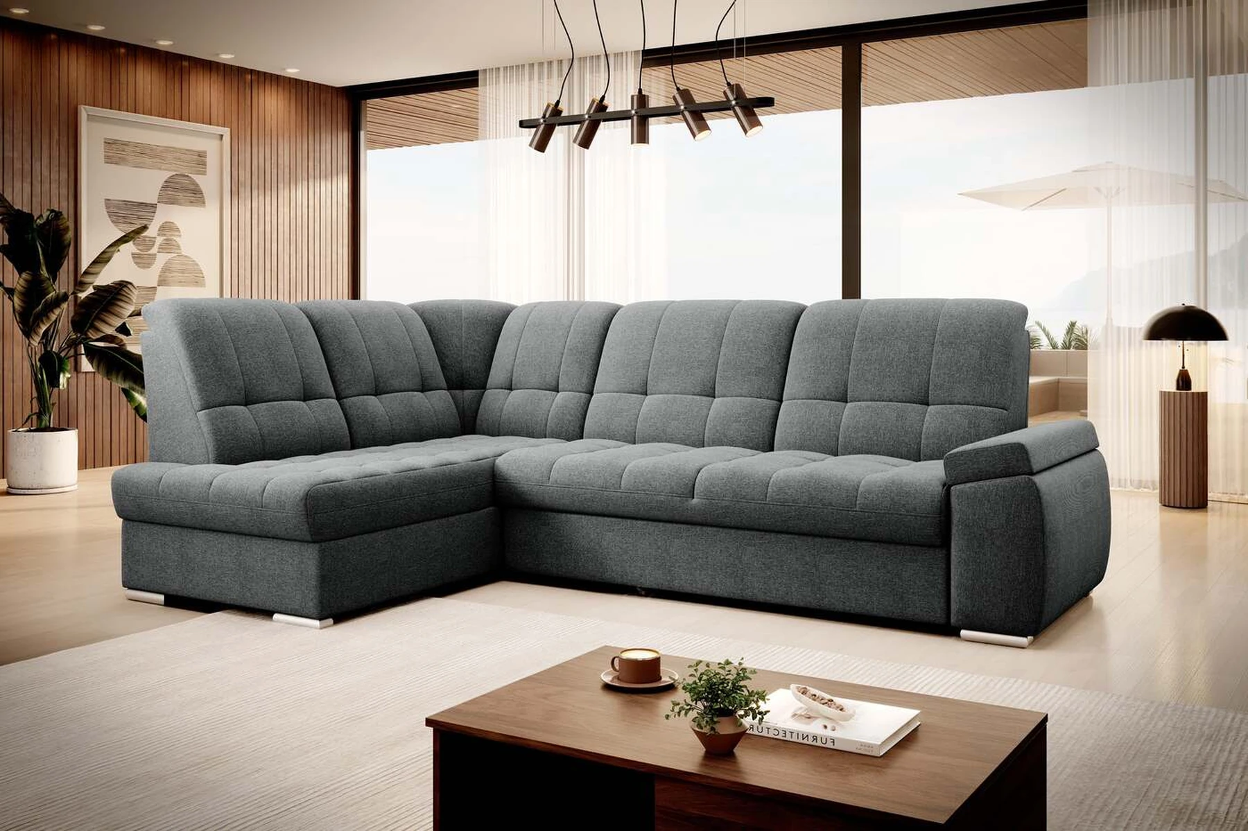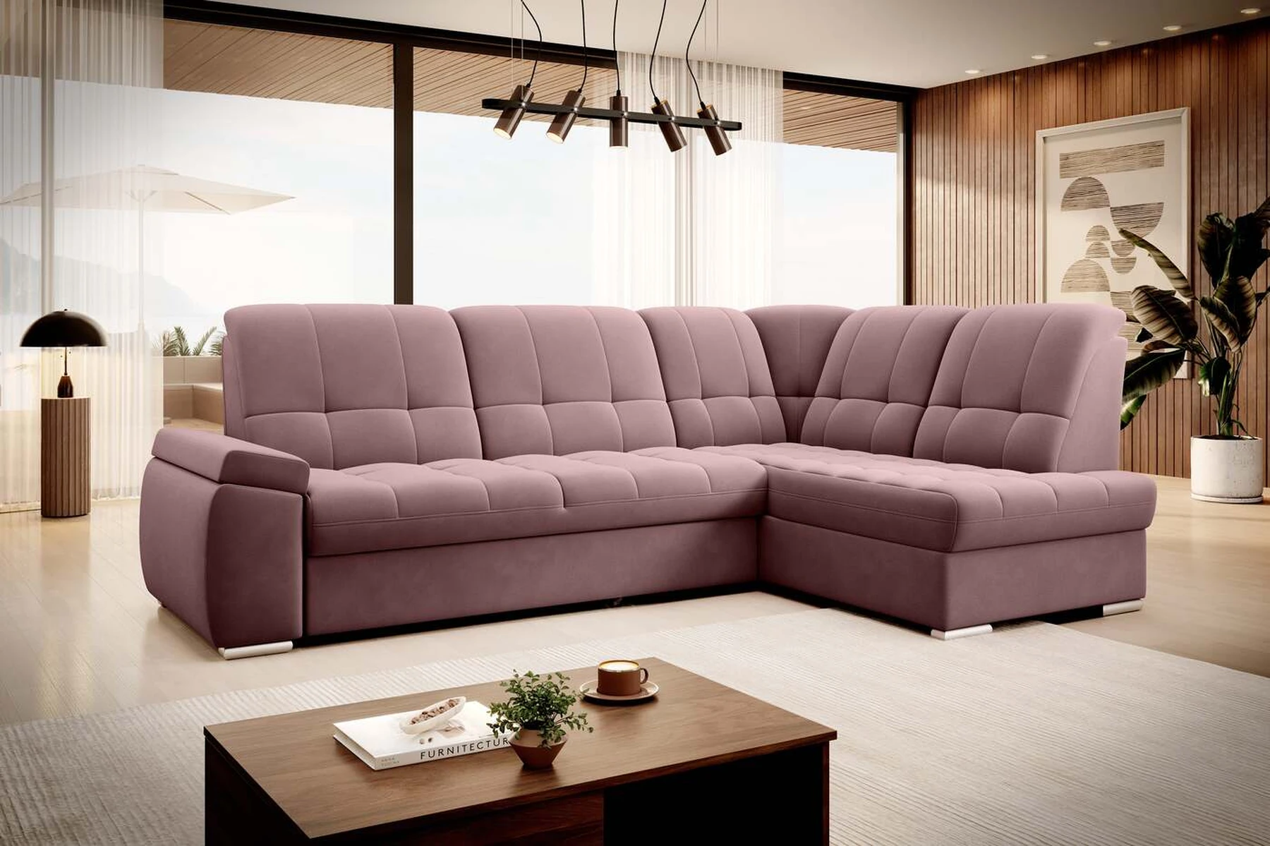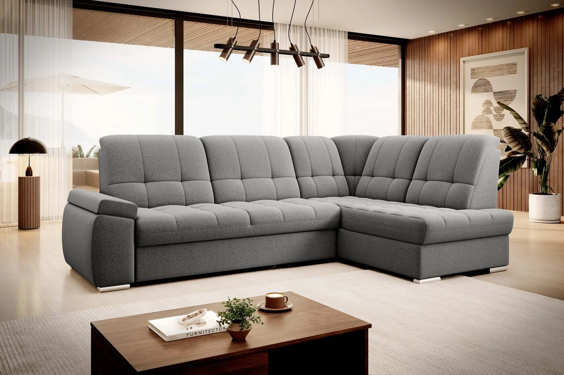 272 x 192 x 95 cm kampinė sofa EL9931 skirta patogiam poilsiui. Puikiai tinka žiūrėti filmus, idealiai tinka knygų skaitymui. Taip yra dėl profiliuoto atlošo su reguliavimo funkcija. Balduose taip pat įrengta 207 x 130 cm ploto sulankstoma miegojimo funkcija, todėl esant poreikiui EL9931 nesunkiai paverssite papildoma lova. Kitas kampinės sofos privalumas – labai paprastas ir intuityvus delfinų mechanizmas, naudojamas šio baldo sulankstymo funkcijai. Be to, pufaje esančiame konteineryje lengvai tilps lovos komplektas. Puiki saugykla žmonėms, kurie vertina erdvę! Taip pat verta paminėti patogų, profiliuotą porankį ir elegantiškas, sidabruotas medines kojas, kurios puikiai tiks šiuolaikiškose svetainėse. Be to, galite rinktis iš daugybės audinių, esančių plačioje kampinei sofos EL9931 medžiagų kolekcijoje.