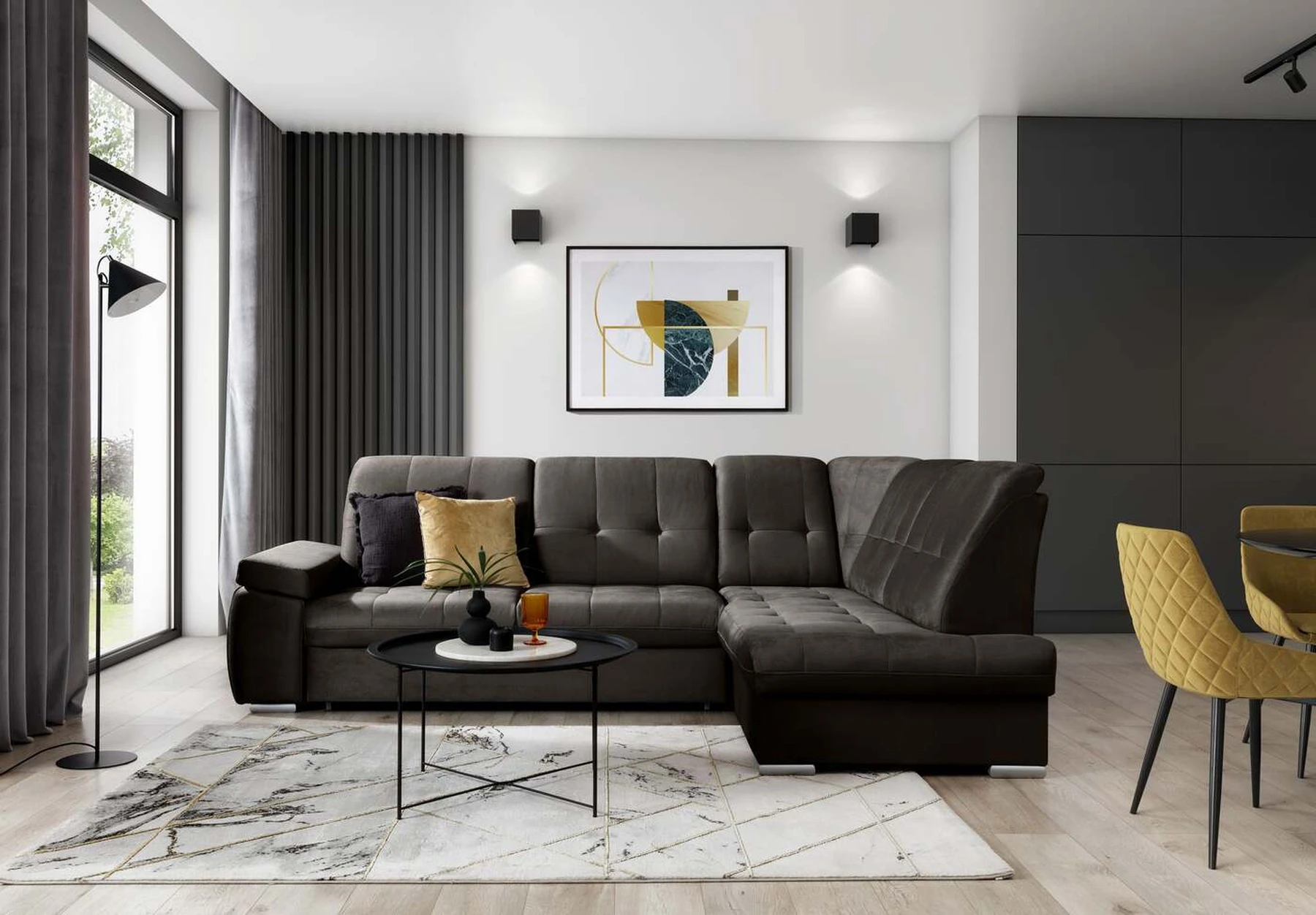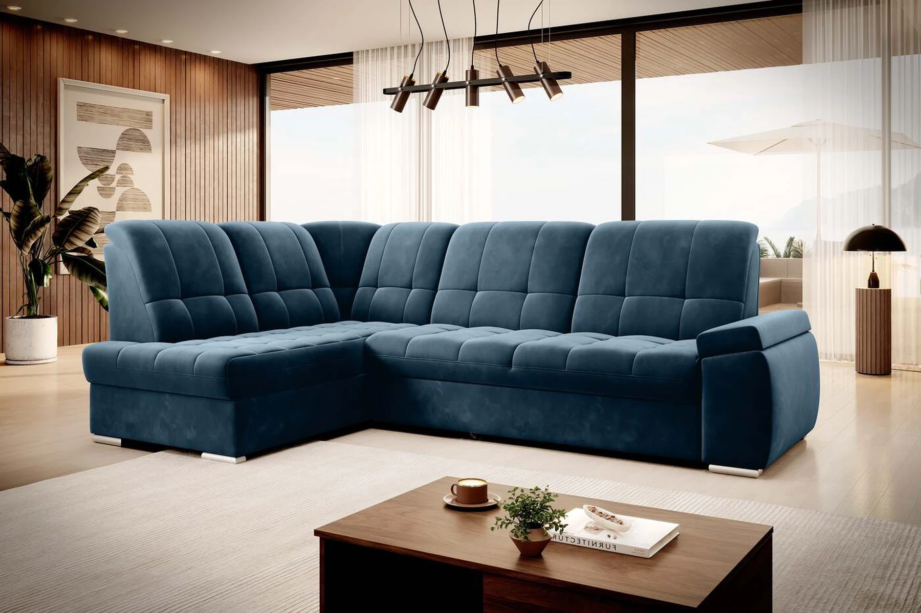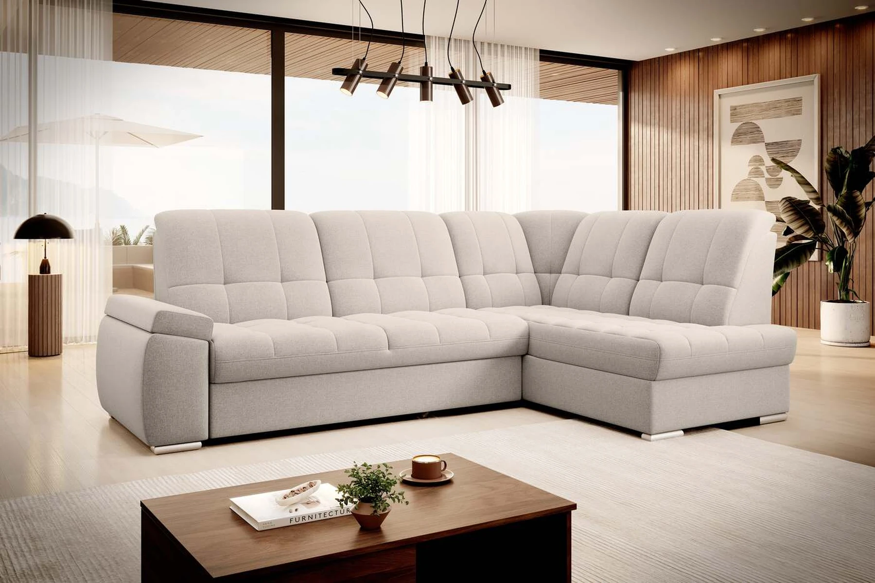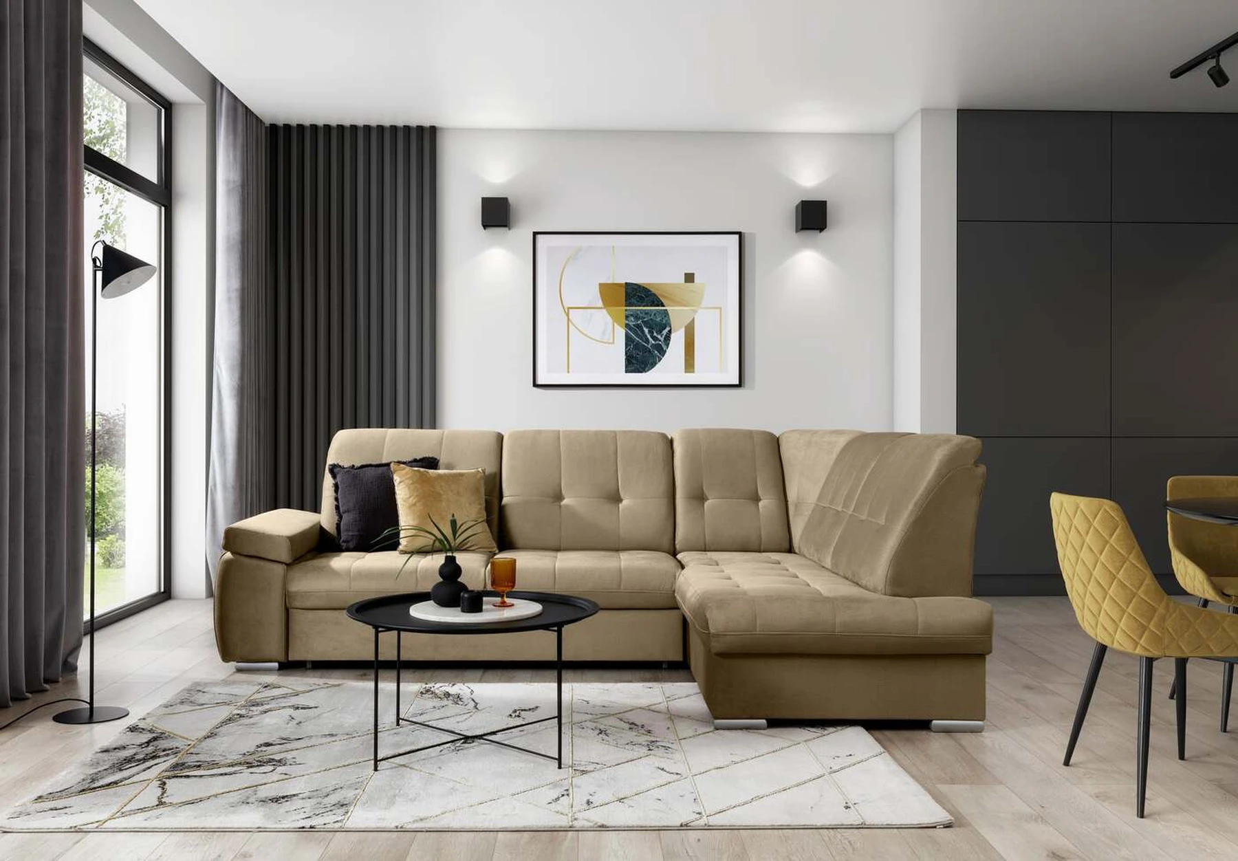 272 x 192 x 95 cm kampinė sofa EL9931 skirta patogiam poilsiui. Puikiai tinka žiūrėti filmus, idealiai tinka knygų skaitymui. Taip yra dėl profiliuoto atlošo su reguliavimo funkcija. Balduose taip pat įrengta 207 x 130 cm ploto sulankstoma miegojimo funkcija, todėl esant poreikiui EL9931 nesunkiai paverssite papildoma lova. Kitas kampinės sofos privalumas – labai paprastas ir intuityvus delfinų mechanizmas, naudojamas šio baldo sulankstymo funkcijai. Be to, pufaje esančiame konteineryje lengvai tilps lovos komplektas. Puiki saugykla žmonėms, kurie vertina erdvę! Taip pat verta paminėti patogų, profiliuotą porankį ir elegantiškas, sidabruotas medines kojas, kurios puikiai tiks šiuolaikiškose svetainėse. Be to, galite rinktis iš daugybės audinių, esančių plačioje kampinei sofos EL9931 medžiagų kolekcijoje.