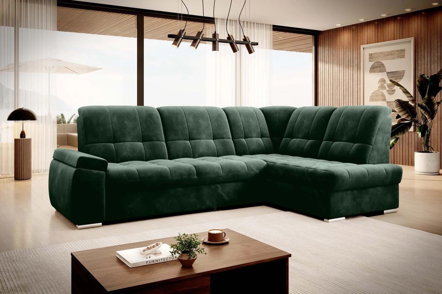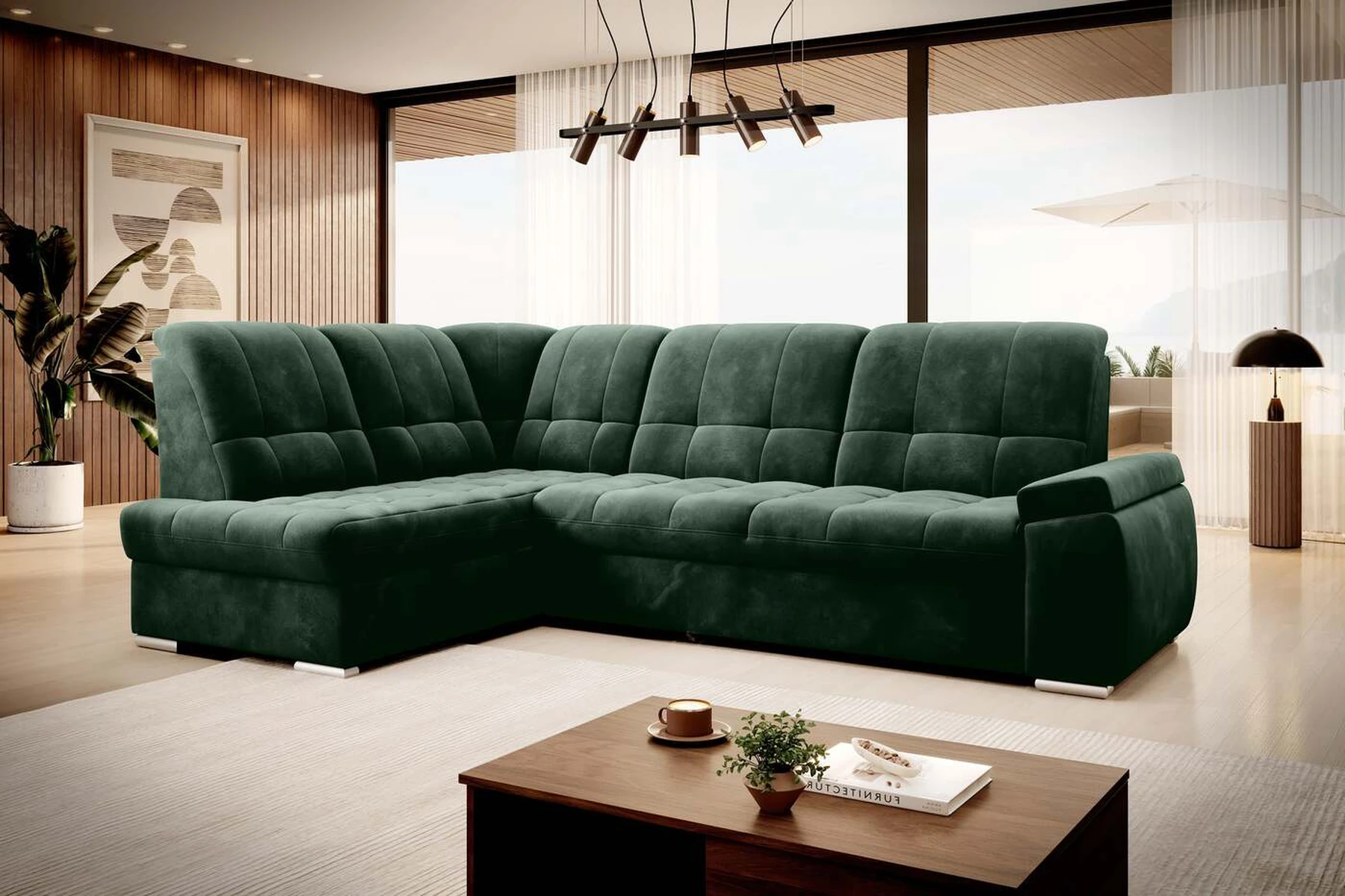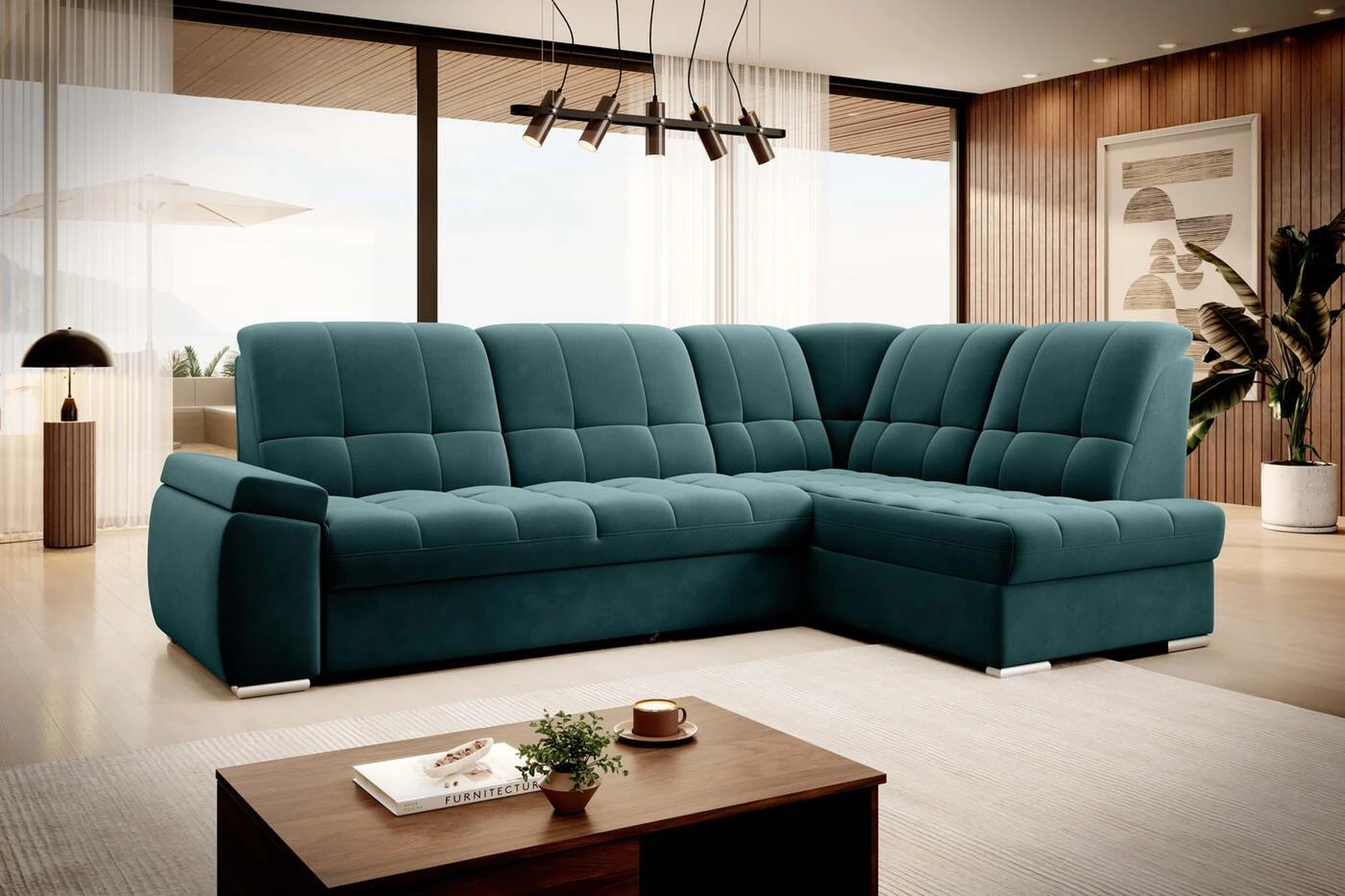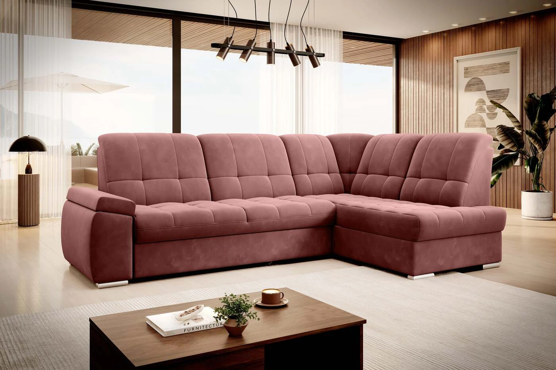 272 x 192 x 95 cm kampinė sofa EL9931 skirta patogiam poilsiui. Puikiai tinka žiūrėti filmus, idealiai tinka knygų skaitymui. Taip yra dėl profiliuoto atlošo su reguliavimo funkcija. Balduose taip pat įrengta 207 x 130 cm ploto sulankstoma miegojimo funkcija, todėl esant poreikiui EL9931 nesunkiai paverssite papildoma lova. Kitas kampinės sofos privalumas – labai paprastas ir intuityvus delfinų mechanizmas, naudojamas šio baldo sulankstymo funkcijai. Be to, pufaje esančiame konteineryje lengvai tilps lovos komplektas. Puiki saugykla žmonėms, kurie vertina erdvę! Taip pat verta paminėti patogų, profiliuotą porankį ir elegantiškas, sidabruotas medines kojas, kurios puikiai tiks šiuolaikiškose svetainėse. Be to, galite rinktis iš daugybės audinių, esančių plačioje kampinei sofos EL9931 medžiagų kolekcijoje.