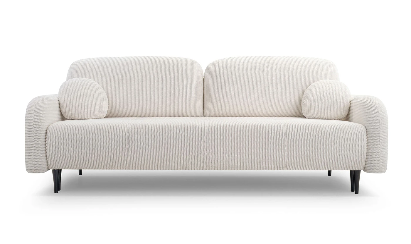 Patogi ir patogi sofa yra duoklė septintojo dešimtmečio dizainui. Apvalios, švelnios formos, struktūrinis audinys, dekoratyvinės pagalvės ir kontrastingos medinės kojelės suteiks jaukią atmosferą bet kokiam interjerui.