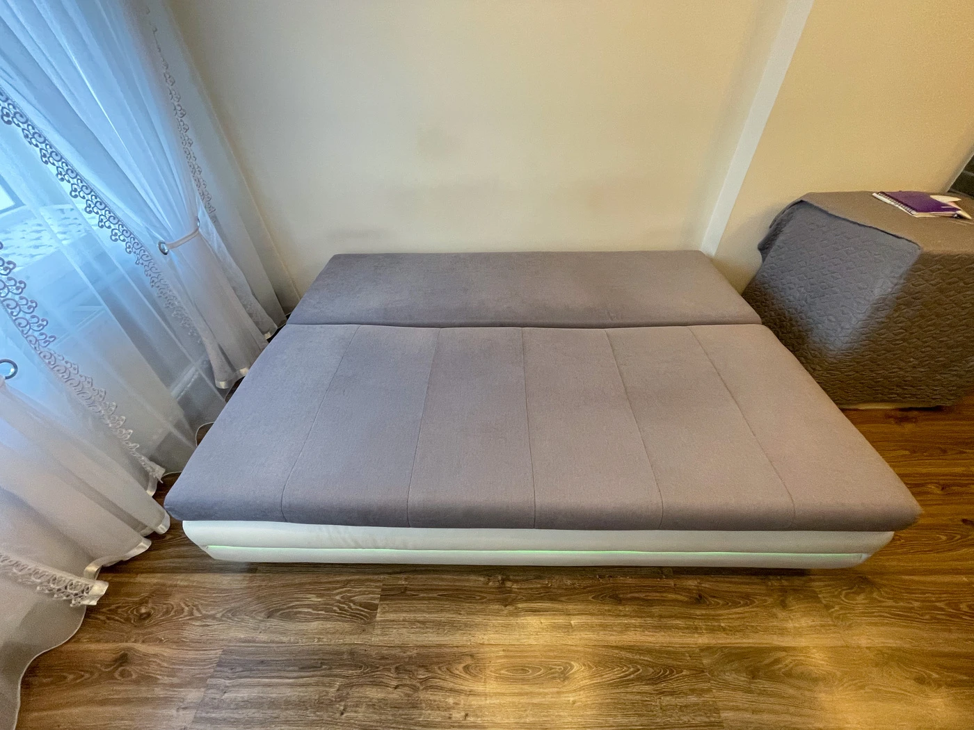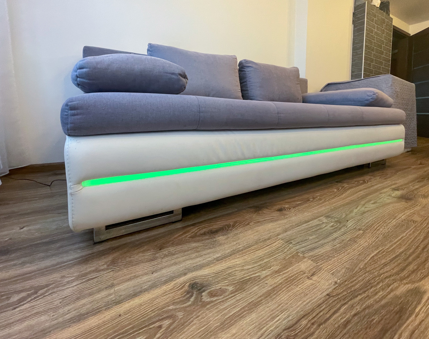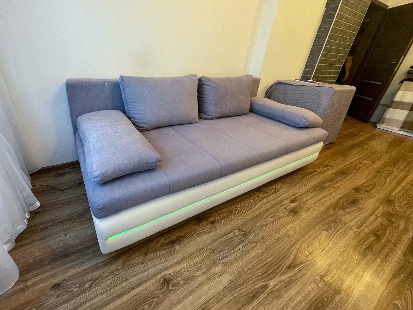 Parduodama geros būklės sofa-lova. Ilgis 200 cm, plotis 100 cm, aukštis 80 cm. Plotis išskleidus 150 cm. Sofa turi RGB apšvietimą (žr. paskutines foto). Defektai matomi nuotraukose - šiek tiek apgadinta eco oda sofos kampuose. Pasiimti patiems, vieta - Eišiškės, Šalčininkų r. Kaina 200 Eur. Kreiptis 864579786