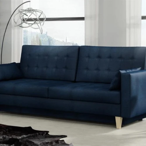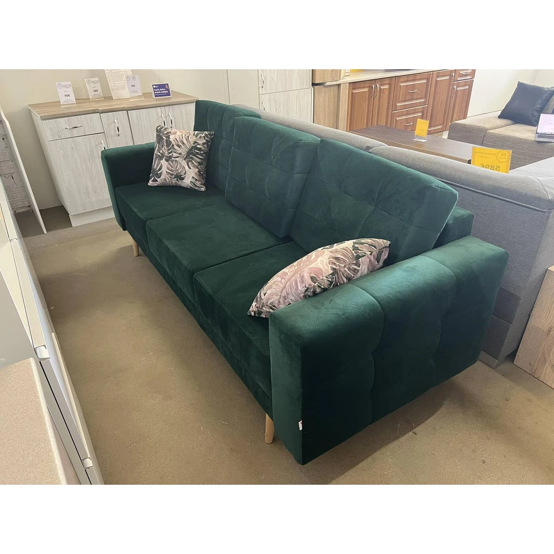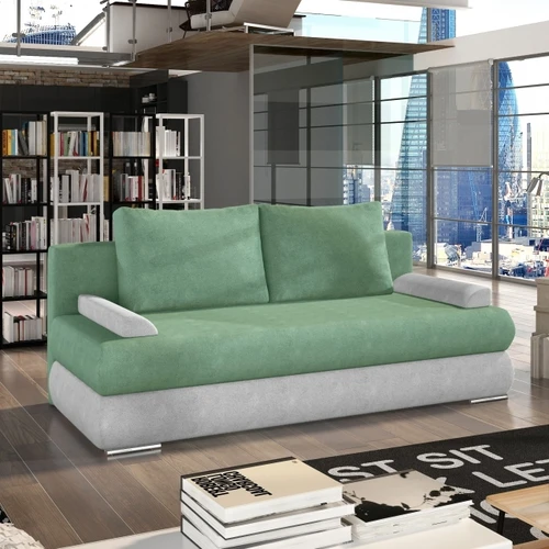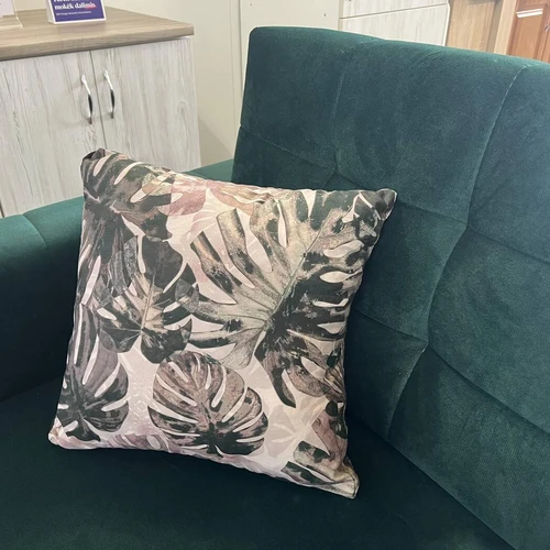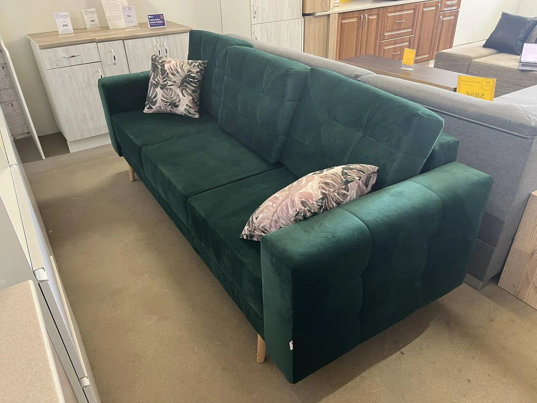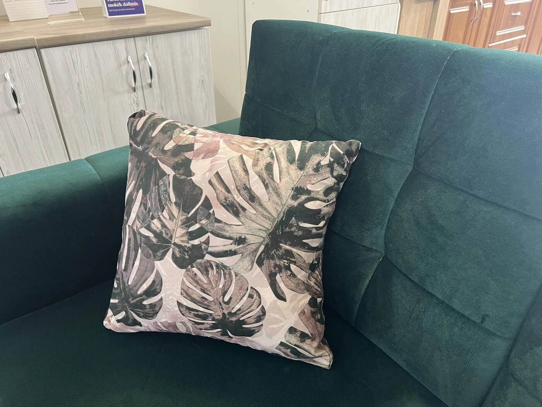 Parduodama nauja sofa iš ekspozicijos už akcijinę kainą - 499 eur. Veliūrinis audinys, kuris puikiai valosi, yra švelnus. Yra patalynės dėžė ir lovos mechanizmas. Labai geras sofos aukščio ir gylio santykis - patogu sėdėti, vidutinis minkštumas, tad puikiai tinka miegojimui kasdien. Prie sofos į komplektą įeina dvi pagalvėlės su lapais.