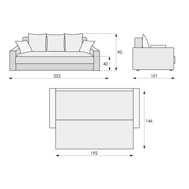 Sofa-lova SANTA turi plačią ir minkštą sėdimą vietą, pritaikytą patogiam poilsiui. Į komplektą įeiną pagalvėlės, kurios pagyvina modelį ir suteikia jam dar daugiau patogumo. Transformacijos mechanizmas "Euronyga" skirtas pastoviam naudojimui. Sofa turi erdvią patalynės dėžę.