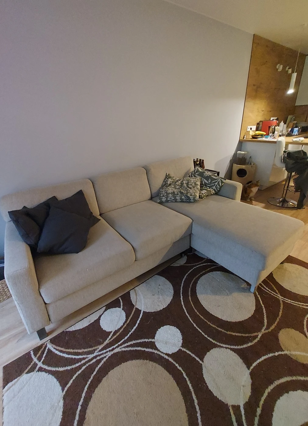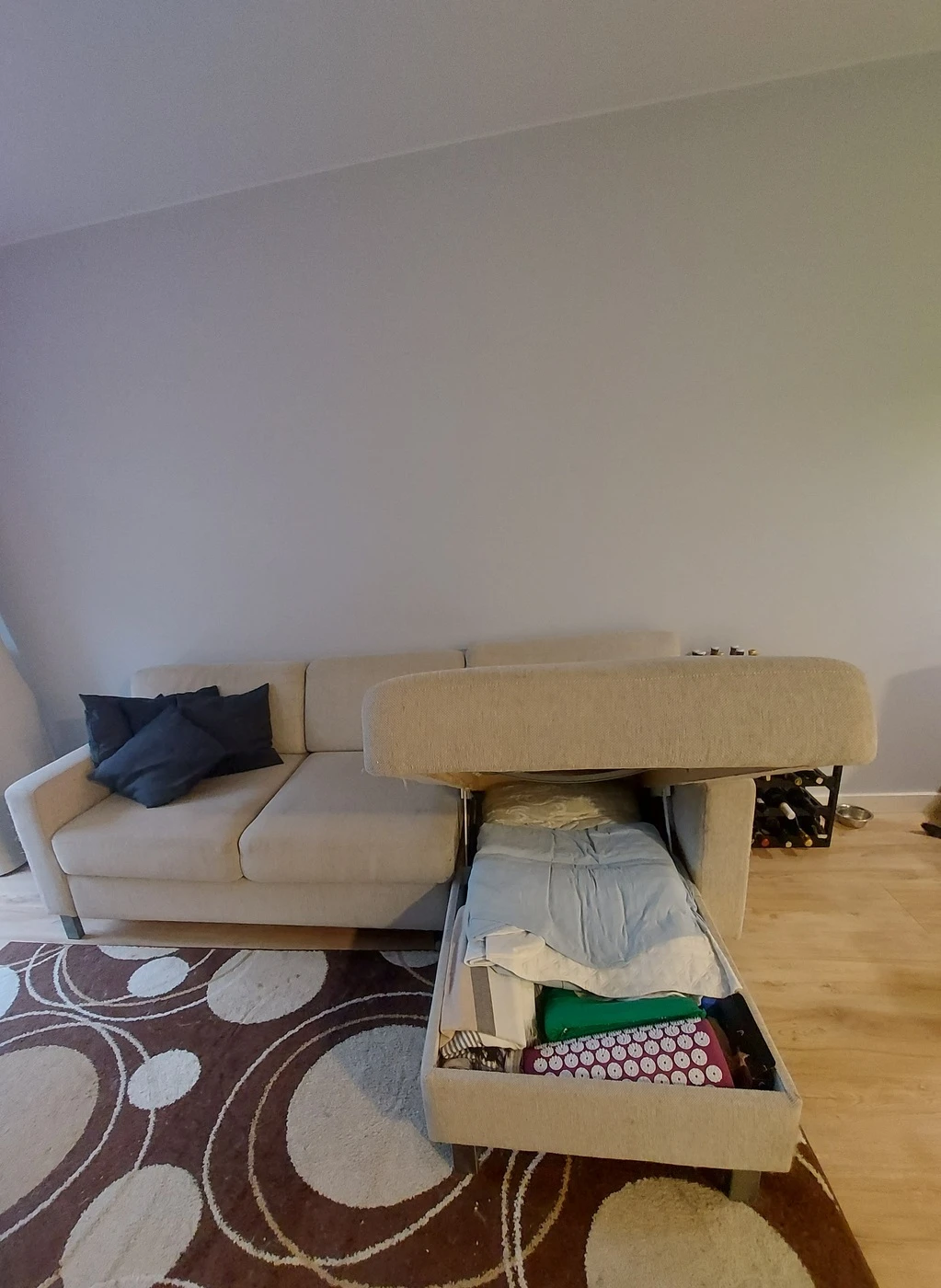 Ilgojoje sofos dalyje yra stalčius daiktams laikyti.