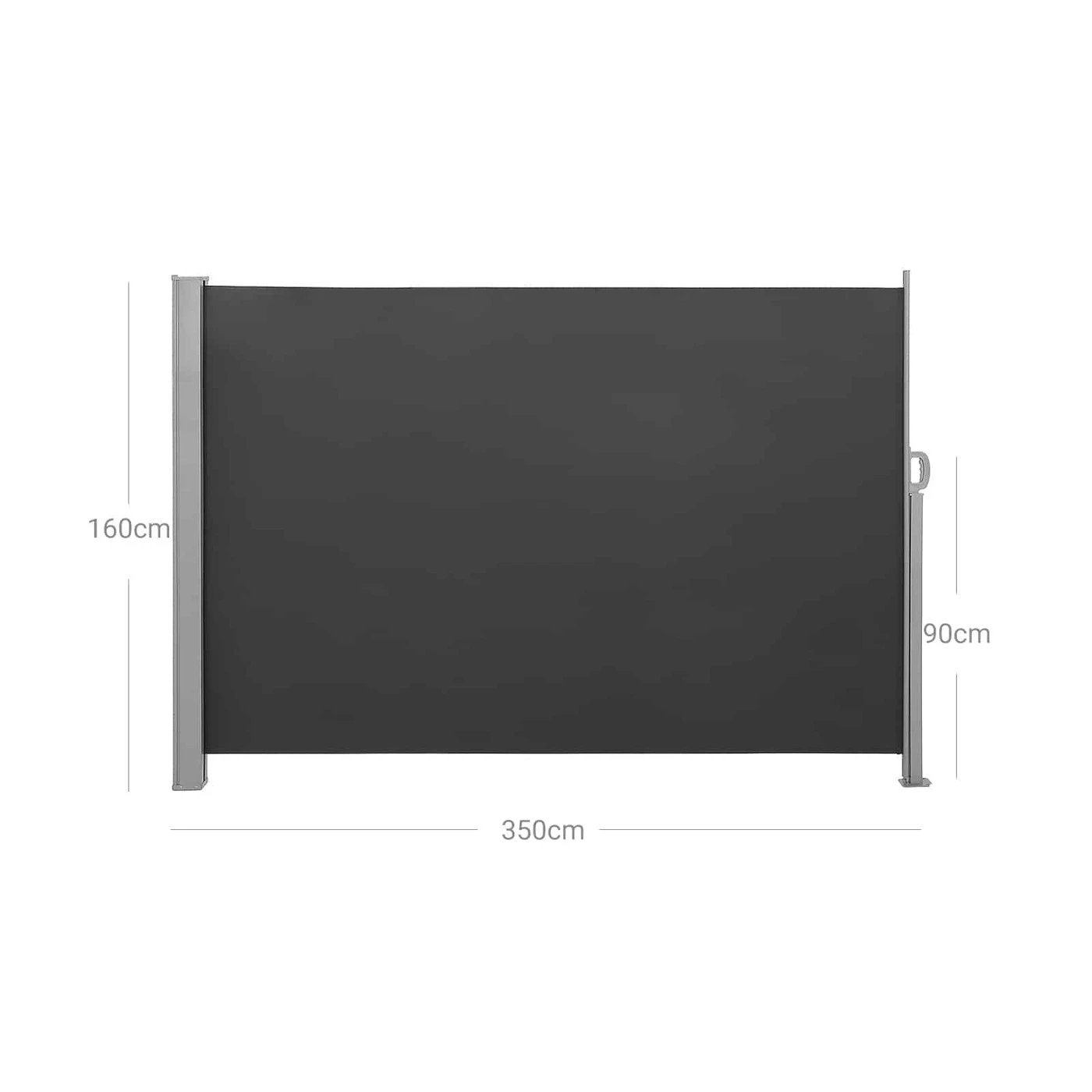 Aprašymas buvo automatiškai išverstas, gali pasitaikyti klaidų.Ši SONGMICS šoninė markizė yra puikus jūsų partneris, kai norite apsisaugoti nuo saulės spindulių ir smalsių kaimynų akių. Įvairūs panaudojimai Šį visapusį talentą galite panaudoti tiek viduje, pavyzdžiui, atviro plano biuruose, medicinos kabinetuose, persirengimo kambariuose ar fotostudijose, tiek lauke, pavyzdžiui, terasoje, sode, šalia baseino ar ant stovyklavietėje. Pridedamas pagrindo flanšas ir apsauginis dangtelis. Pristatymo komplektacijoje yra pagrindo flanšas, skirtas šoniniam stulpui pritvirtinti. Kad būtumėte saugesni, kai nenaudojate markizės, uždenkite laikymo įtaisą pridedamu apsauginiu dangteliu. Flanšo beveik nebesimato. Aukščiausios kokybės geležinė markizės dėžė Milteliniu būdu dengta geležinė tentų dėžutė yra atspari rūdijimui ir korozijai. Dėžutė taip pat visiškai apsaugo markizės audinį nuo UV spindulių, lietaus ir dulkių, todėl pailgėja tarnavimo laikas.Išsami informacija apie gaminį: - Spalva: antracitas - Medžiaga: milteliniu būdu dengta geležis (markizės dėžutė / šoninis stulpas), 220 g/m² PVC dengtas poliesteris (markizės audinys) - Dydis: 160 x 350 cm (A x L) - Svoris: 6,8 kg Pristatymo apimtis: - 1 x šoninis tentas - 1 x priedų paketas - 1 x rankinis (DE,EN,IT,ES,FR) SONGMICS Pastabos:- Šis gaminys skirtas naudoti tik saulėtomis ar silpnai vėjuotomis dienomis. Pučiant stipriam vėjui ar audrai, nedelsdami įtraukite tentą, kad nepažeistumėte. - Šį gaminį valykite tik vandeniu, drėgna šluoste arba neutralia plovimo priemone.