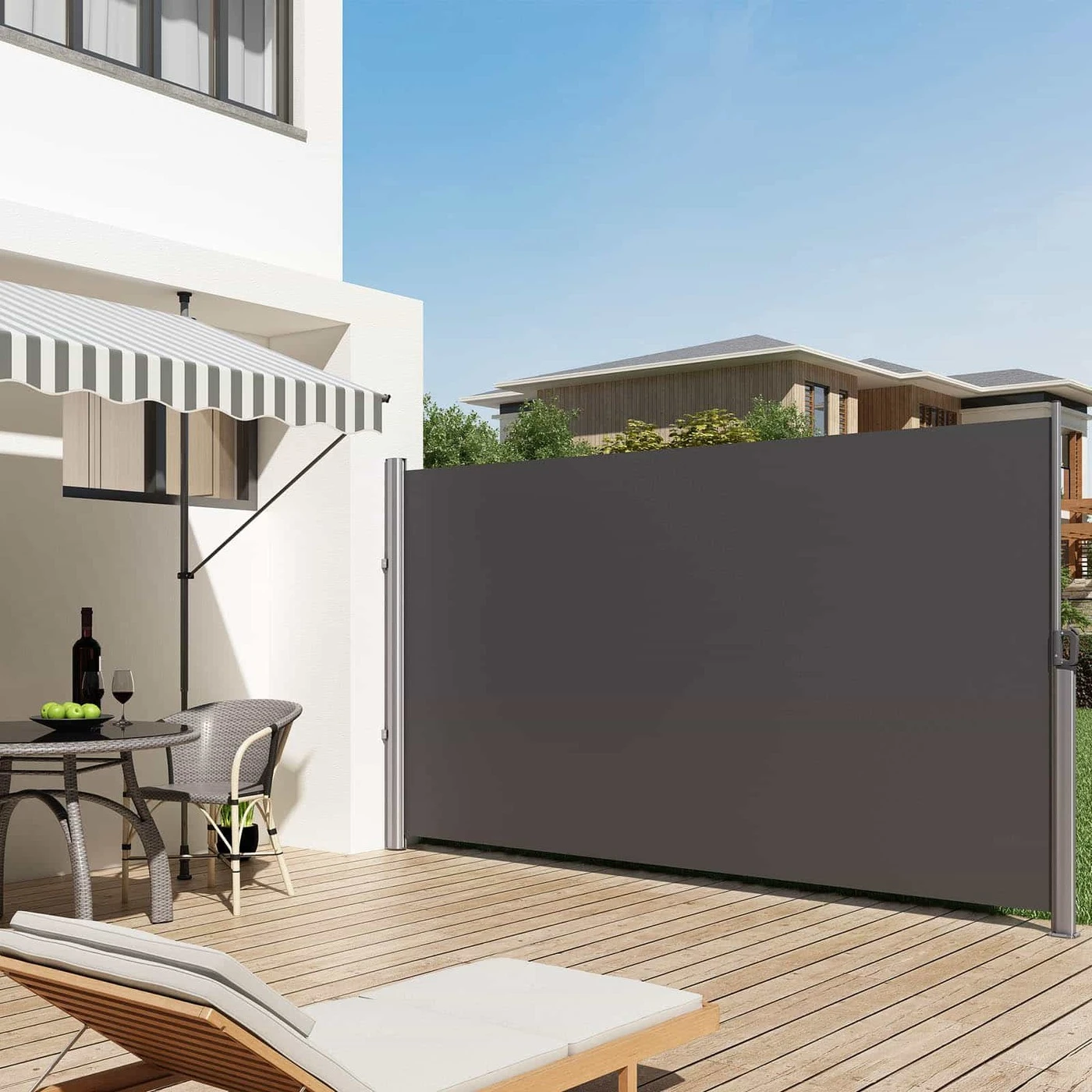 Aprašymas buvo automatiškai išverstas, gali pasitaikyti klaidų.Elegantiškas privatumo ekranas terasoje ir balkone Mėgaukitės pusryčiais ar priešpiečiais be smalsių kaimynų akių. Vasarą pasinaudokite vėsinančiu šešėliu ir apsauga nuo vėjo ir mėgaukitės vasaros temperatūra, kad atsipalaiduotumėte savo terasoje ar balkone. Lankstus šoninis tentas skirtas lauke ir viduje. Tereikia stabilios sienelės, prie kurios būtų galima pritvirtinti šoninę žaliuzę. Su grindų kronšteinu markizės stulpas taip pat gali būti lengvai vėl nuimamas, kad ant grindų būtų tik žemas, mažas laikiklis, kuris nėra ypač pastebimas. Lengvas surinkimas ir valdymas Dėl pridedamų surinkimo instrukcijų surinkimas yra greitas ir lengvas. Sumontavus šoninę markizę lengva naudoti ir taip pat greitai vėl susukti, kai jos nebereikia. Susukite markizę pučiant stipriam vėjui, smarkiai lyjant ar sningant, kad galėtumėte ilgai mėgautis privatumo ekranu.Išsami informacija apie gaminį: - markizės dėžė: aliuminis - tento audinys: poliesteris (280 g/m²) + vandeniui atspari PU danga Pristatymo komplektas: - 1 x šoninis tentas - 1 x grindų laikiklis - 1 x rankinis (DE, EN, FR, IT, ES)