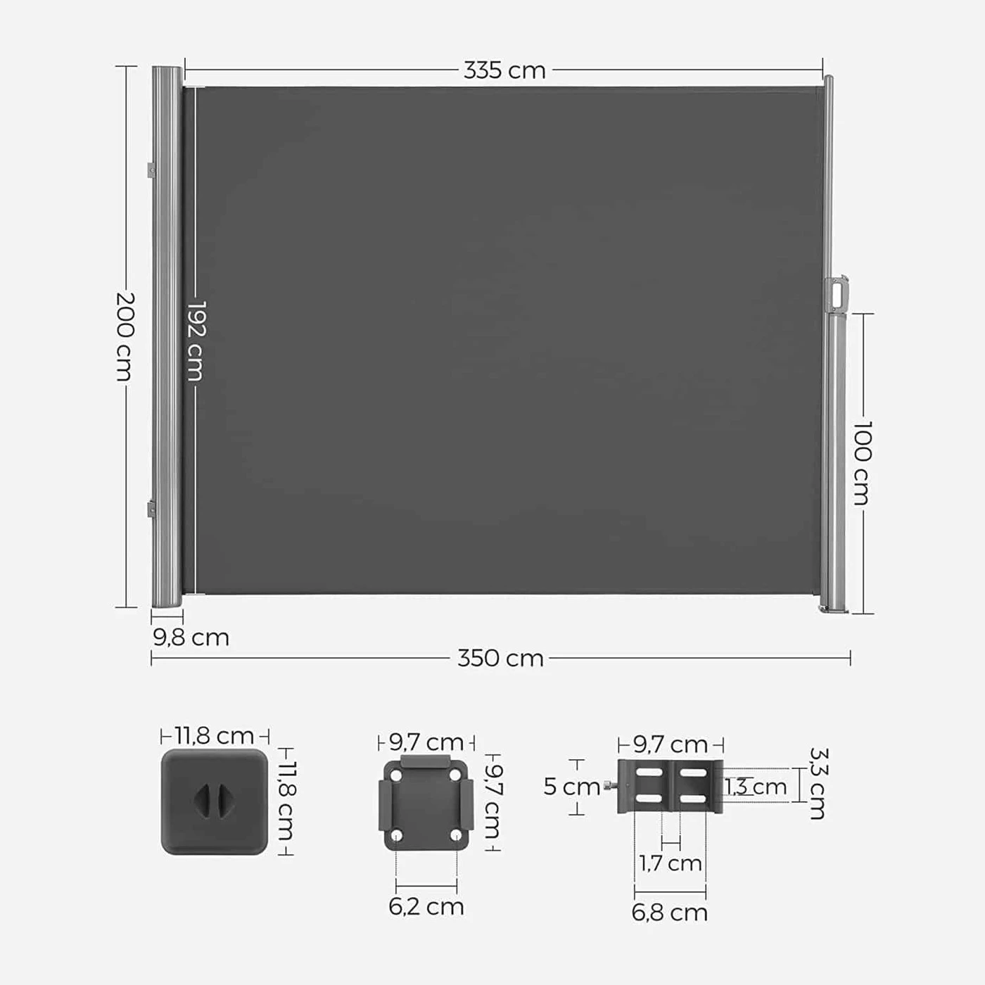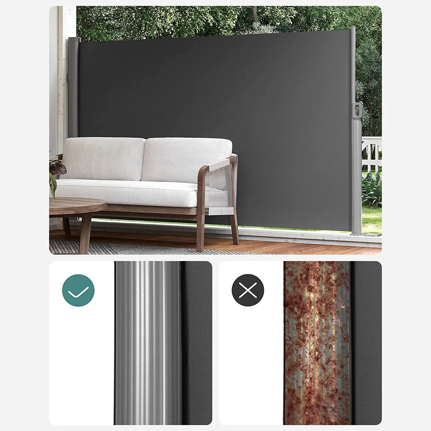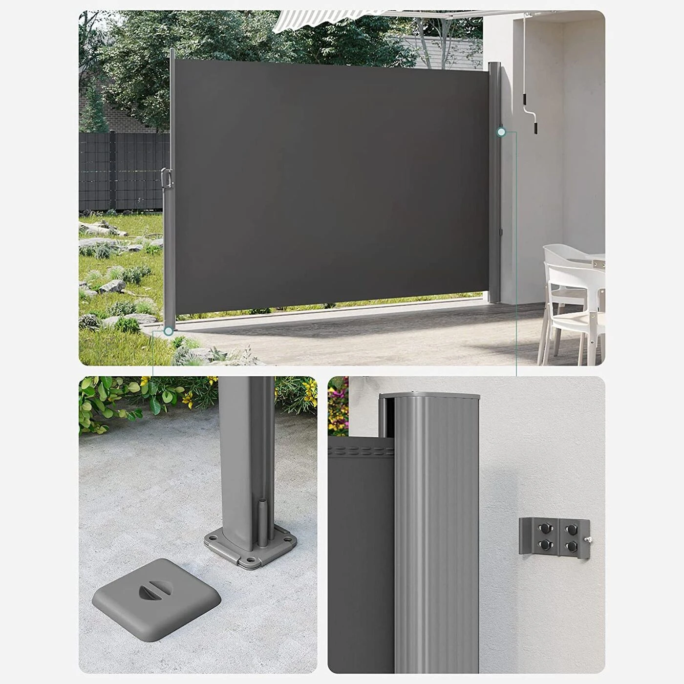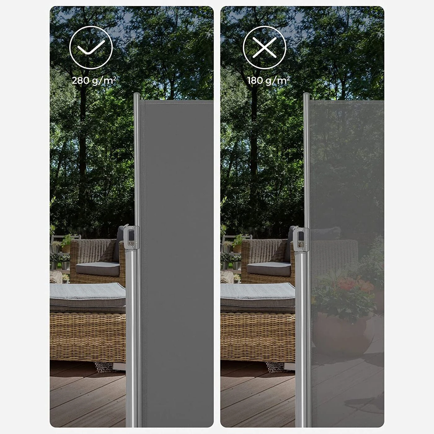 Aprašymas buvo automatiškai išverstas, gali pasitaikyti klaidų.Skoninga privatumo apsauga balkonams ir terasoms Su šonine markize SONGMICS galėsite mėgautis pusryčiais ar priešpiečiais be smalsių kaimynų akių. Be to, tentas suteikia vėsinantį šešėlį vasarą ir taip pat apsaugo nuo vėjo. Mėgaukitės vasaros temperatūra iki galo ir atsipalaiduokite savo terasoje arba balkone.Dėl lengvai suprantamų surinkimo instrukcijų šoninę markizę galima greitai ir lengvai nustatyti. Surinktą jį galima lengvai naudoti, o panaudojus taip pat greitai vėl susukti. Pastarasis ypač rekomenduojamas pučiant stipriam vėjui, stipriam lietui ar sningant, kad galėtumėte ilgai mėgautis privatumo ekranu.Išsami informacija apie gaminį: - markizės dėžė: aliuminis - tento audinys: poliesteris (280 g/m²) + vandeniui atspari PU danga Pristatymo komplektas: - 1 x šoninis tentas - 1 x grindų laikiklis - 1 x instrukcijos (DE, EN, FR, IT, ES)