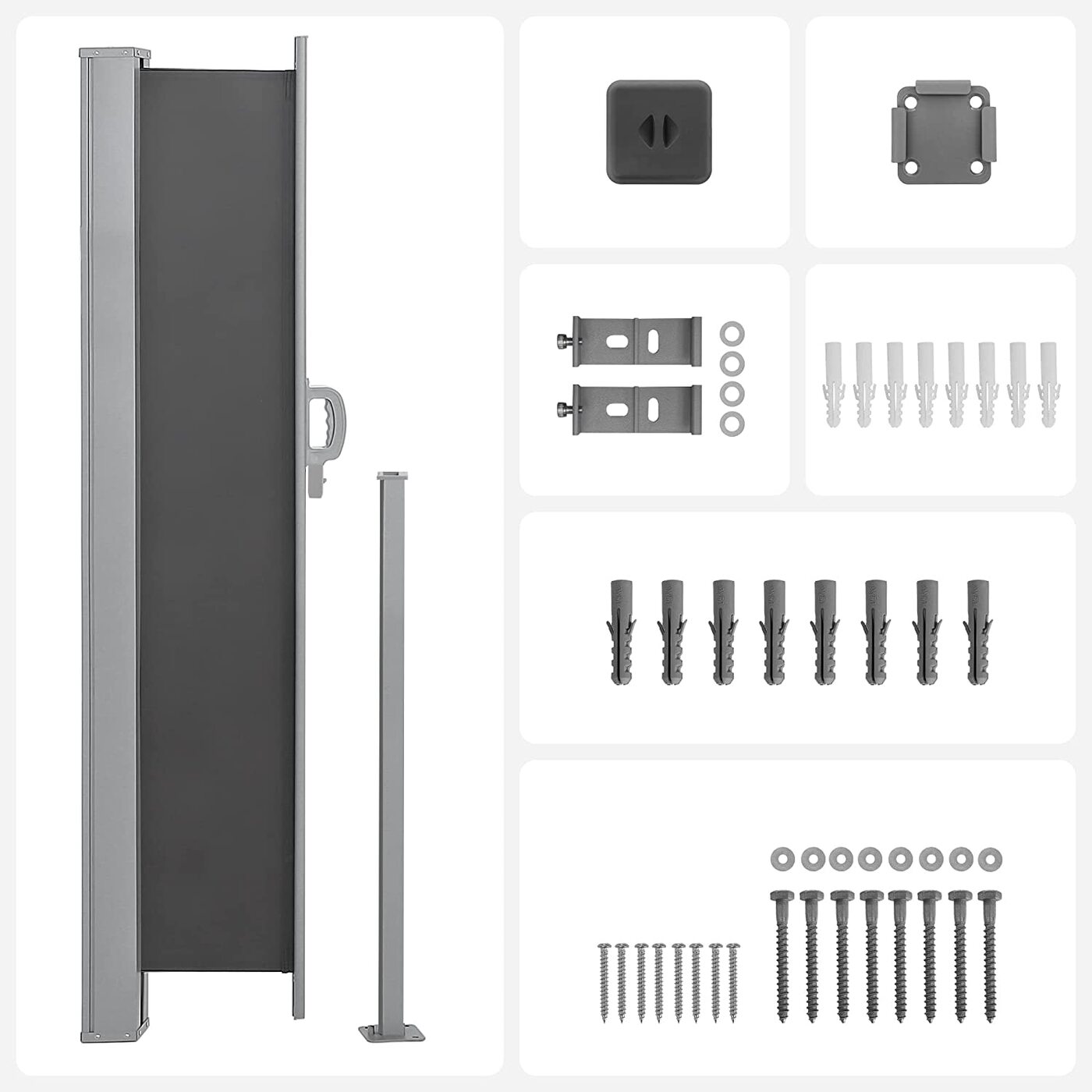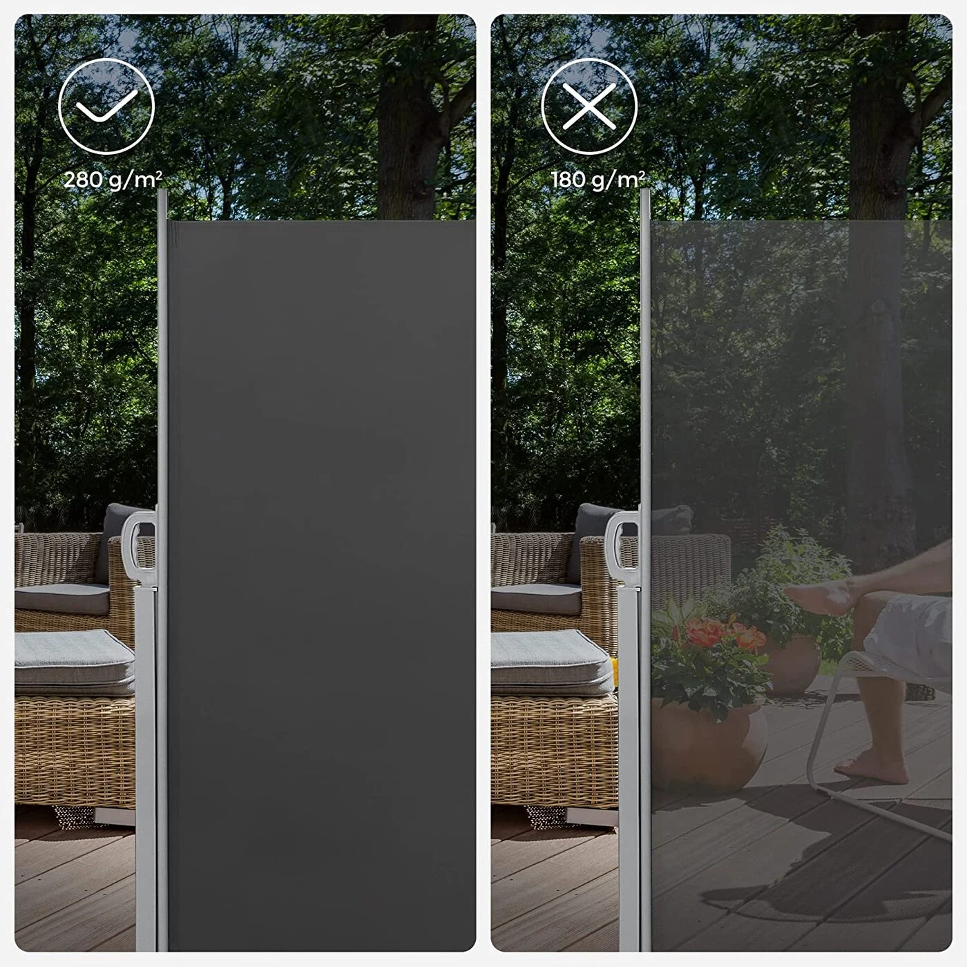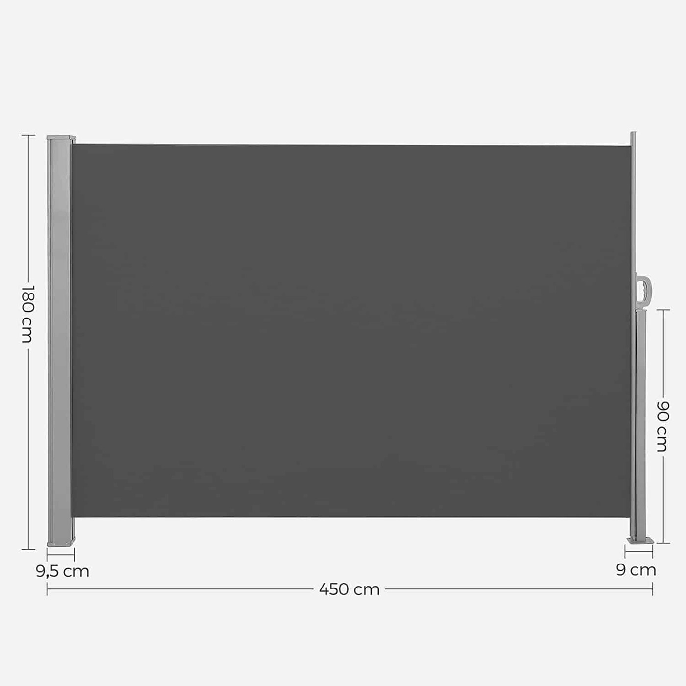 Aprašymas buvo automatiškai išverstas, gali pasitaikyti klaidų.Ši šoninė markizė iš SONGMICS yra puikus jūsų partneris, jei norite apsisaugoti nuo saulės spindulių ir smalsių kaimynų akių. Įvairūs panaudojimo būdai Šį visapusį talentą galite panaudoti tiek patalpose, kaip atviro plano biuruose, medicinos įstaigose , persirengimo kambariuose ar fotostudijose ir lauke, pvz., terasoje , sode, šalia baseino ar stovyklavietėje Pridedamas įžeminimo laikiklis ir apsauginis dangtelis. . Kad būtumėte saugesni, kai nenaudojate markizės, uždenkite laikymo įtaisą pridedamu apsauginiu dangteliu. Laikiklio beveik nematyti. Aukščiausios kokybės markizės dėžė iš metalo Markizės dėžutė, pagaminta iš milteliniu būdu dengto metalo, yra atspari rūdims ir korozijai. Dėžutė taip pat visiškai apsaugo markizės audinį nuo UV spindulių, lietaus ir dulkių, todėl pailgėja tarnavimo laikas.Išsami informacija apie gaminį: - Spalva: antracitas - Medžiaga: milteliniu būdu dengtas metalas (markizės dėžutė / šoninis stulpas), geležis (drobinis kotas), 220 g/m² PVC dengtas poliesteris (markizės audinys) - Dydis: 180 x 450 cm (A x L) - Svoris: 8. 7 kg Pristatymo apimtis: - 1 x šoninė markizė - 1 x priedų pakuotė - 1 x instrukcija SONGMICS Pastabos: - Šis gaminys buvo skirtas naudoti tik saulėtomis arba silpnai vėjuotomis dienomis. Pučiant stipriam vėjui ar audrai, nedelsdami įtraukite tentą, kad nepažeistumėte. - Šį gaminį valykite tik vandeniu, drėgna šluoste arba neutralia plovimo priemone.