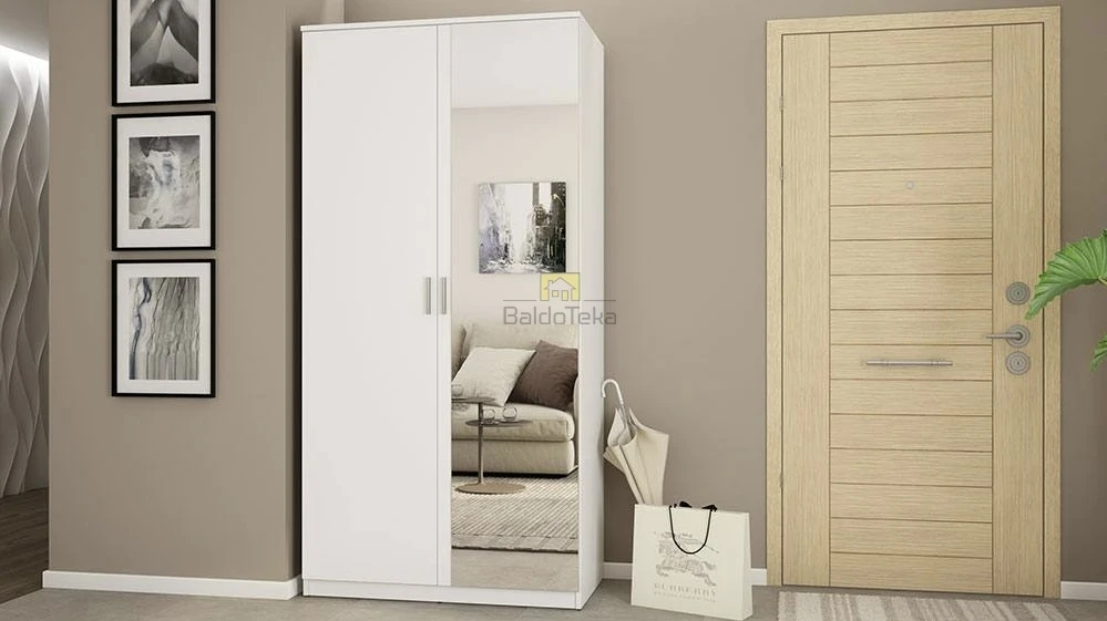 Moderni balta spinta su matiniu apdailos efektuPlati ir erdvi spinta – 100 cm plotis, 200 cm aukštisKokybiška LMDP spinta – 18 mm storis, balta matinė spalva