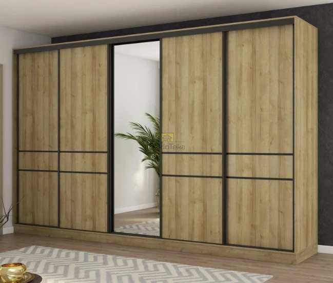 Moderni ąžuolo spalvos spinta su stilingais rėmeliaisDidelė 360 cm spinta su ąžuolo ir juodos spalvos detalėmisPraktiška 18 mm LMDP spinta su ąžuolo Riva spalva