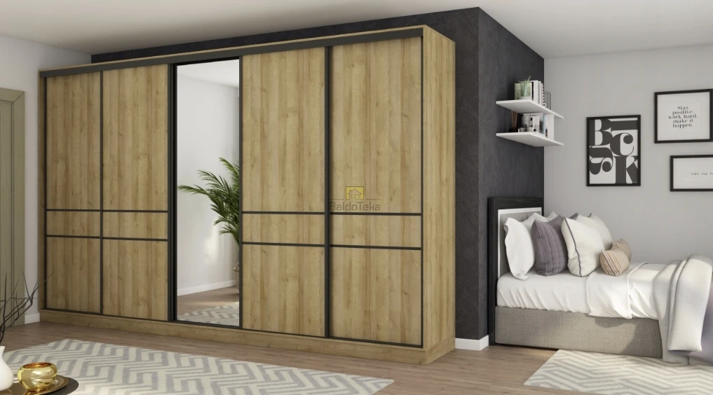 Erdvus ąžuolo spalvos spinta su juodais rėmeliais