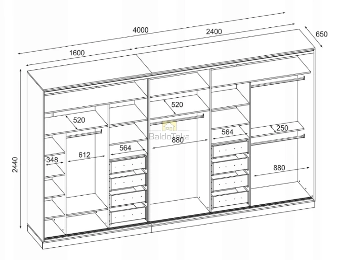 Plotis/Aukštis/Gylis: 360/244/64 cm.